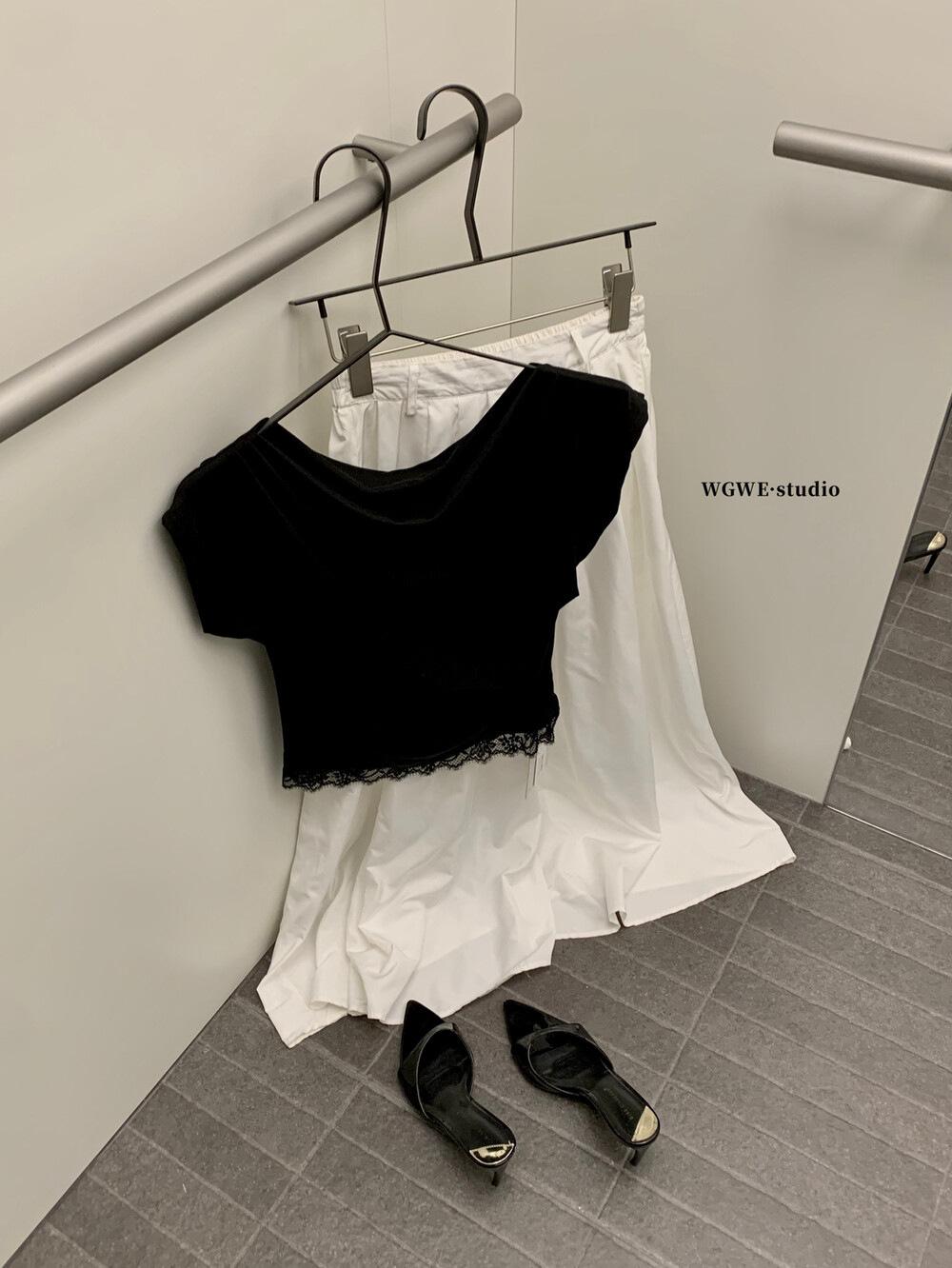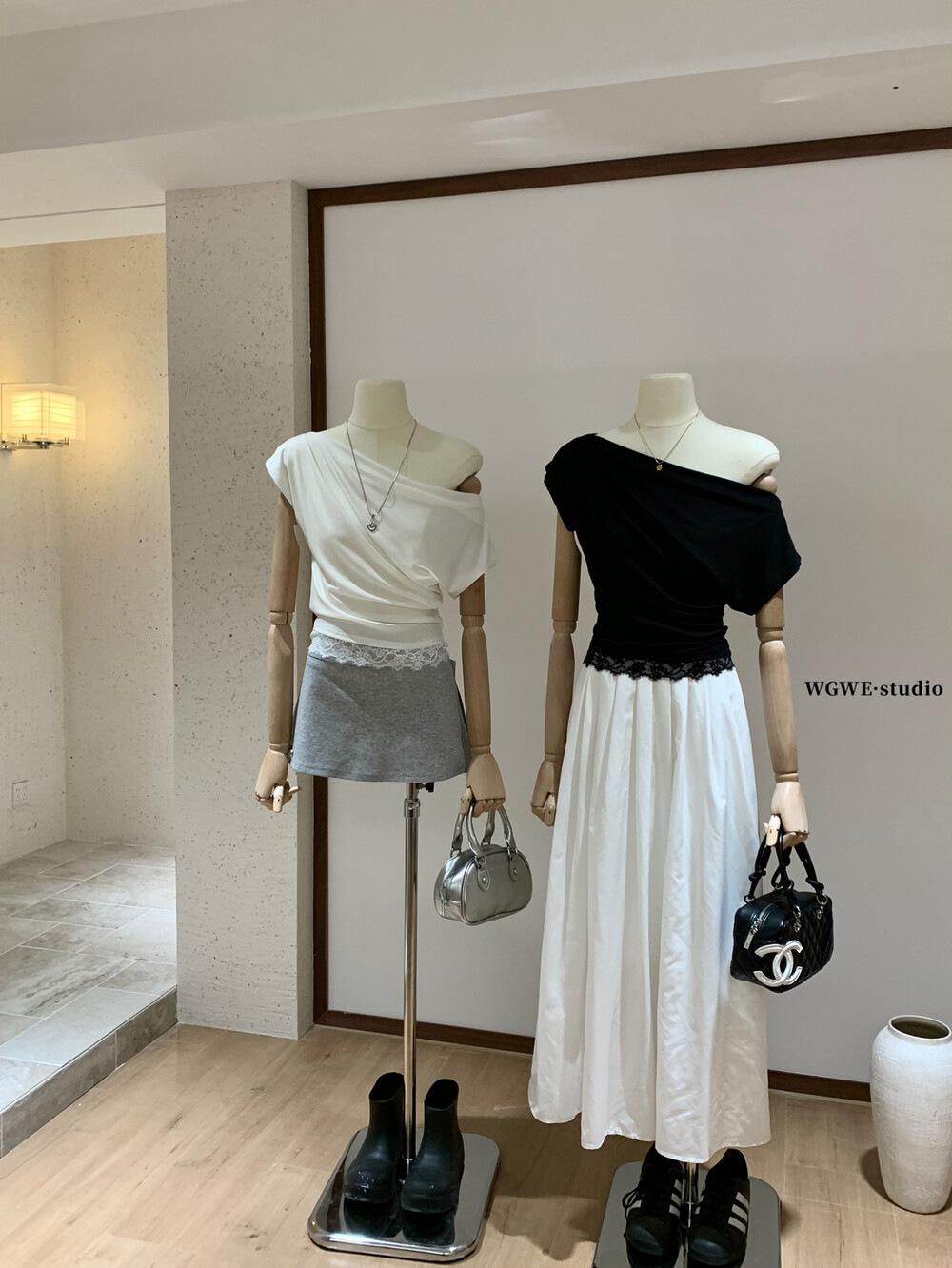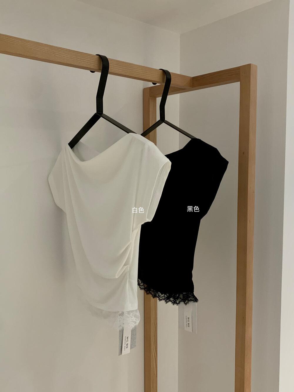 Liquidación sin devoluciones ni cambios Camiseta de moda pura y sexy para chica hot con encaje de retazos que adelgaza la cintura, de un hombro, sin mangas W6561