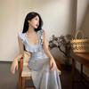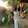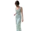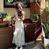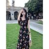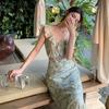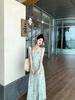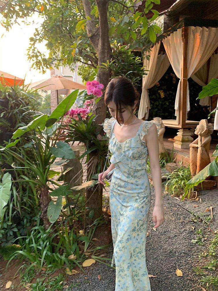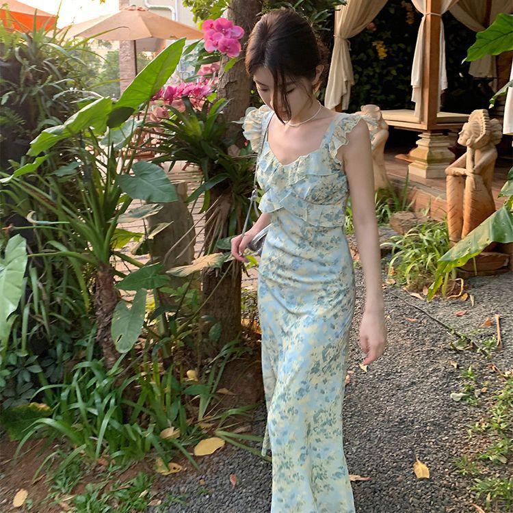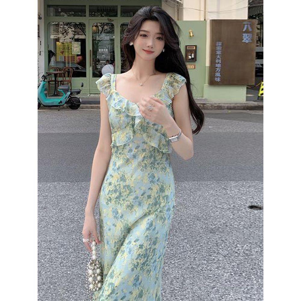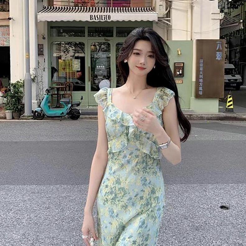 Vestido Floral Verde Estilo Francés de Manga Corta con Volantes, Nuevo Diseño de Verano con Volantes, Versátil Vestido Largo de Vacaciones