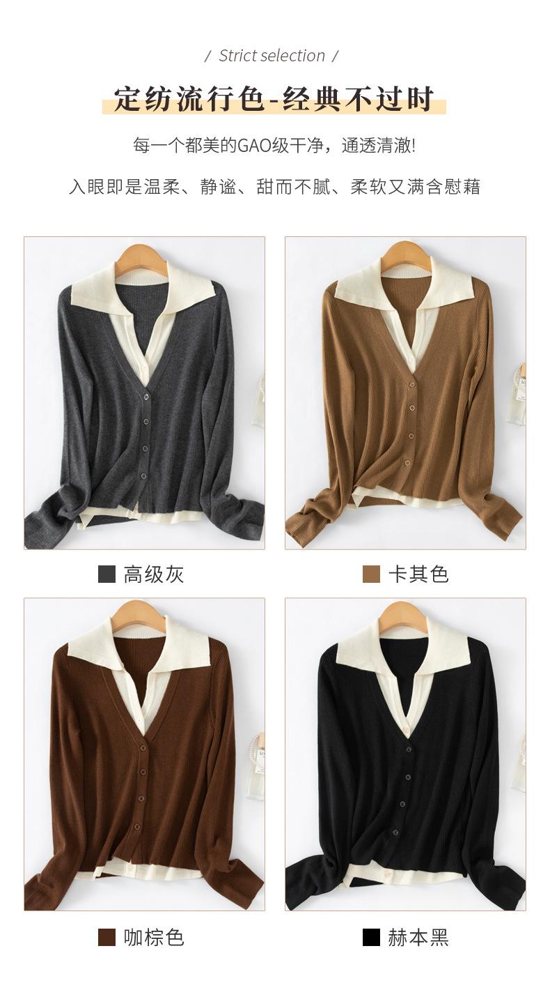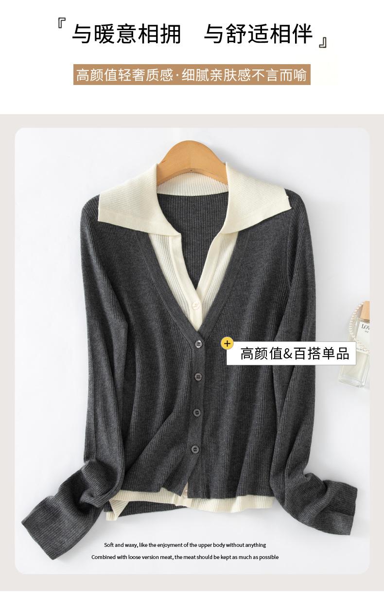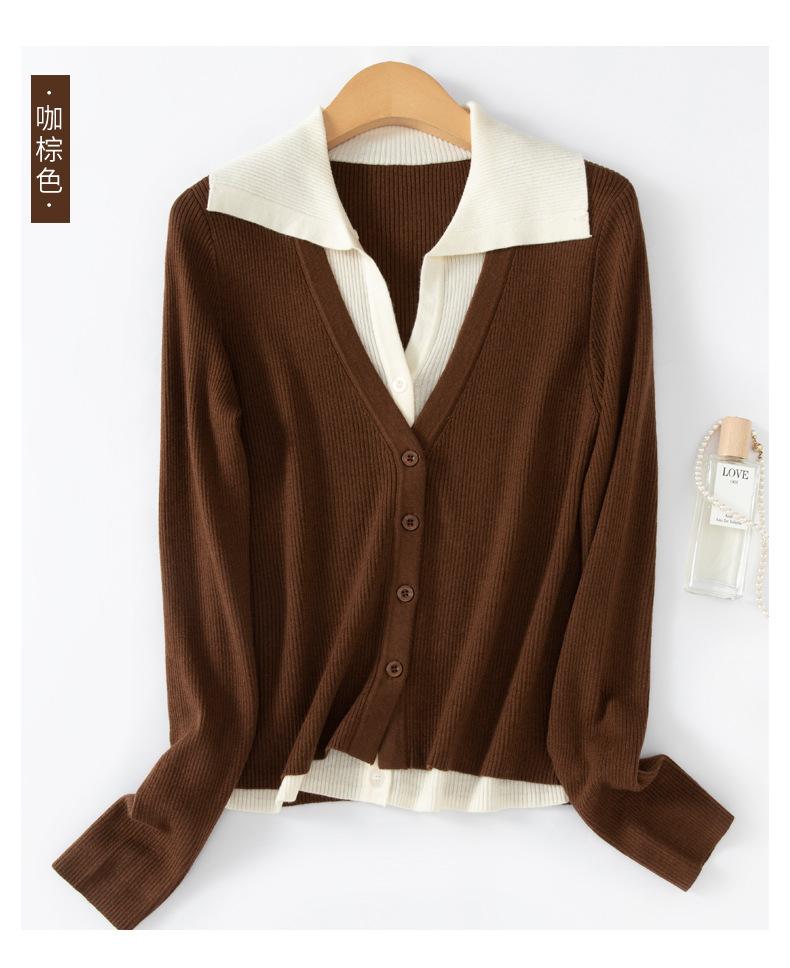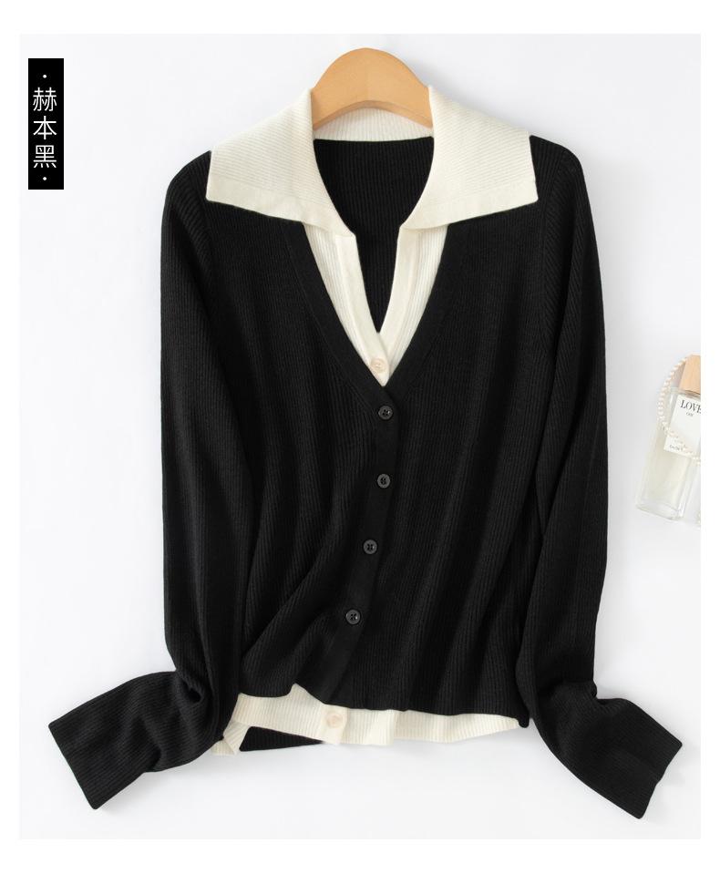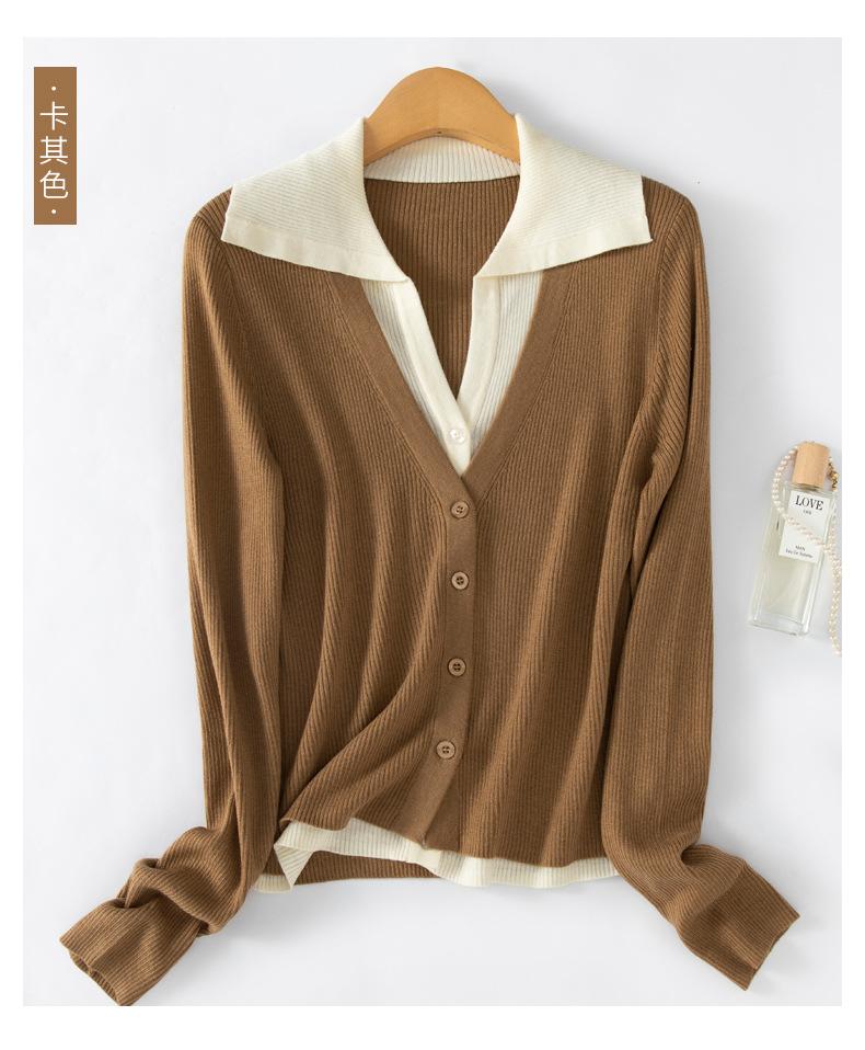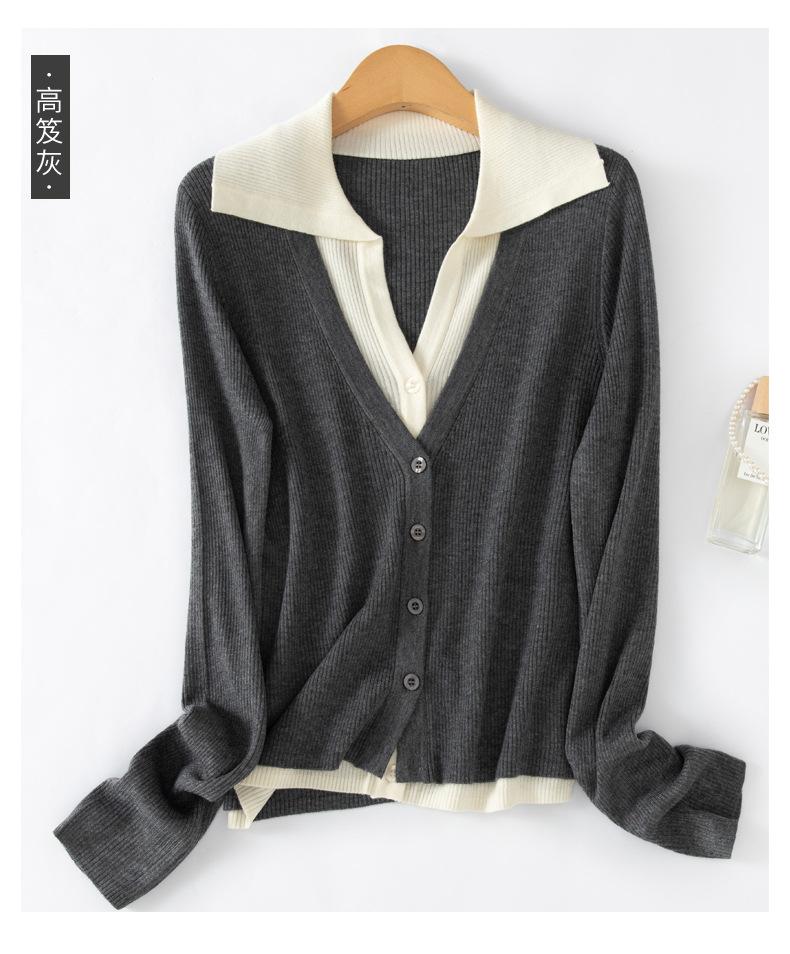 Cárdigan de punto de lana peinada nuevo de primavera y verano 2025 con solapa, manga larga, diseño con sentido del color a juego, top de mujer de dos piezas falsas