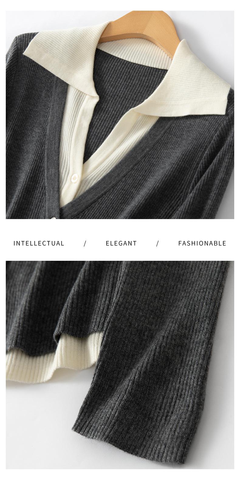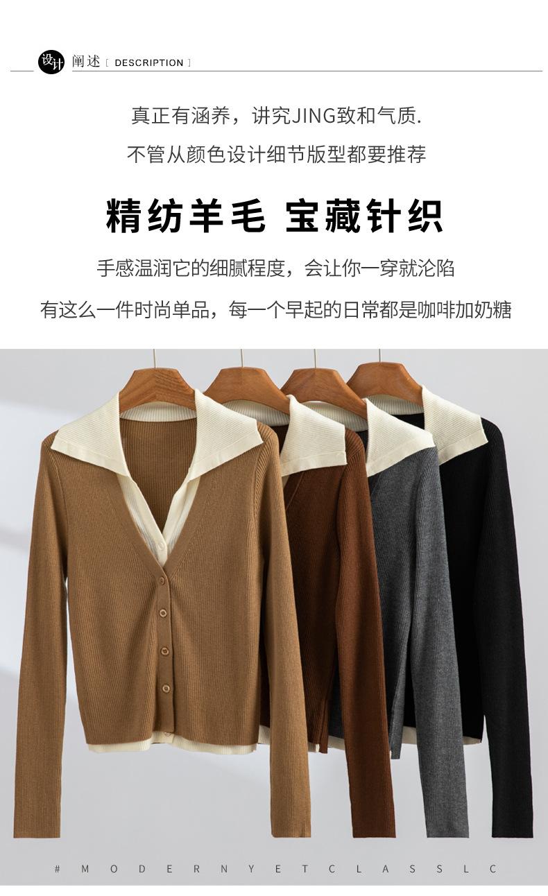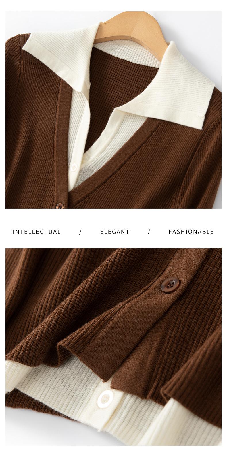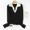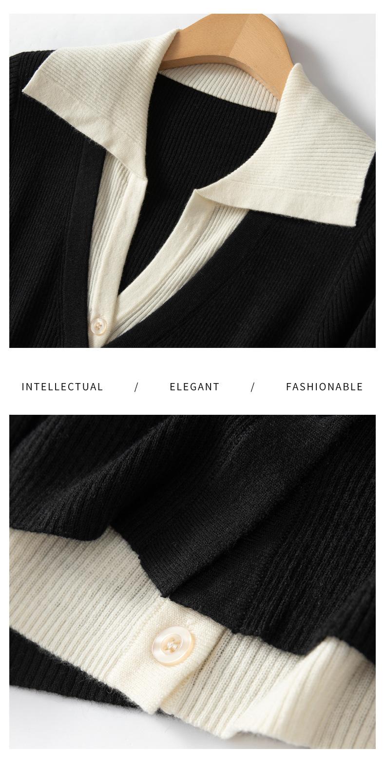 Cárdigan de punto de lana peinada nuevo de primavera y verano 2025 con solapa, manga larga, diseño con sentido del color a juego, top de mujer de dos piezas falsas
