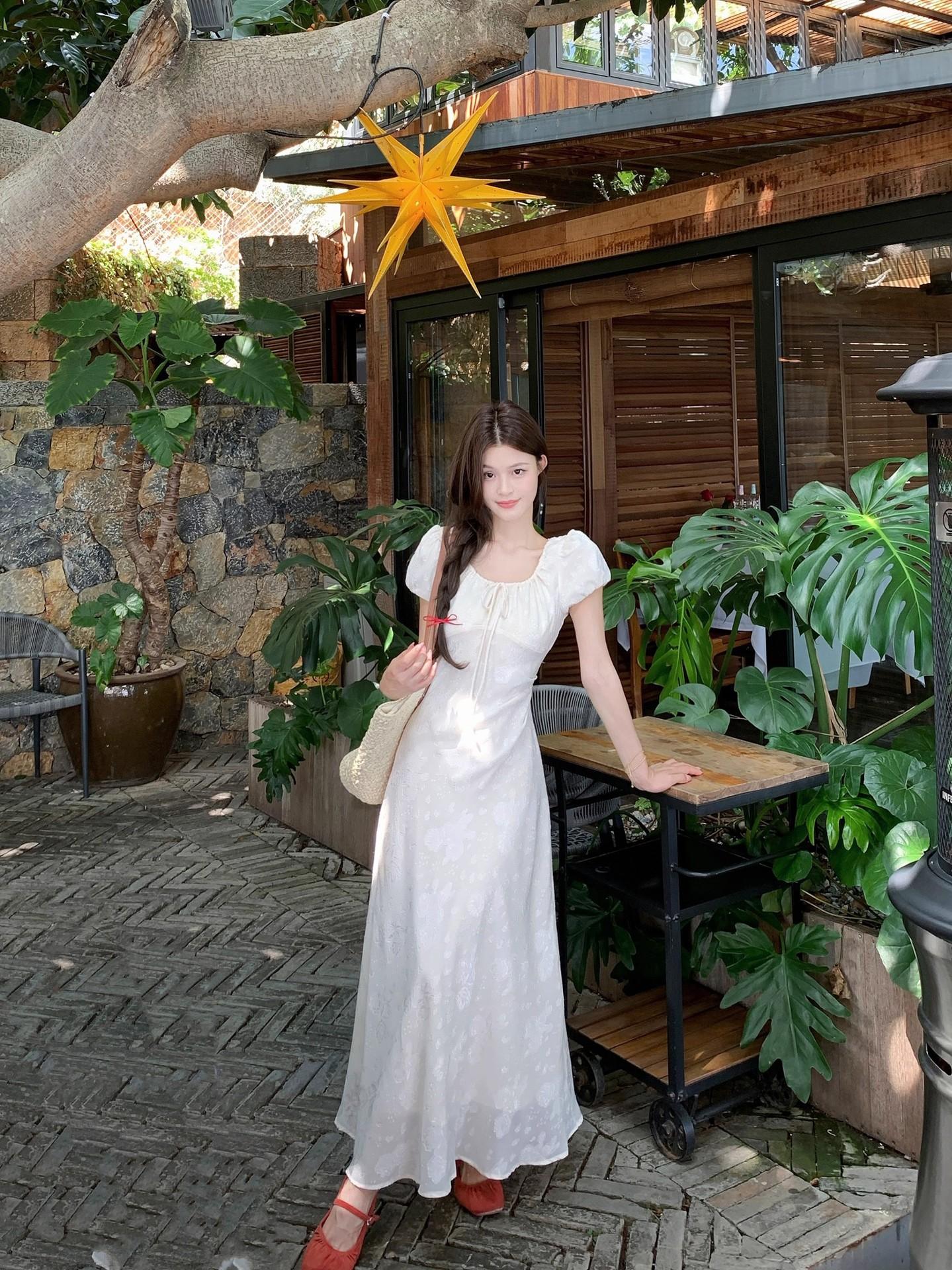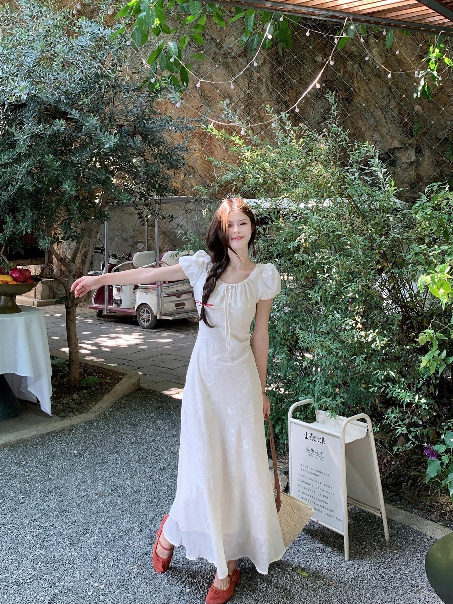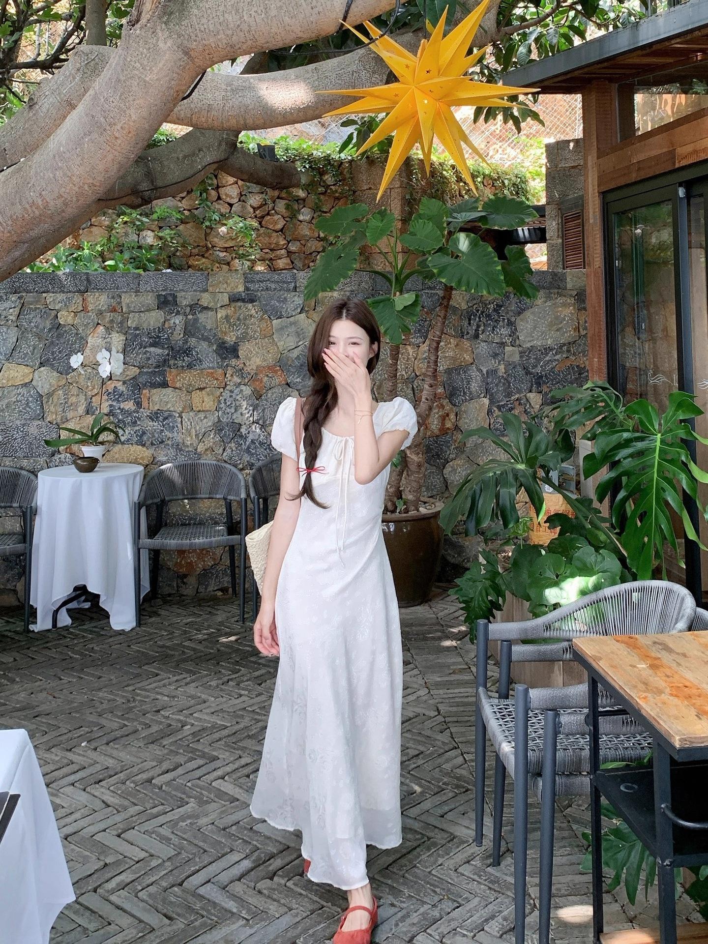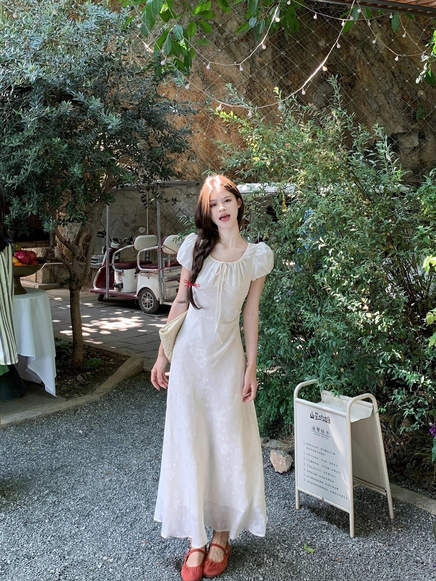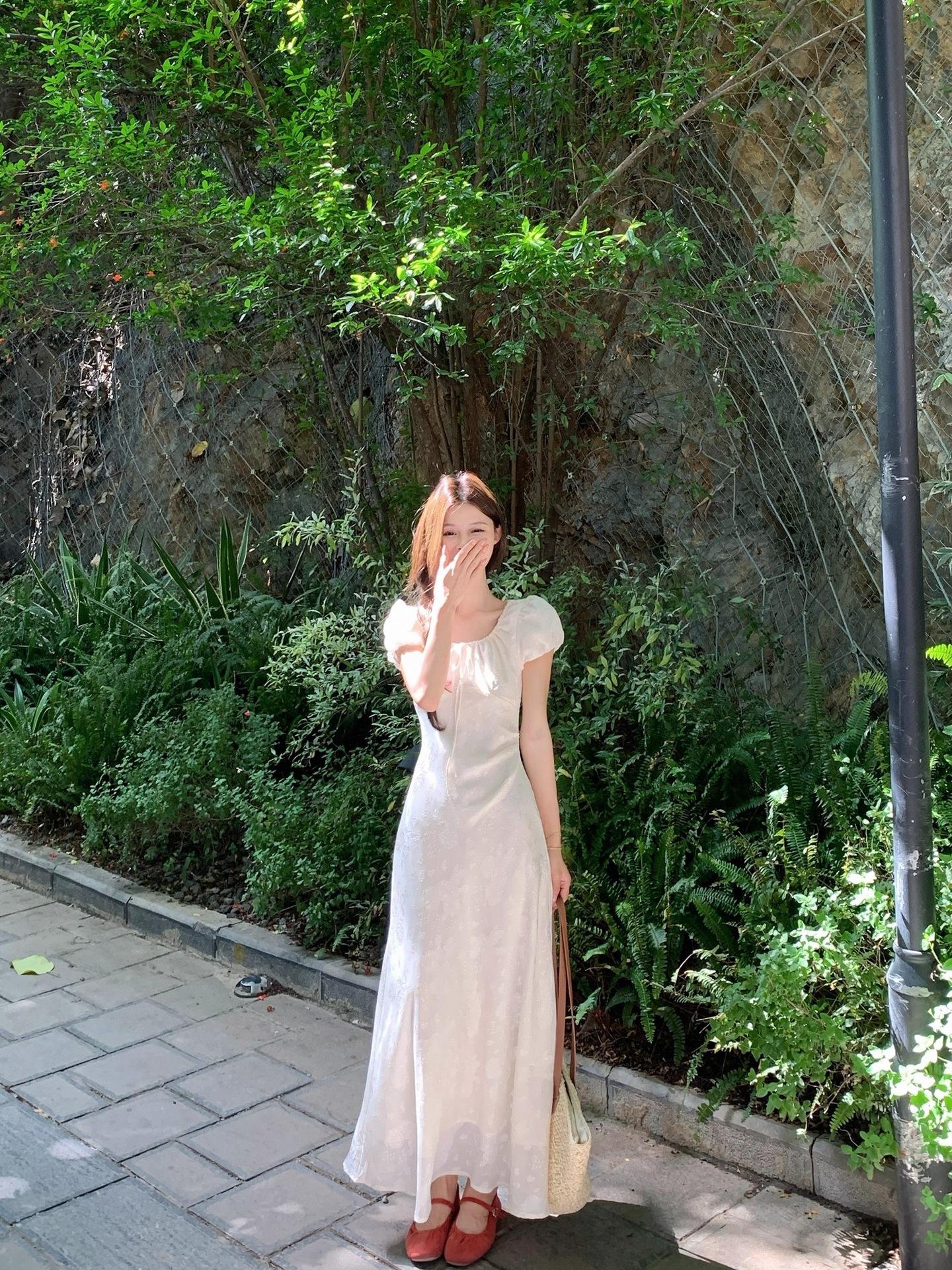 Vestido Largo de Verano Adelgazante Diseño de Temperamento de Alta Gama Suave Vestido Elegante Jacquard de Manga Corta Tendencia para Mujer
