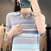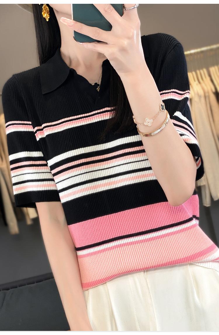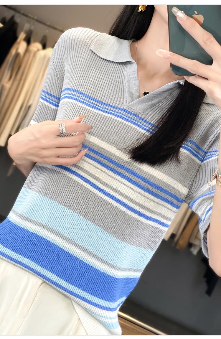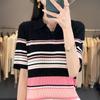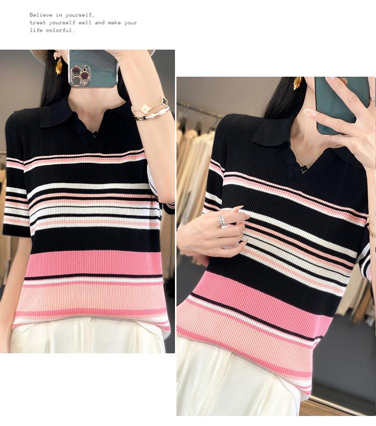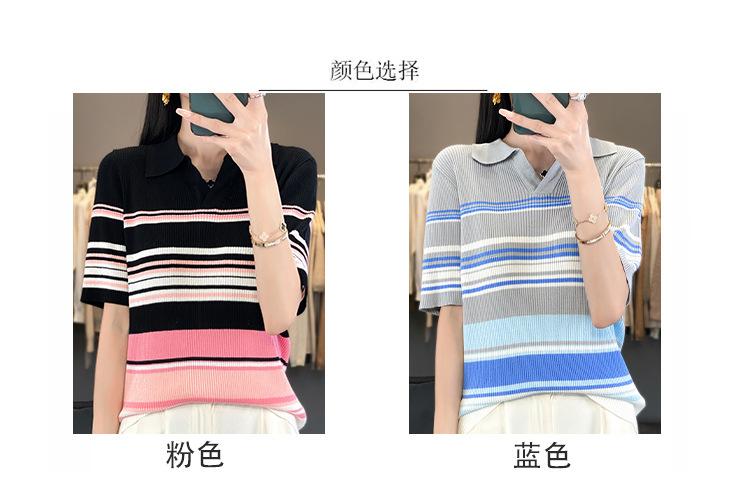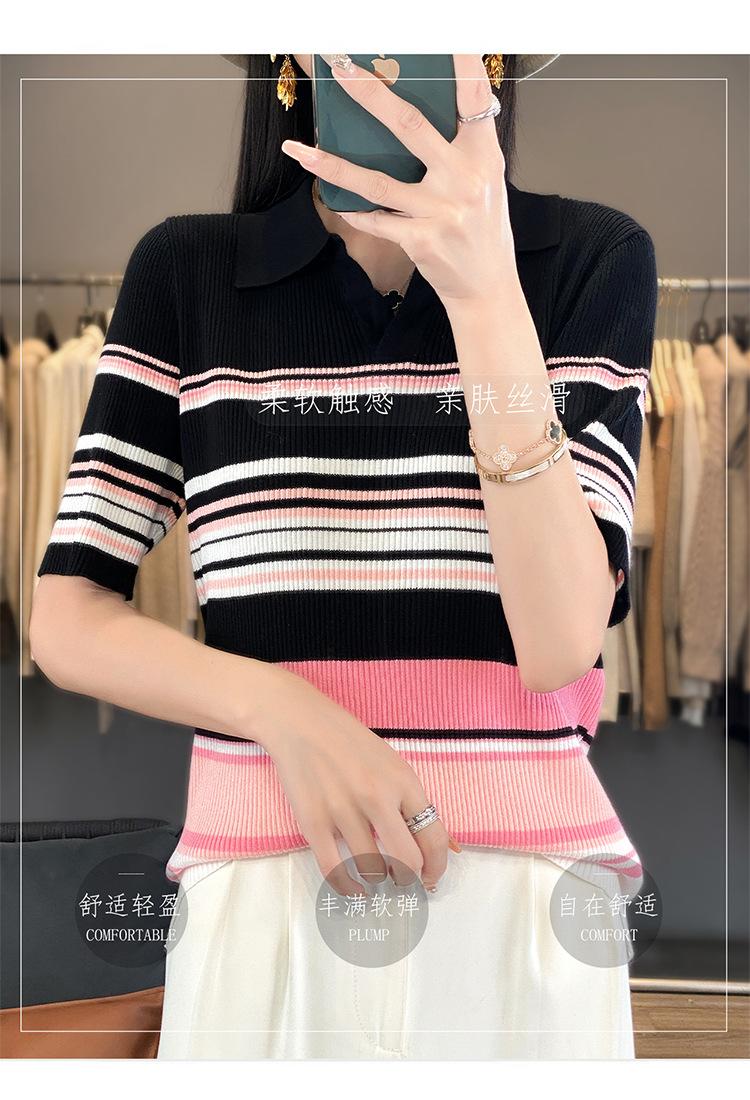 24 Verano Nuevo Seda de Hielo Camisa Tejida con Cuello POLO Camiseta de Manga Corta para Mujer Top Holgado Rayado Conline de Alta Gama