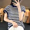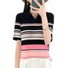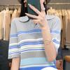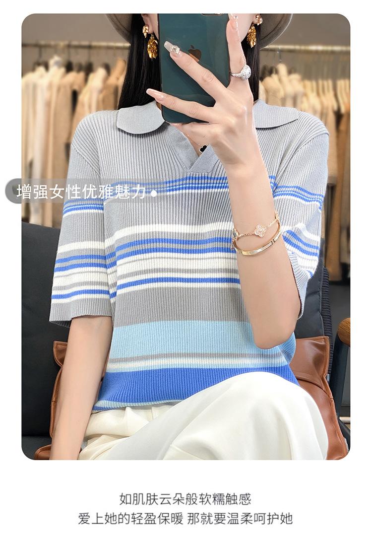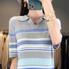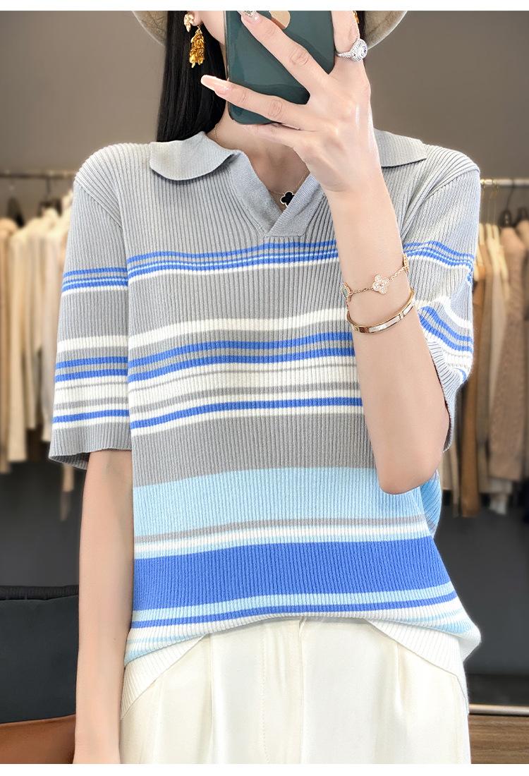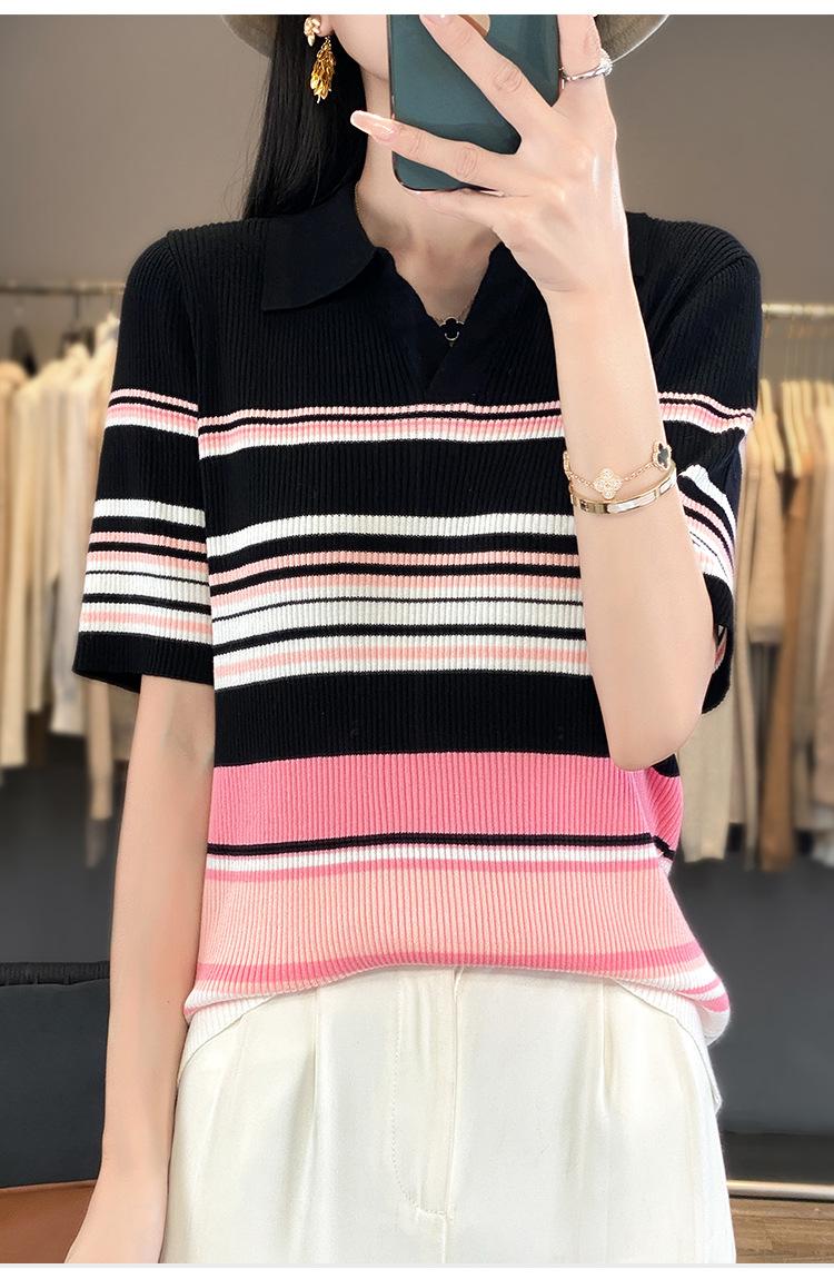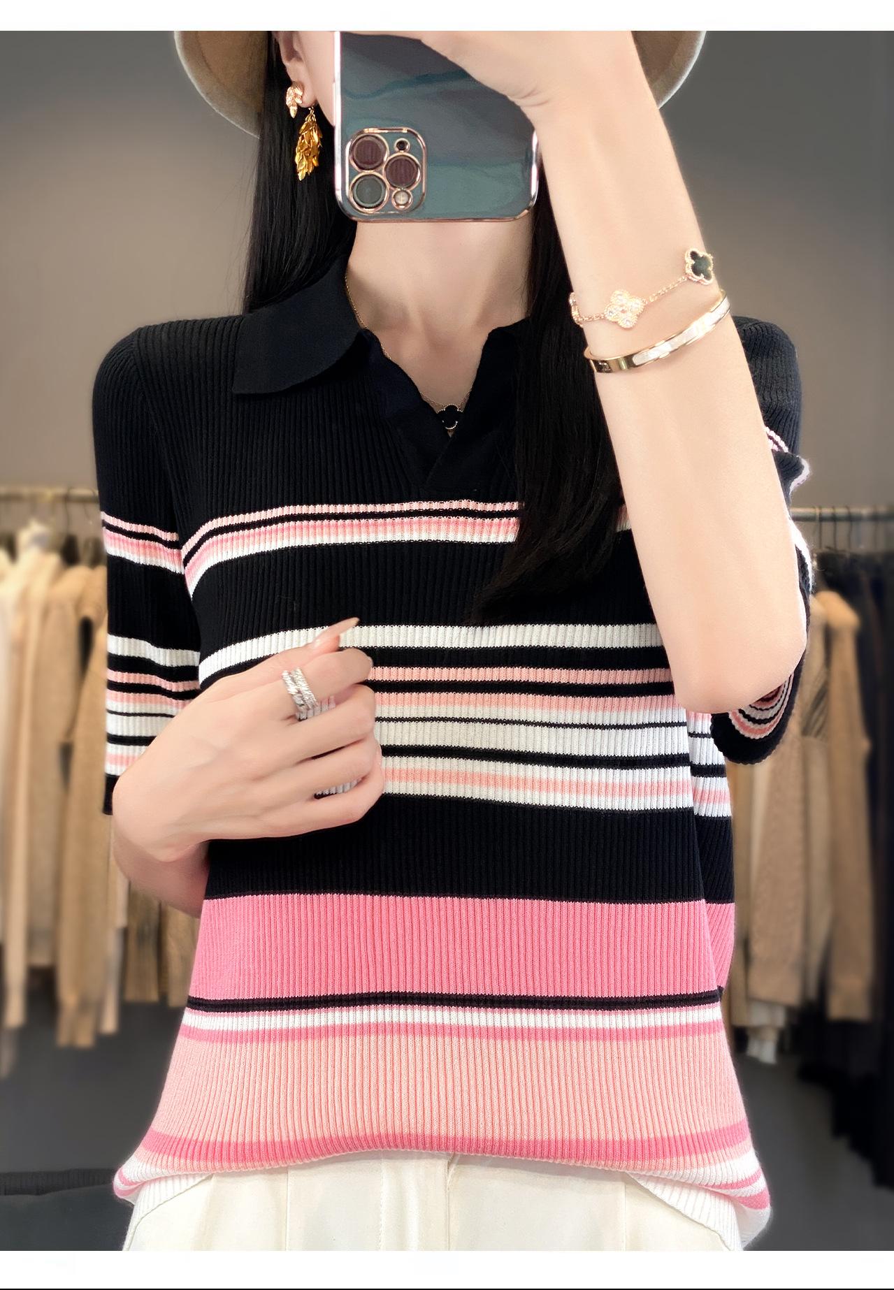 24 Verano Nuevo Seda de Hielo Camisa Tejida con Cuello POLO Camiseta de Manga Corta para Mujer Top Holgado Rayado Conline de Alta Gama