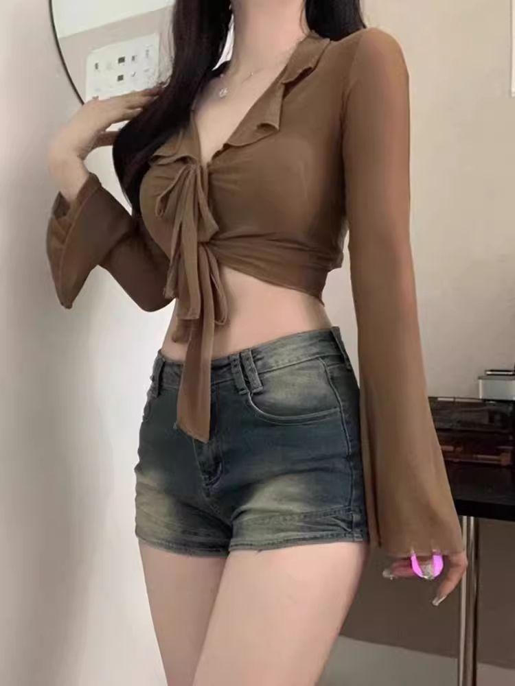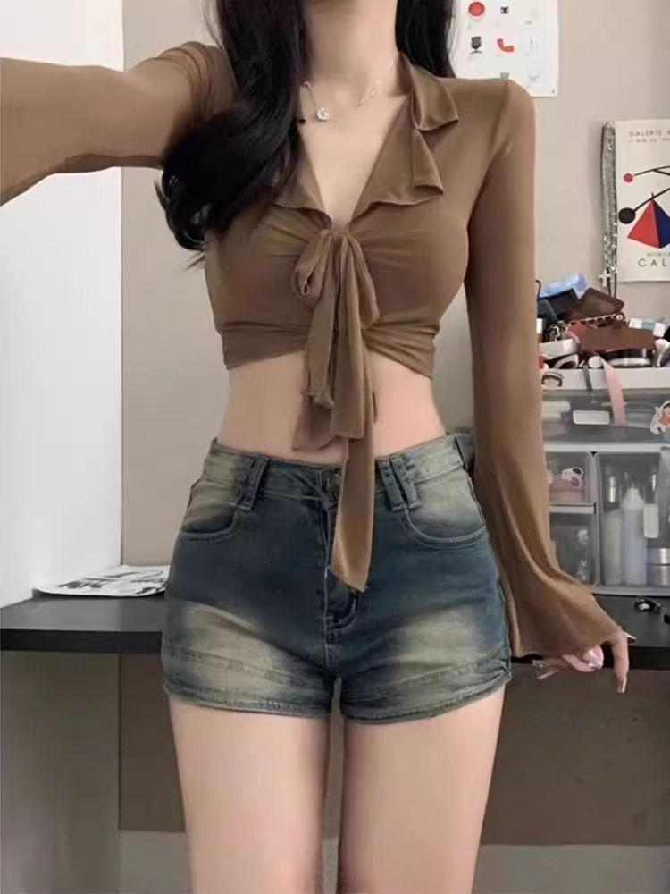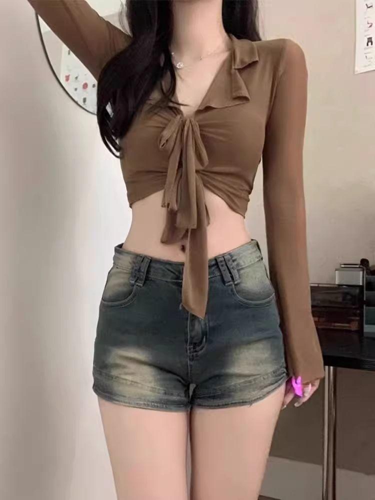Shorts de mezclilla retro de cintura alta para mujer 2025 Verano Nuevo Elástico Adelgazante Look Sexy Versátil Ajustado Ceñido a las caderas Pantalones cortos calientes