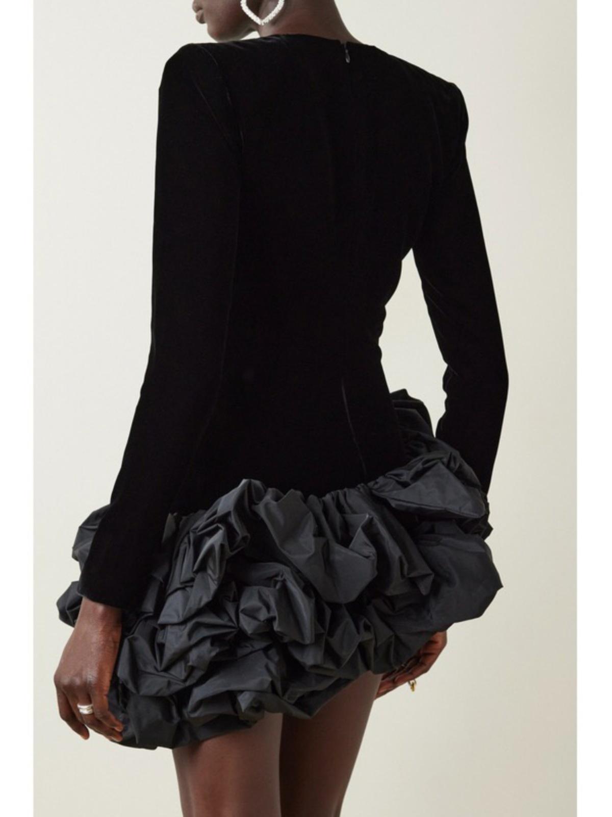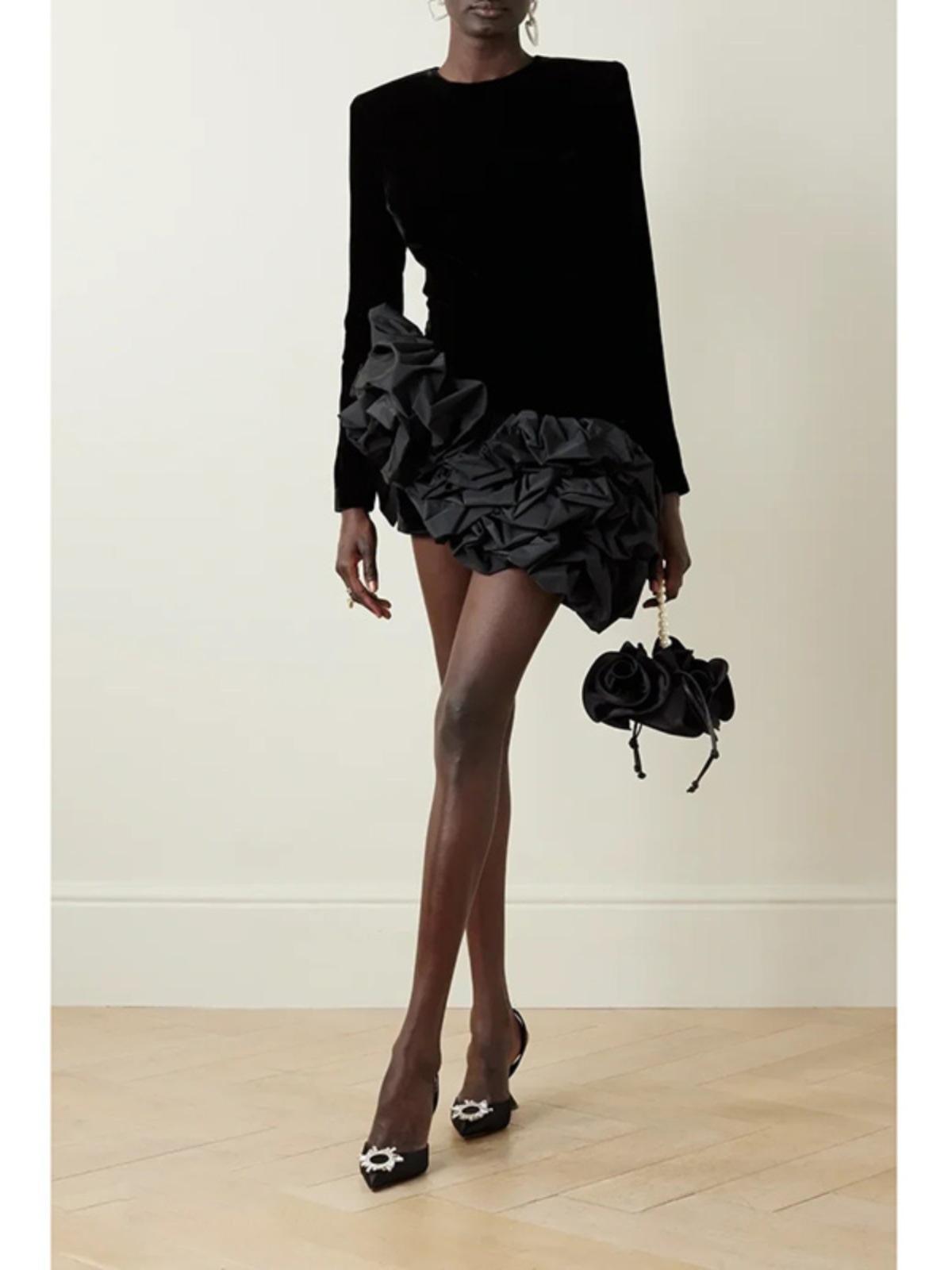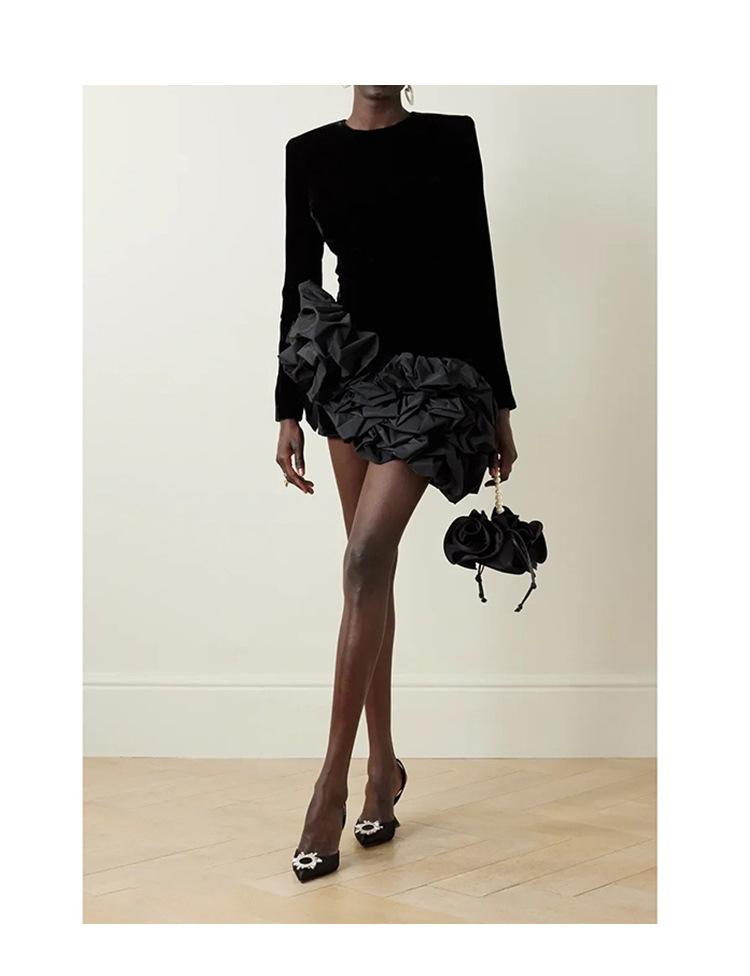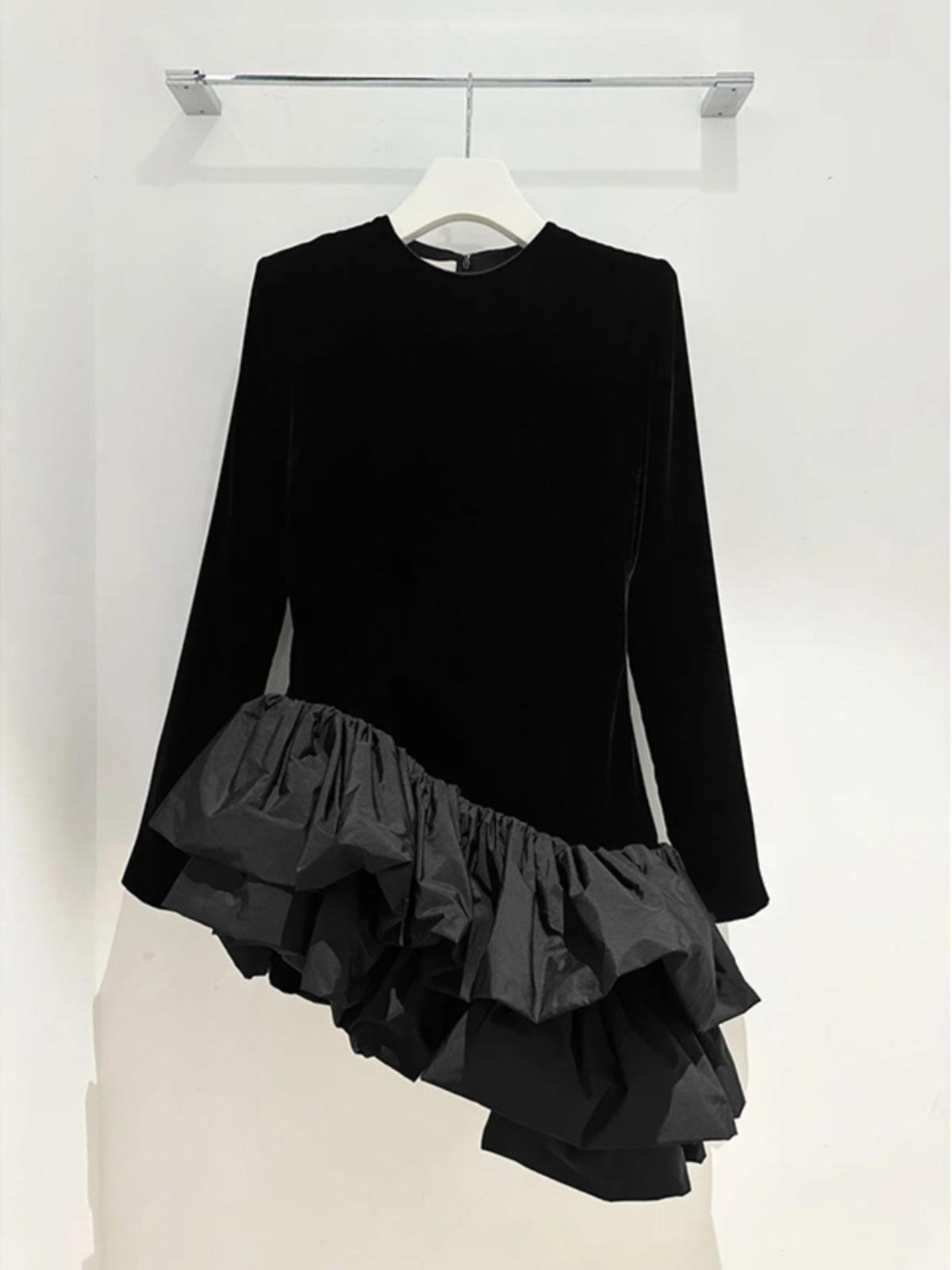 Vestido Hepburn Francés de Terciopelo con Parche de Hombro en Ángulo Recto, Volantes Laminados Irregulares, Vestido de Banquete de Hermana Real Corto