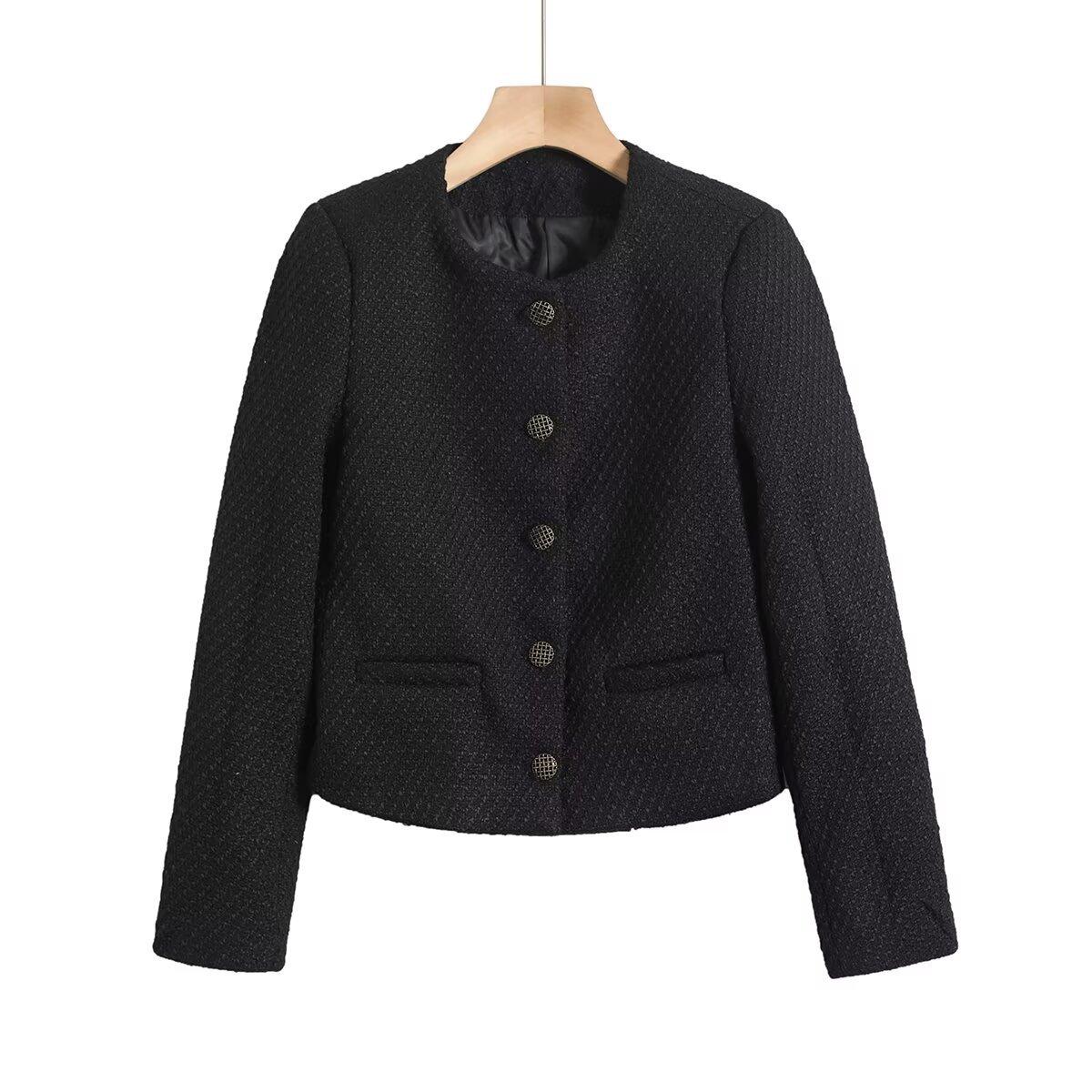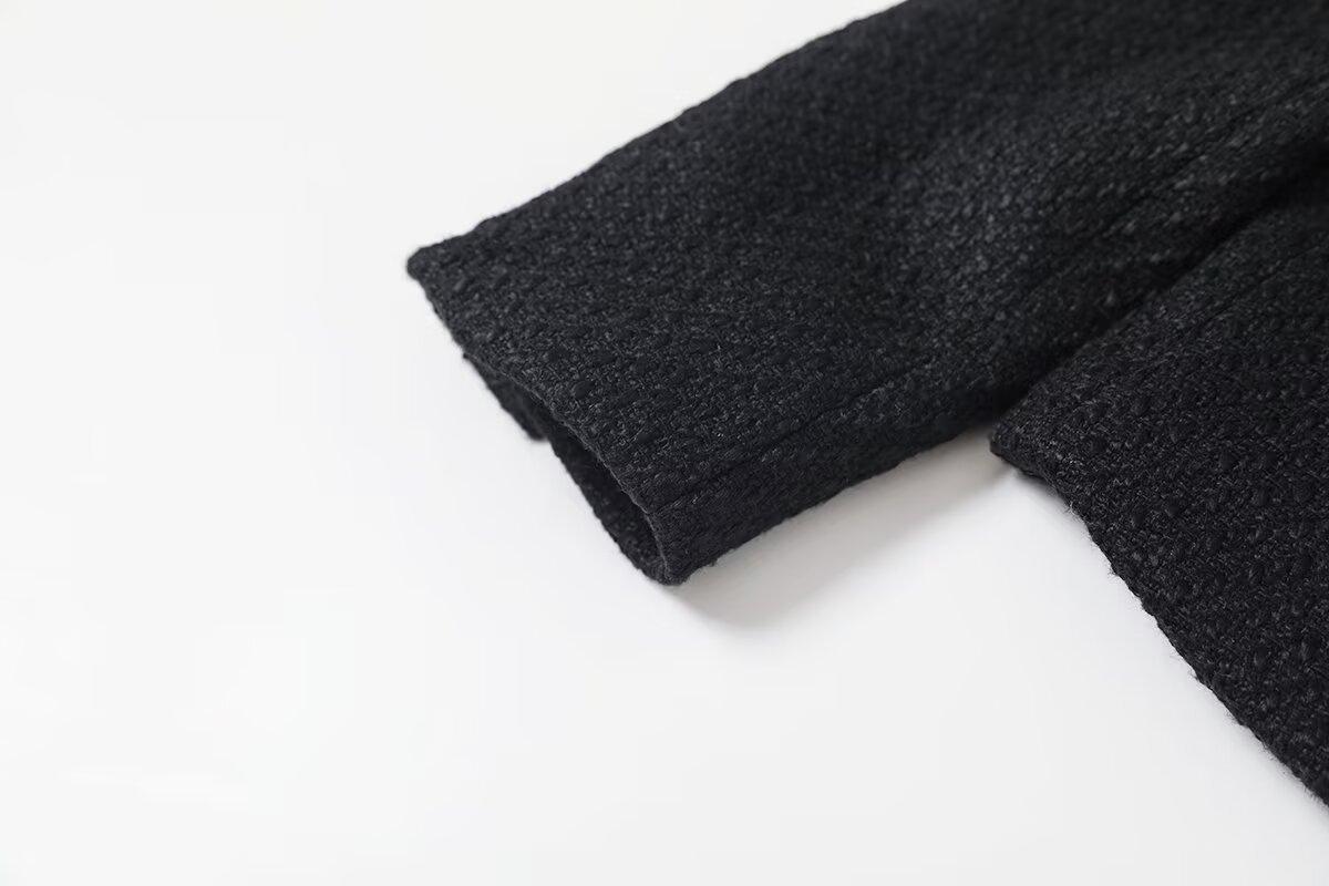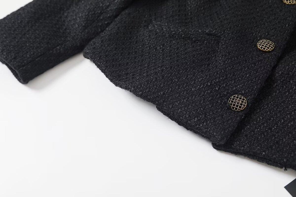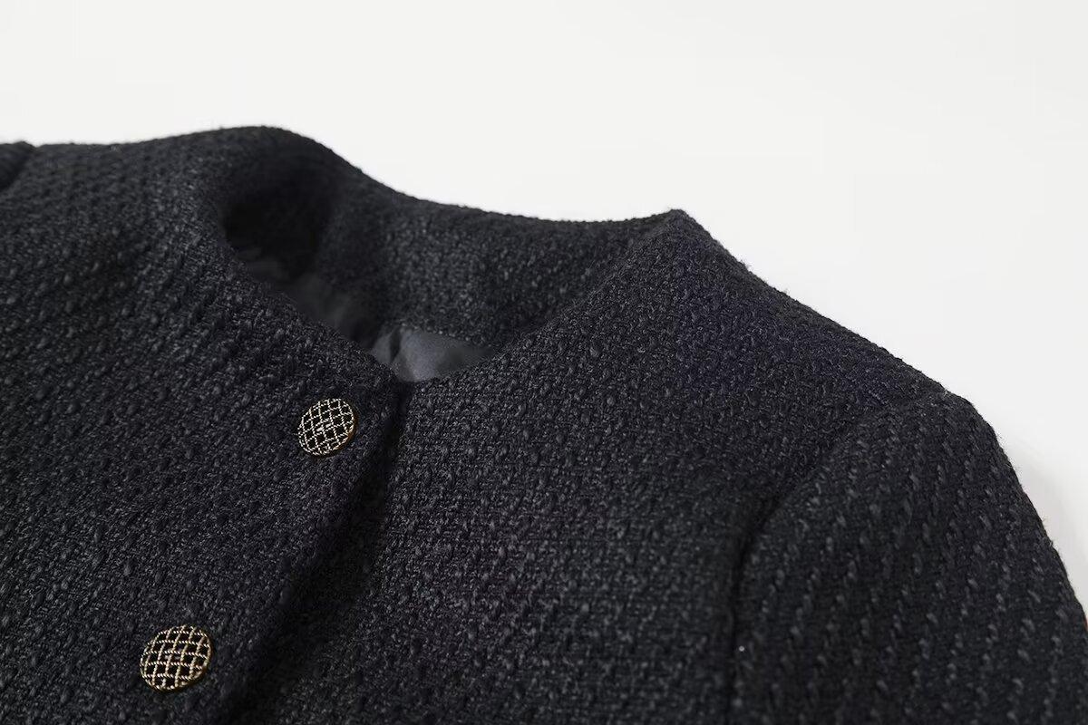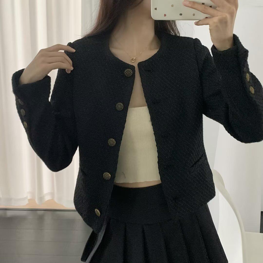 Otoño e Invierno Nuevo Elegante Casual Negro Lana de Bucle Cuello Redondo Holgado Adelgazante Estilo Chanel Abrigo Corto Top para Mujer