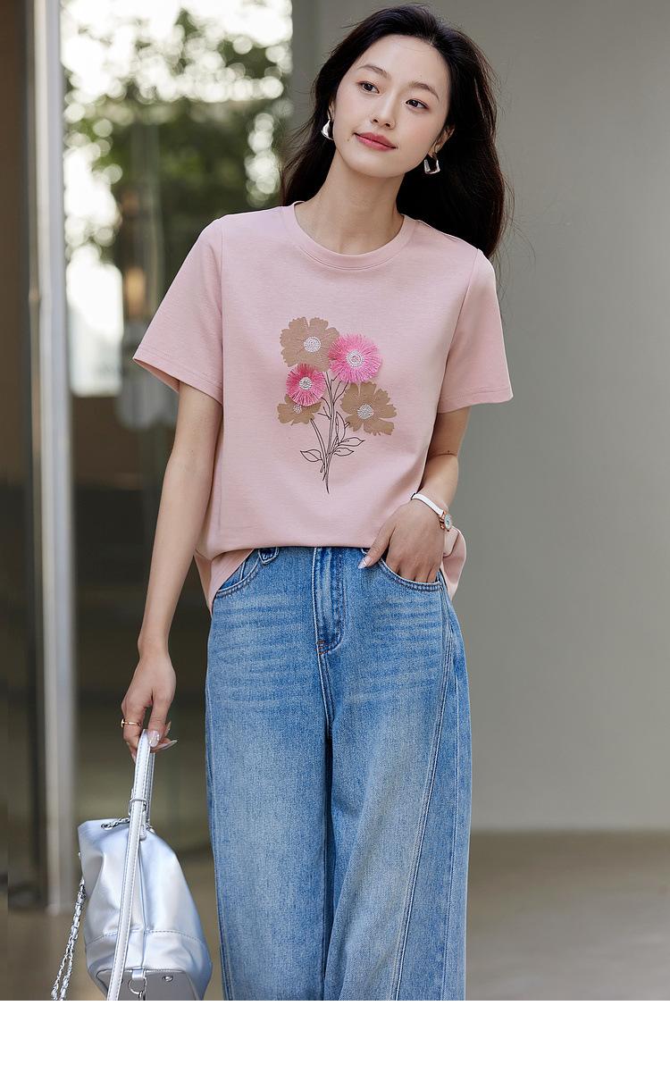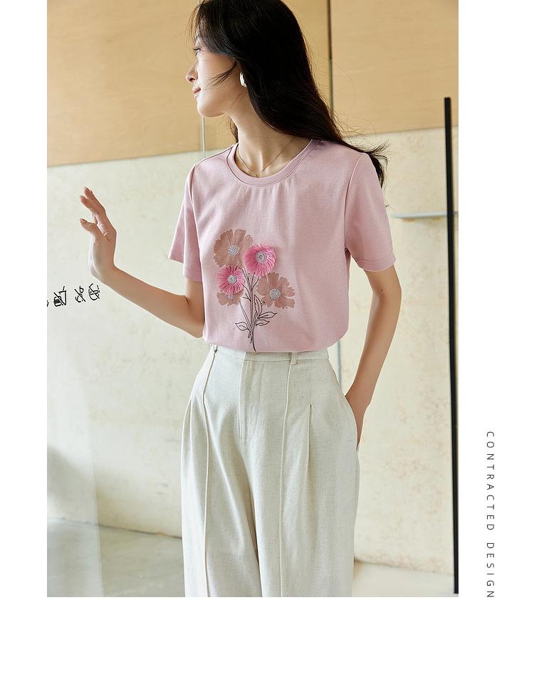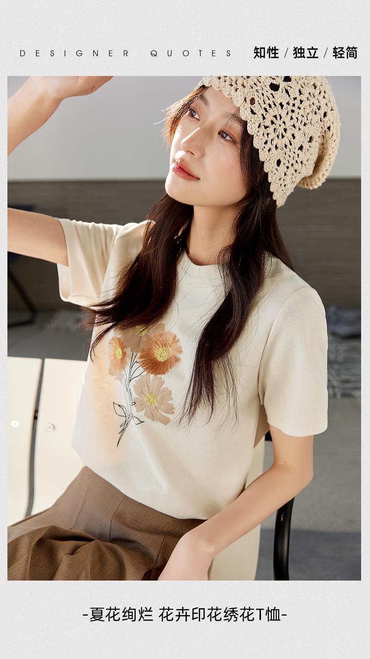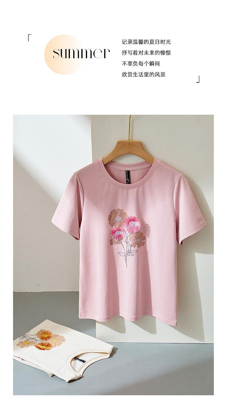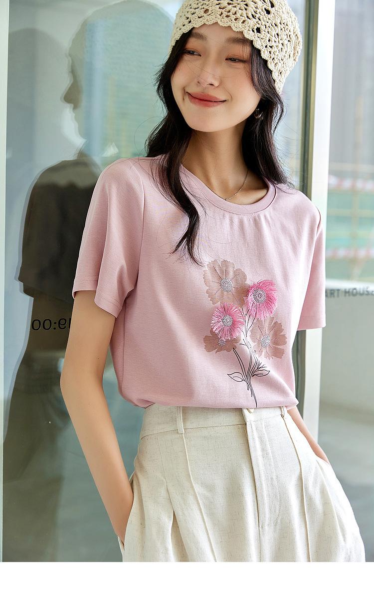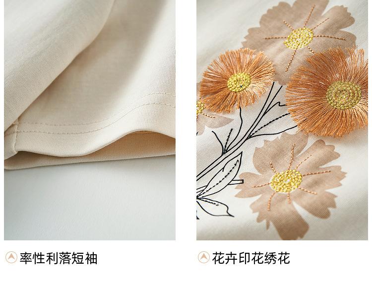 Zhen Xi Nueva Camiseta Bordada para Mujer de Manga Corta con Hombro Casual Suelta Cómoda Moda Top Estampado SQ561