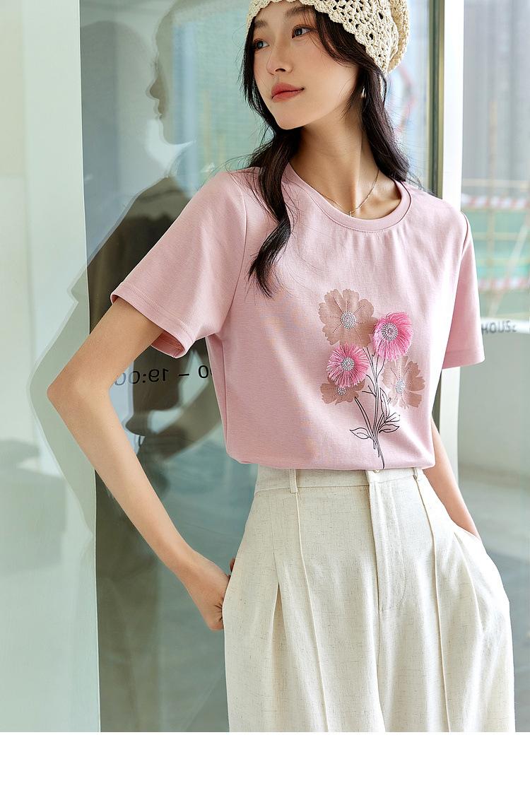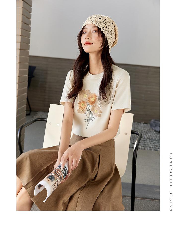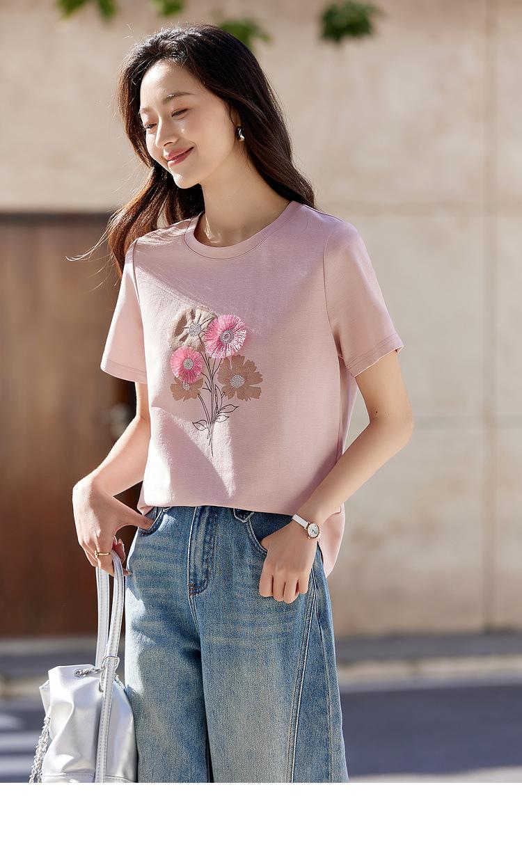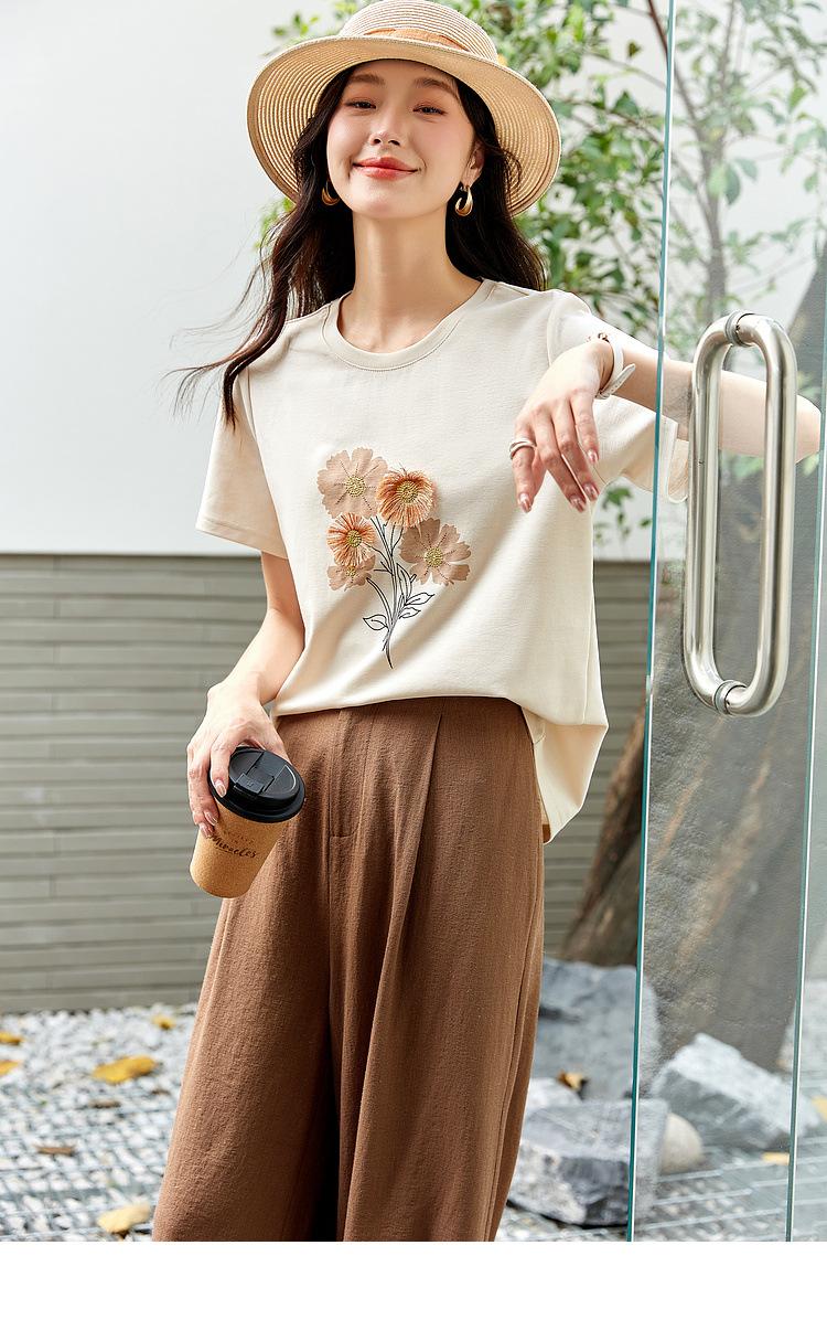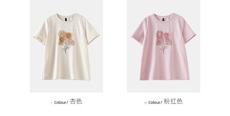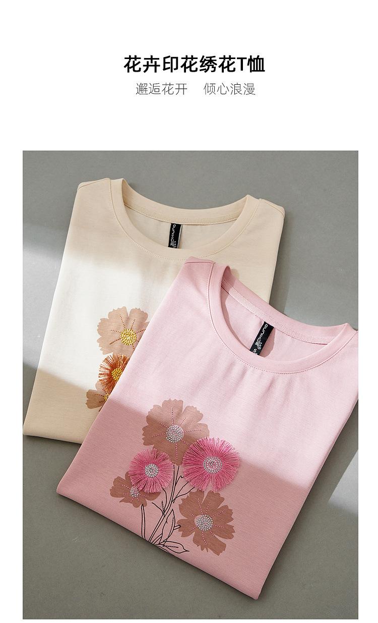Zhen Xi Nueva Camiseta Bordada para Mujer de Manga Corta con Hombro Casual Suelta Cómoda Moda Top Estampado SQ561