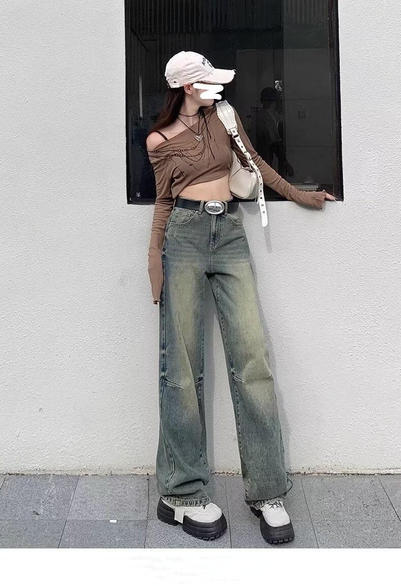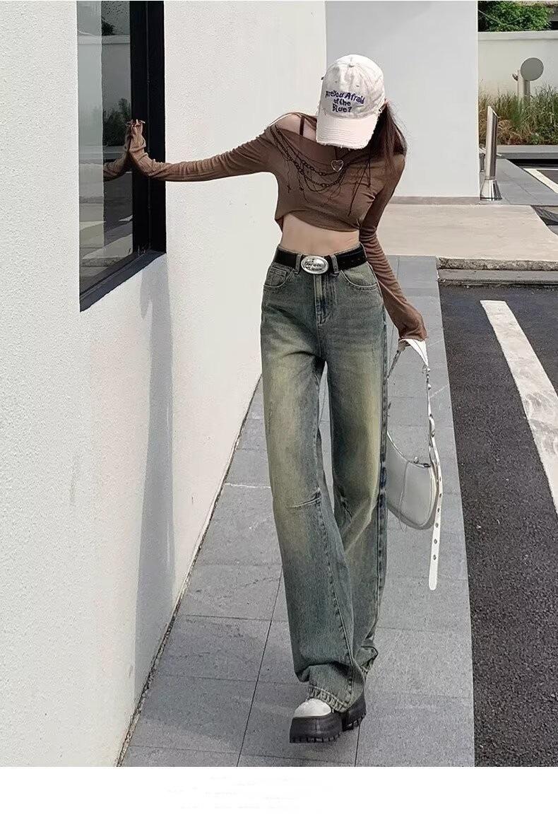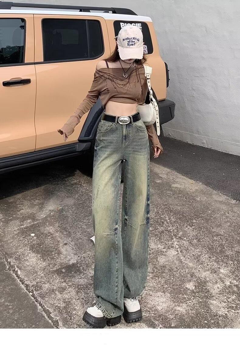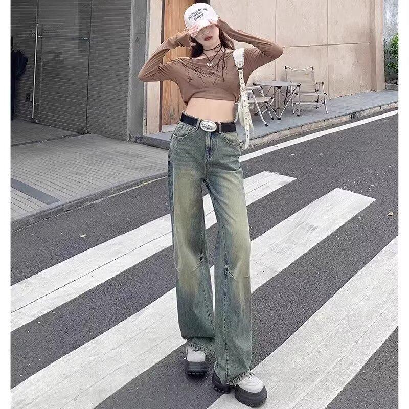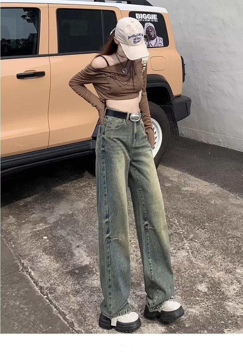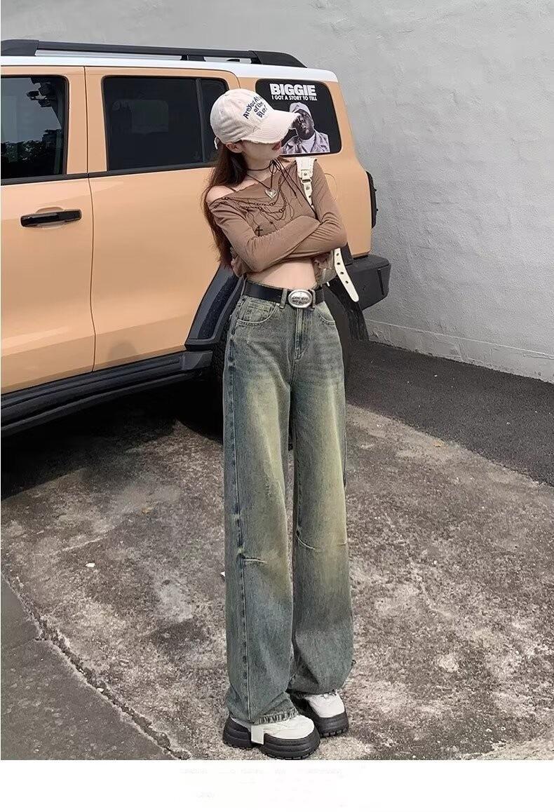Jeans Retro de Cintura Alta y Pierna Ancha Estilo Americano para Mujer con Diseño y Lavado Antiguo, Holgados, Rectos, Ajustados, con Dobladillo