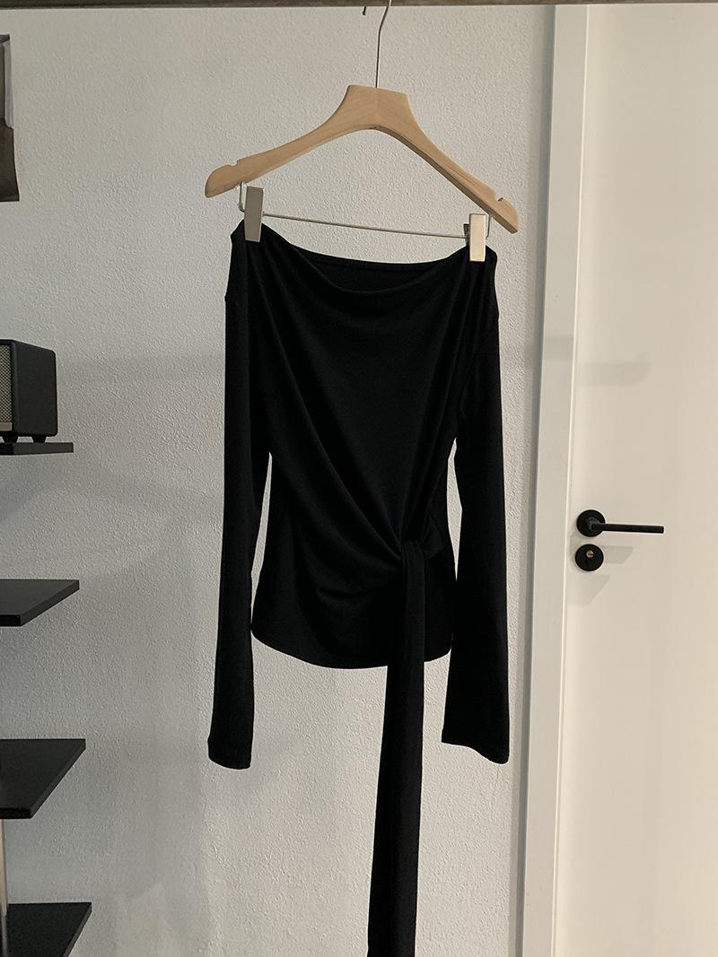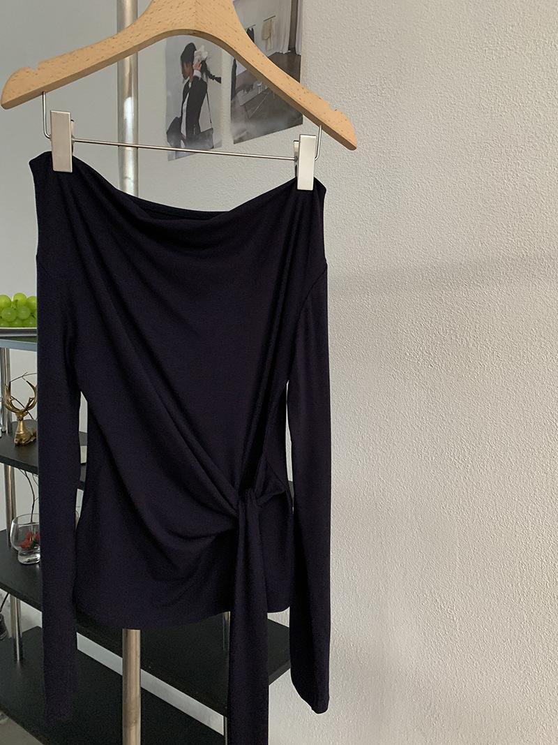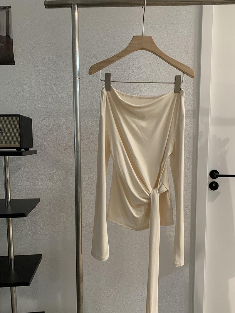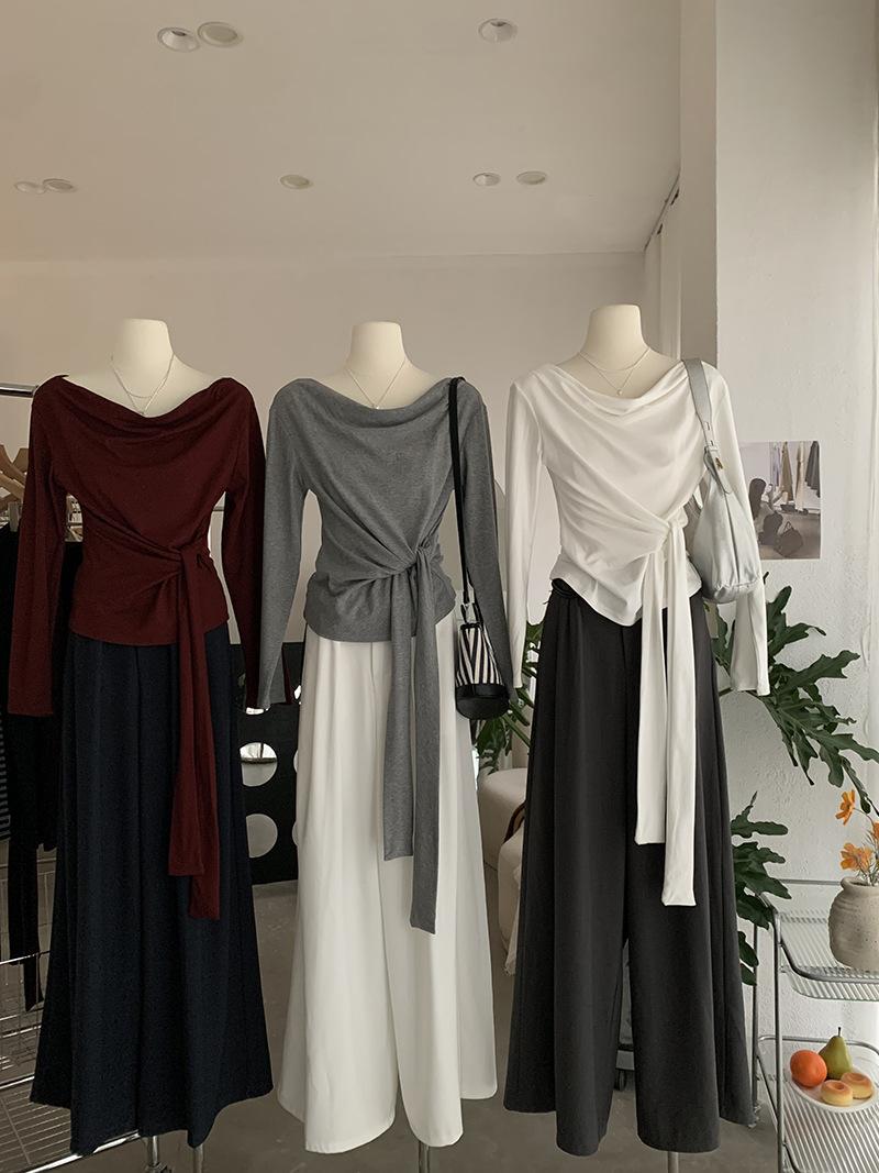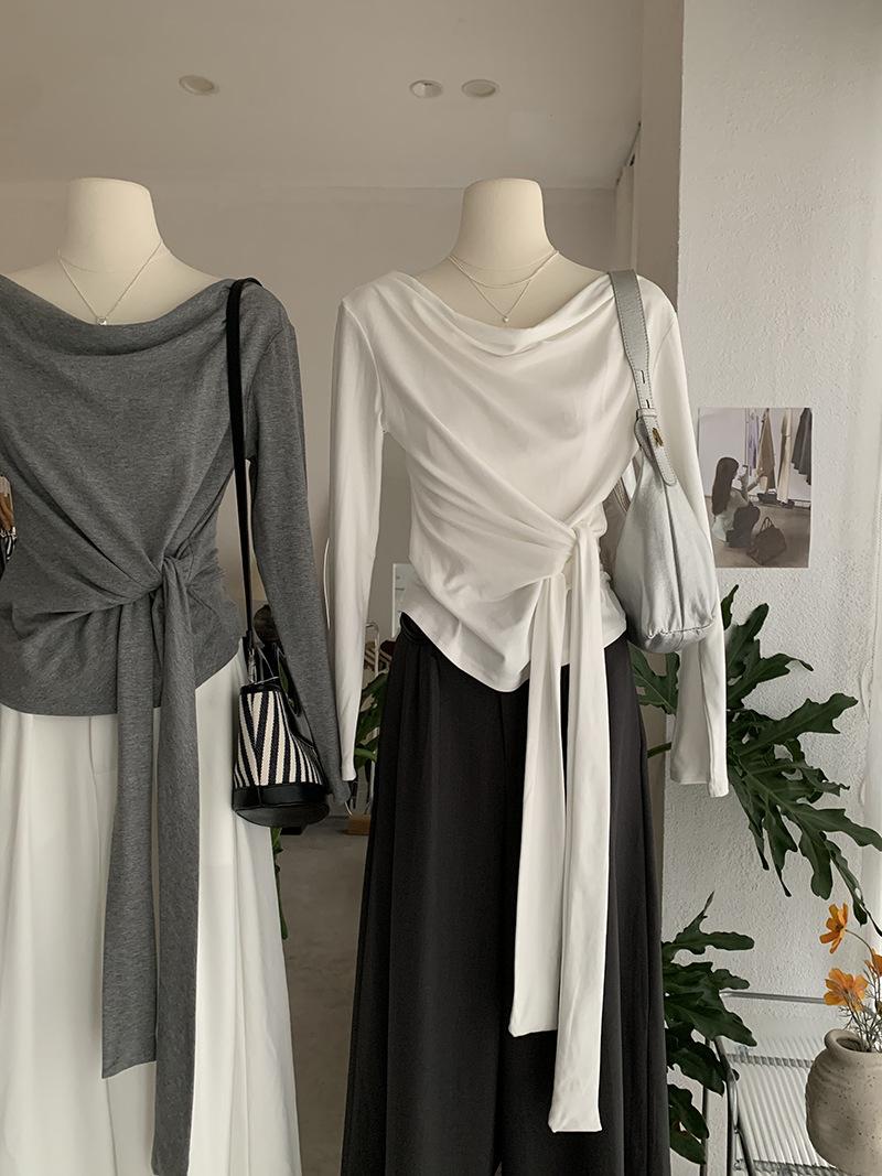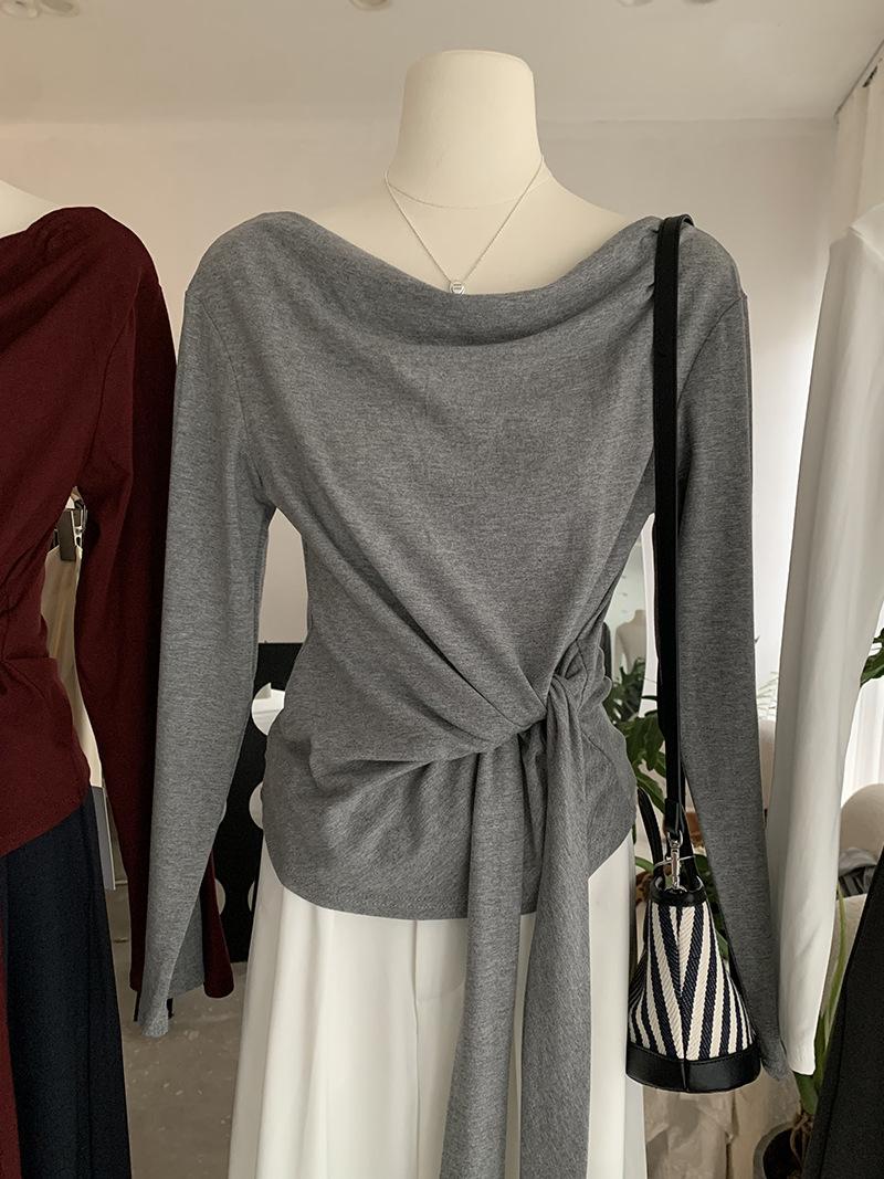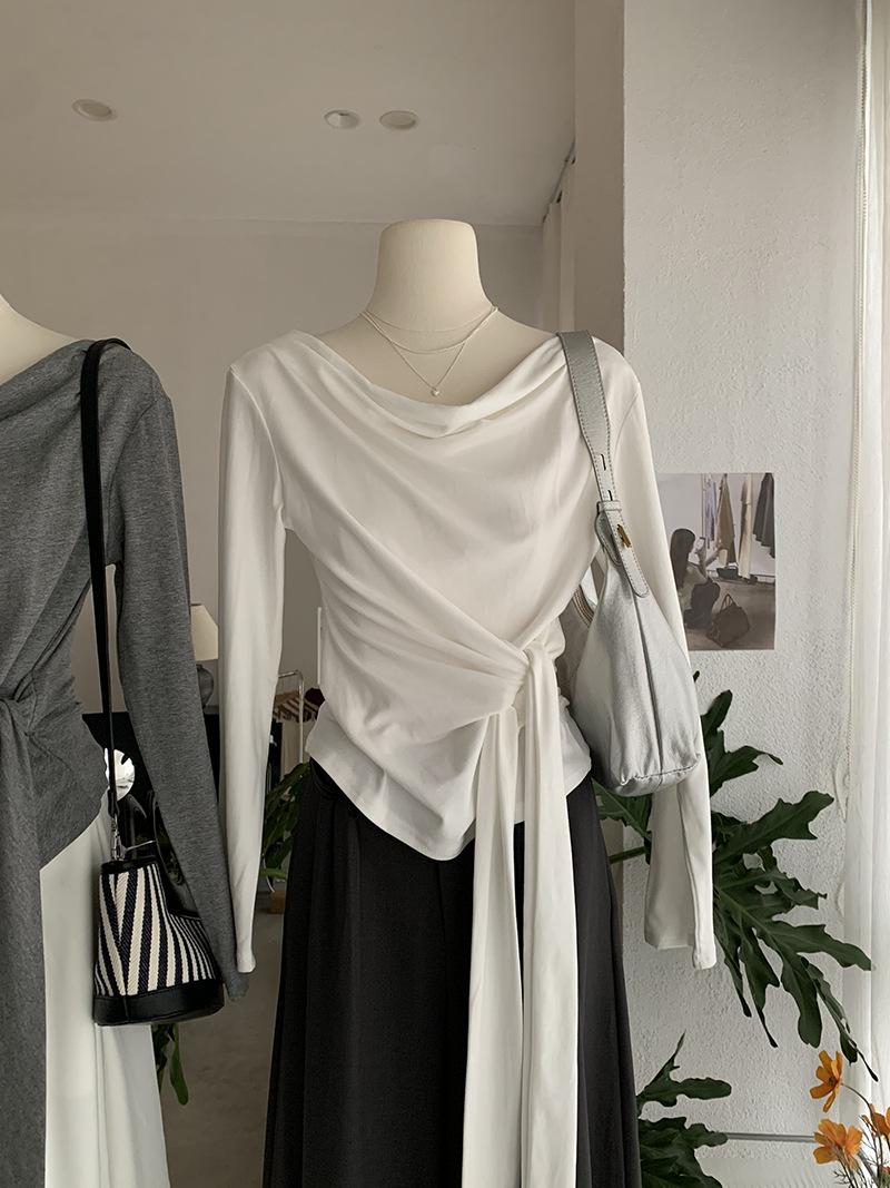 Oumaile Principios de Otoño Coreano Diseño con Cuello Drapeado Sentido Lazo Cintura Versátil Adelgazante Manga Larga Color Sólido Camiseta Top 4330