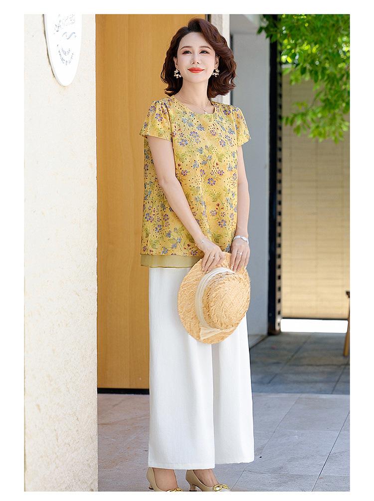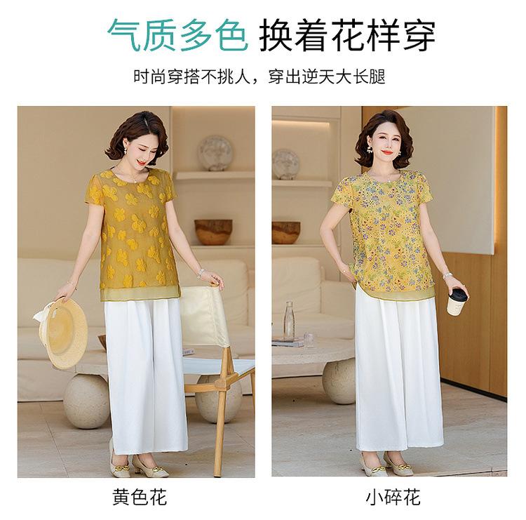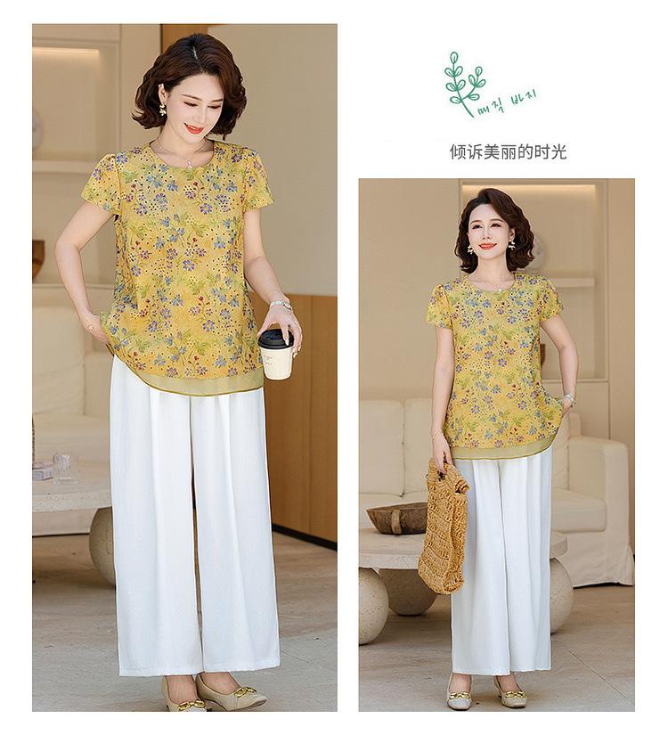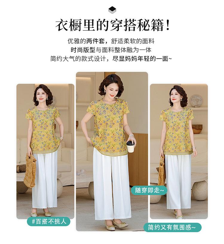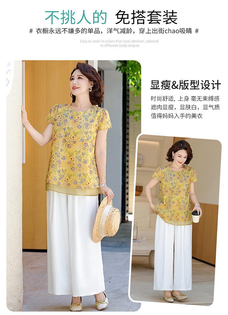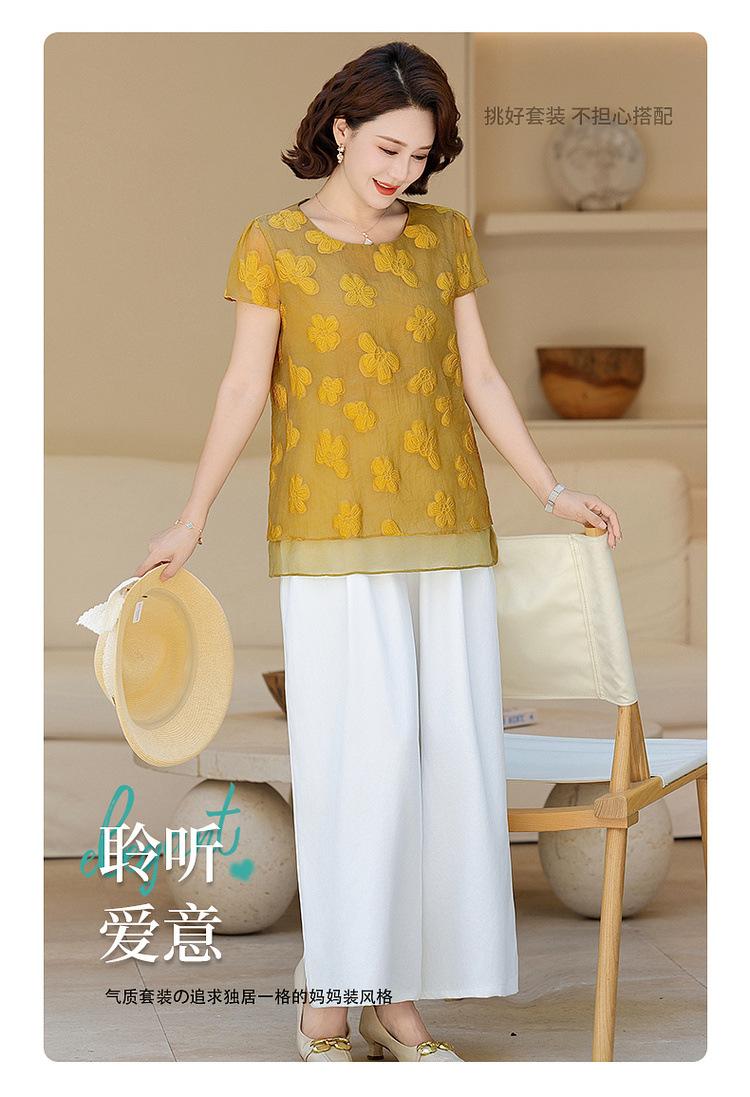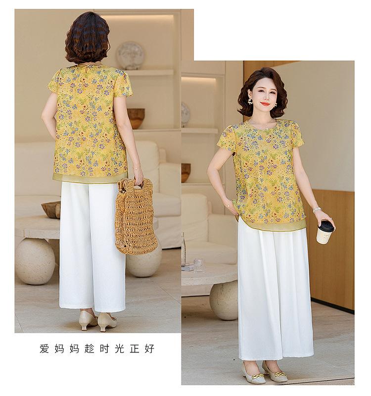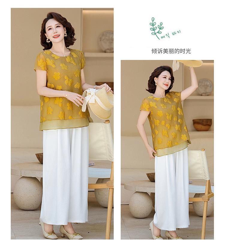 Moda de Verano 2025 para Mamá Nueva Camisa de Manga Corta para Mujer Look Adelgazante para Edad Media Conjunto de Dos Piezas