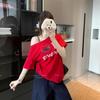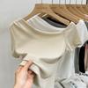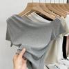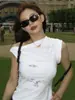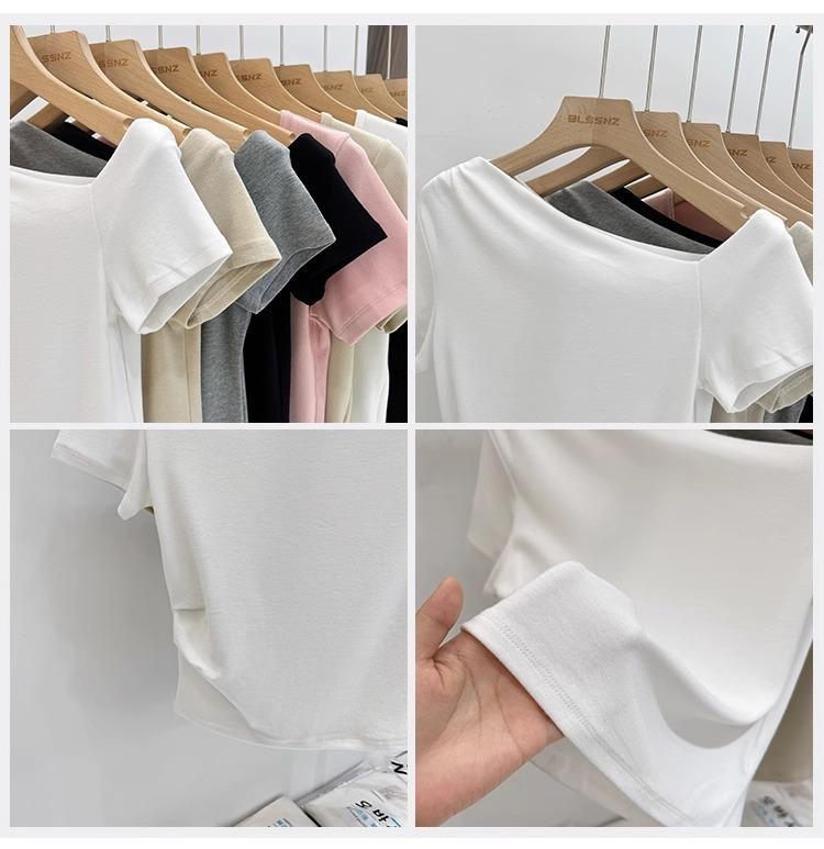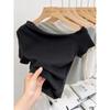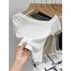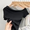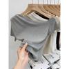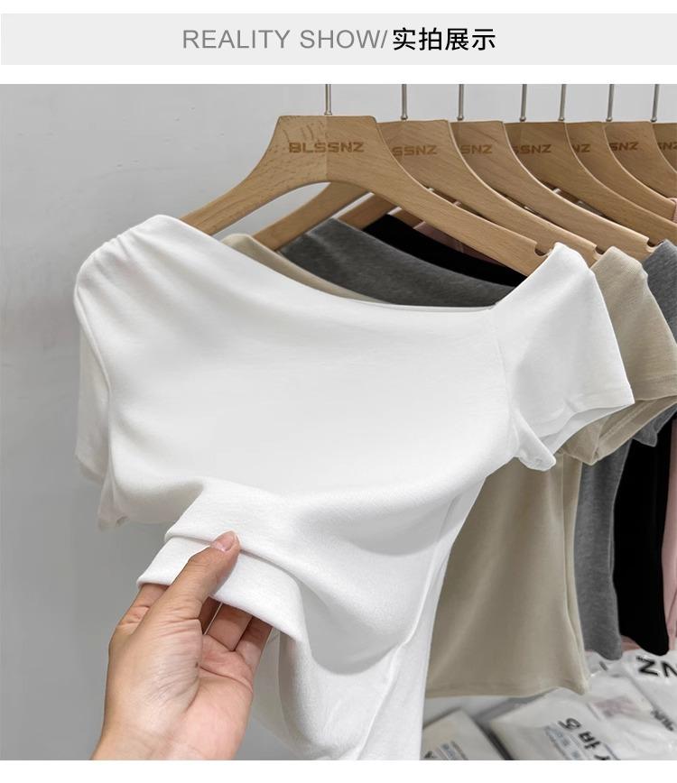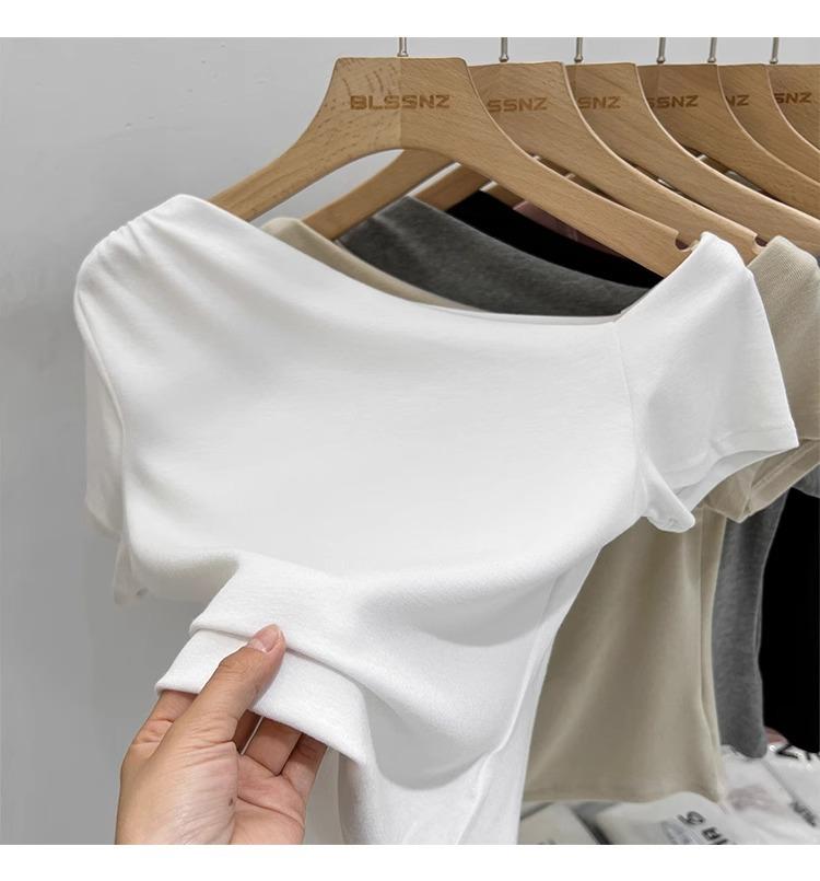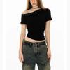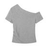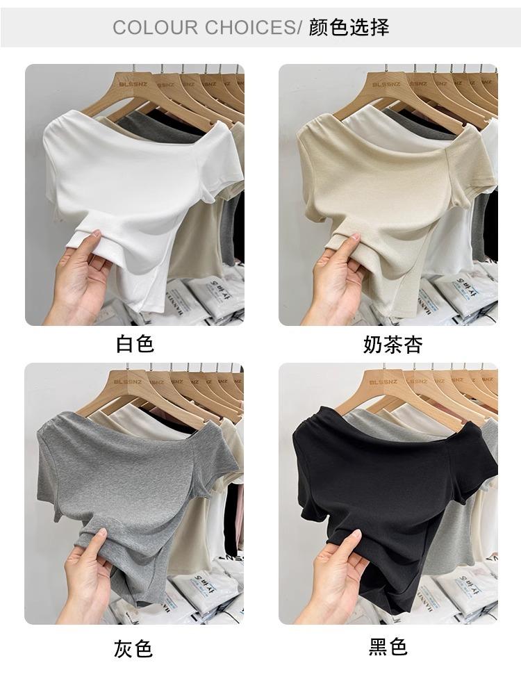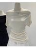 Top de Hombro Descubierto con Cuello Inclinado para Mujer en Estilo Sexy de Verano Casual de Manga Corta Ajustado a la Cintura Plisado Asimétrico Puro Deseo Camiseta