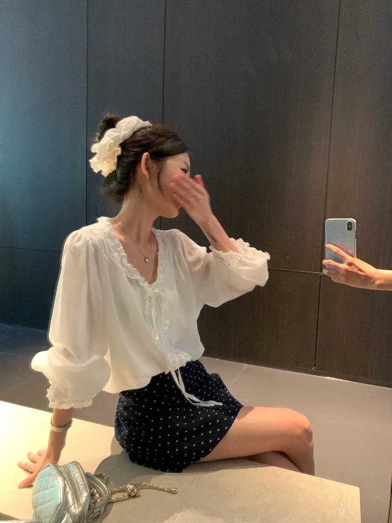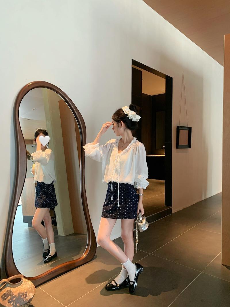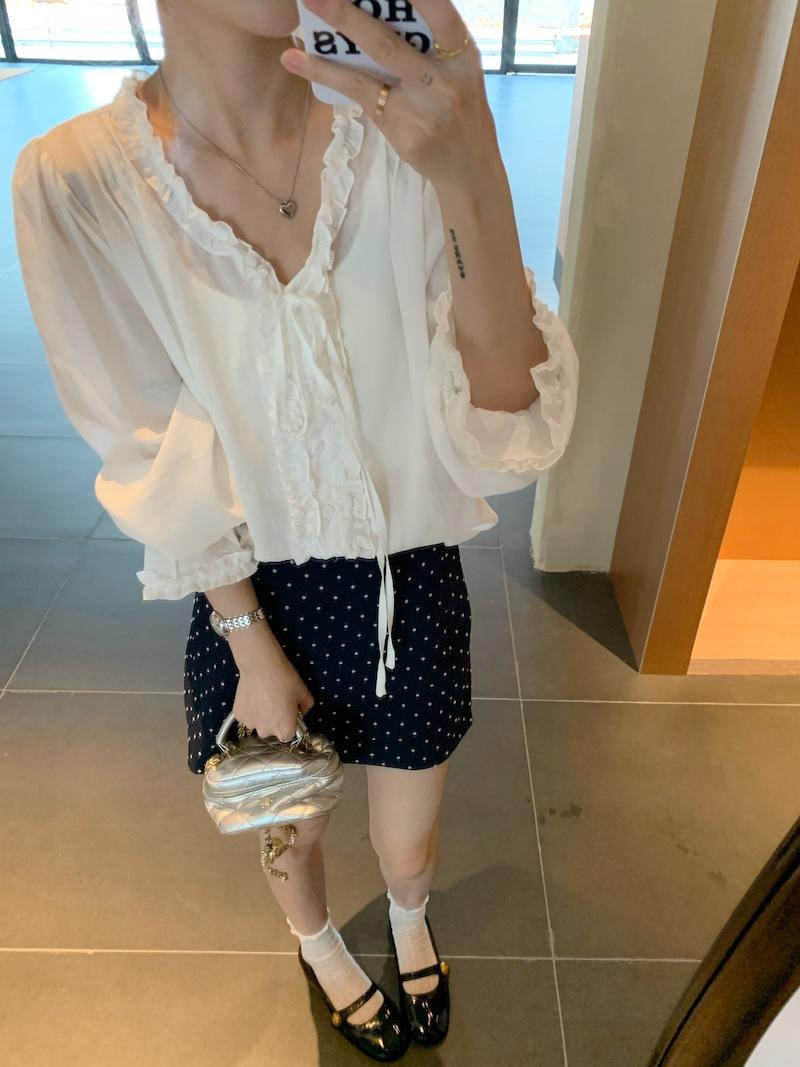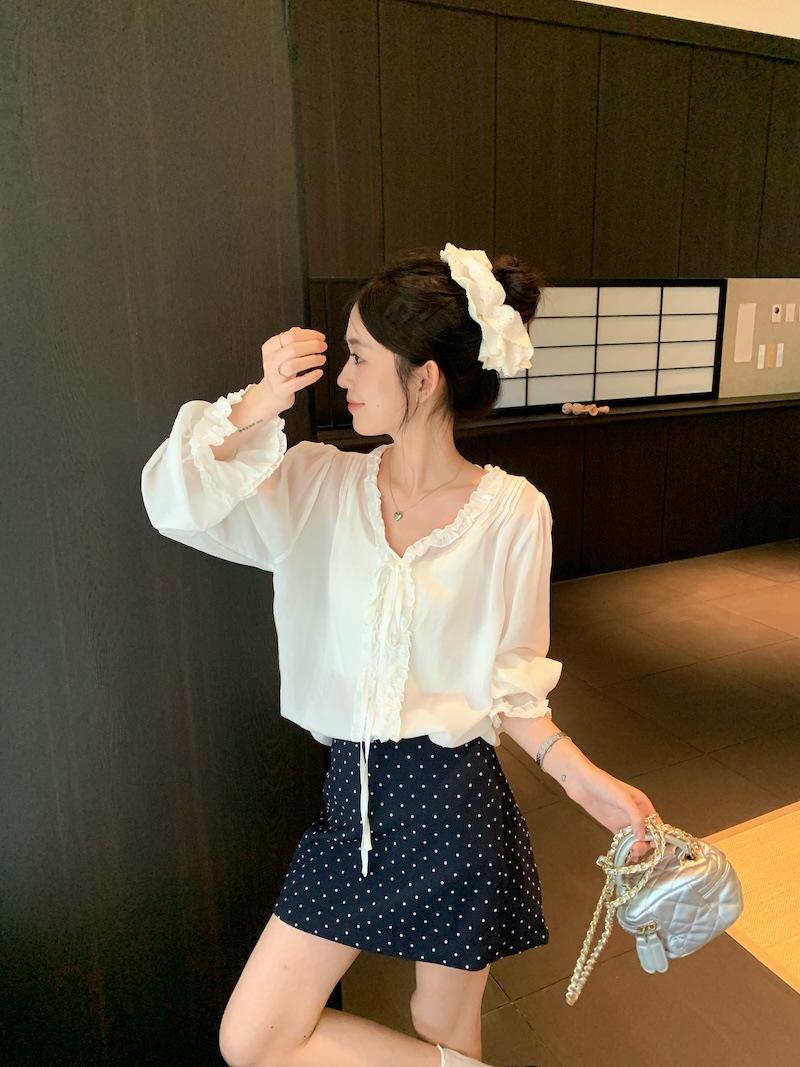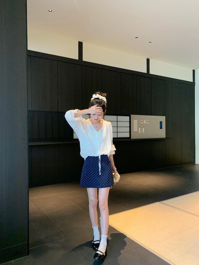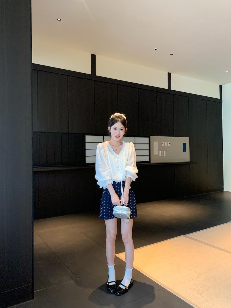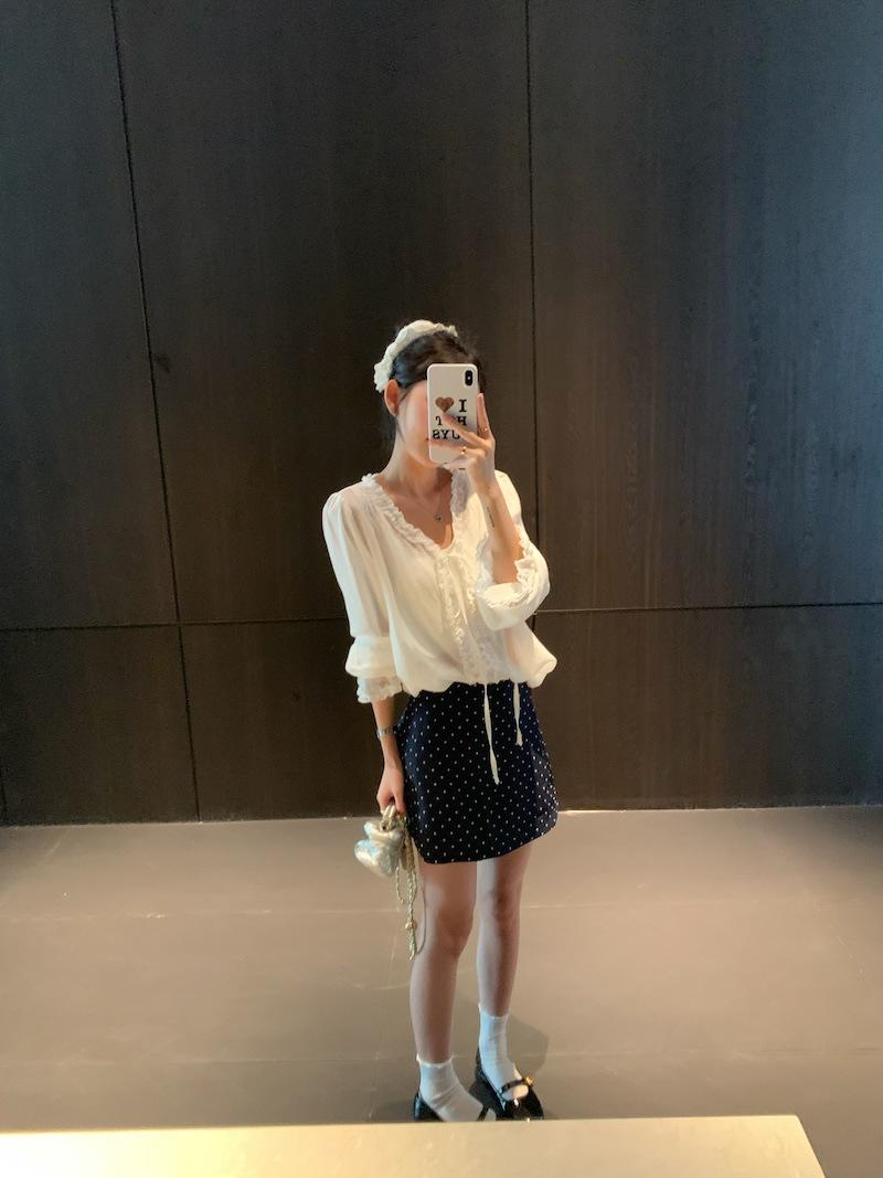 Conjunto Pequeño Estilo Coreano de Tiro Real Camisa con Volantes y Cuello en V Falda Midi de Lunares Conjunto Exquisito de Dos Piezas Súper Atractivo Ropa de Mujer