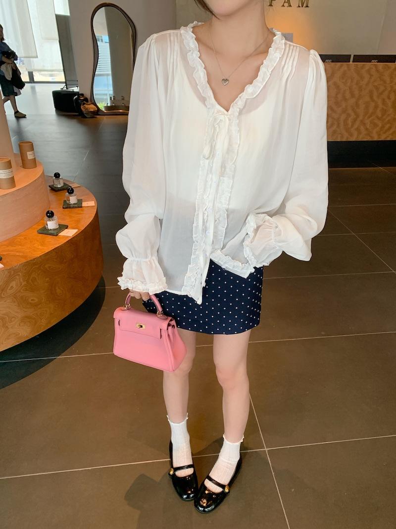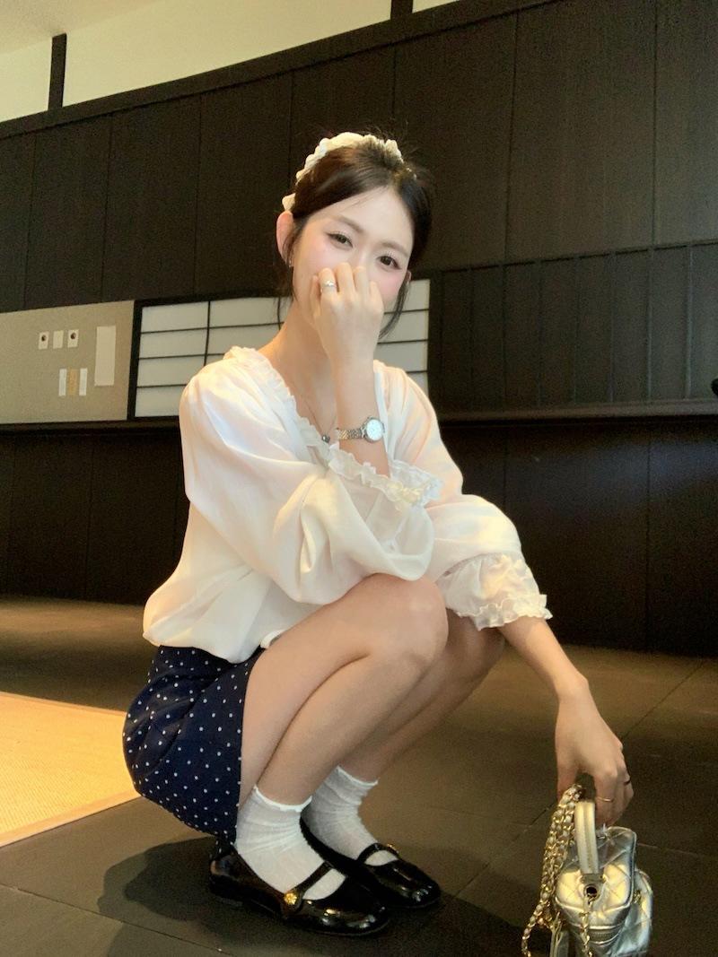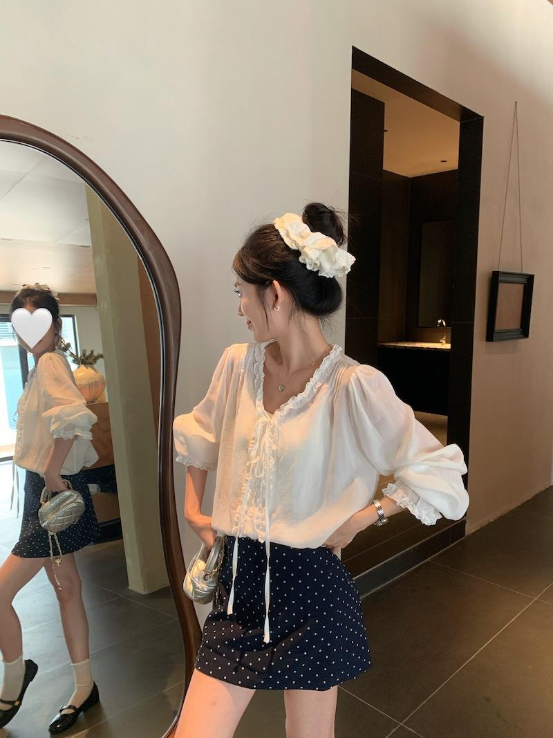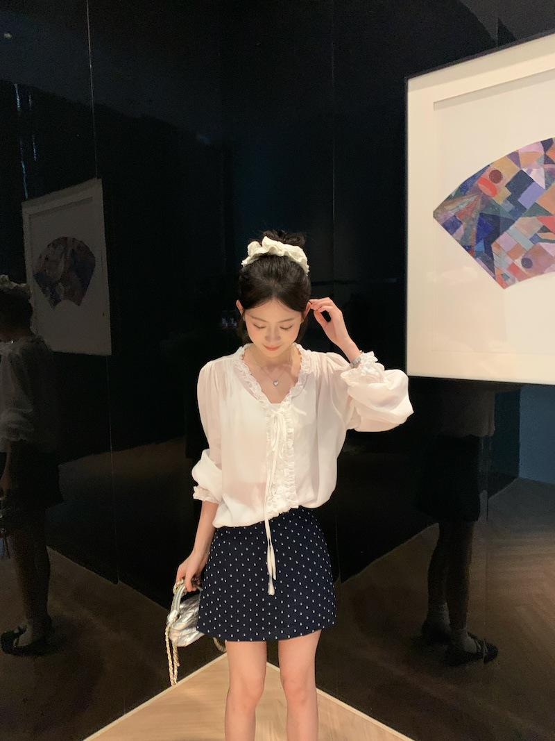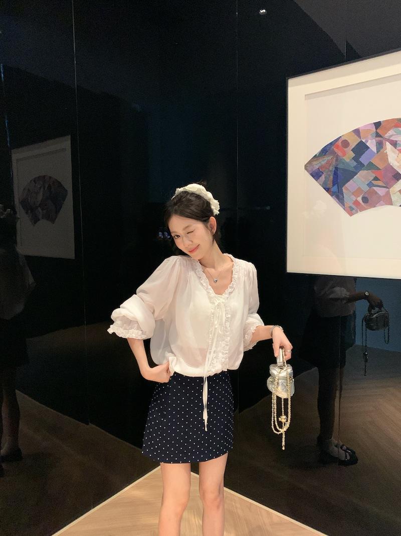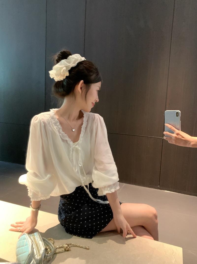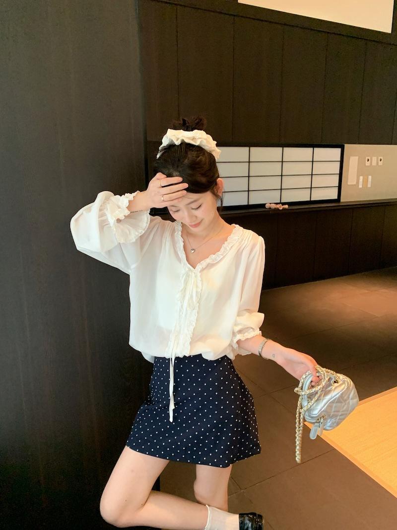 Conjunto Pequeño Estilo Coreano de Tiro Real Camisa con Volantes y Cuello en V Falda Midi de Lunares Conjunto Exquisito de Dos Piezas Súper Atractivo Ropa de Mujer