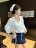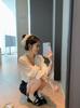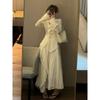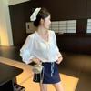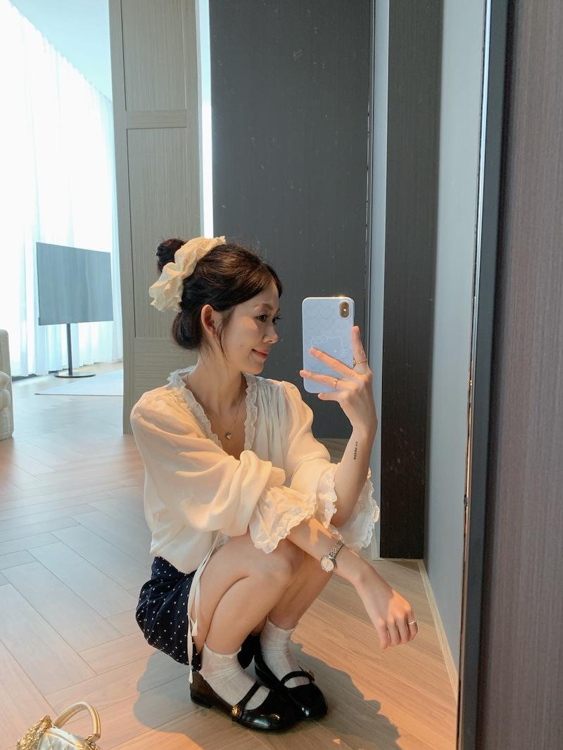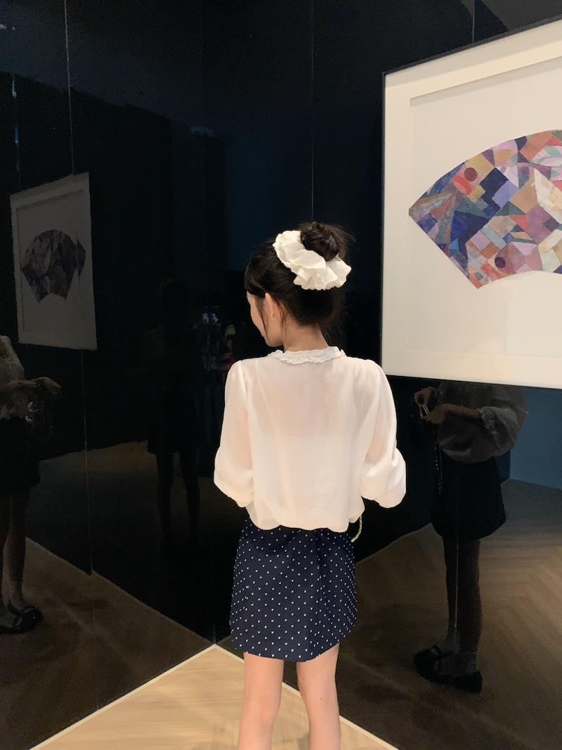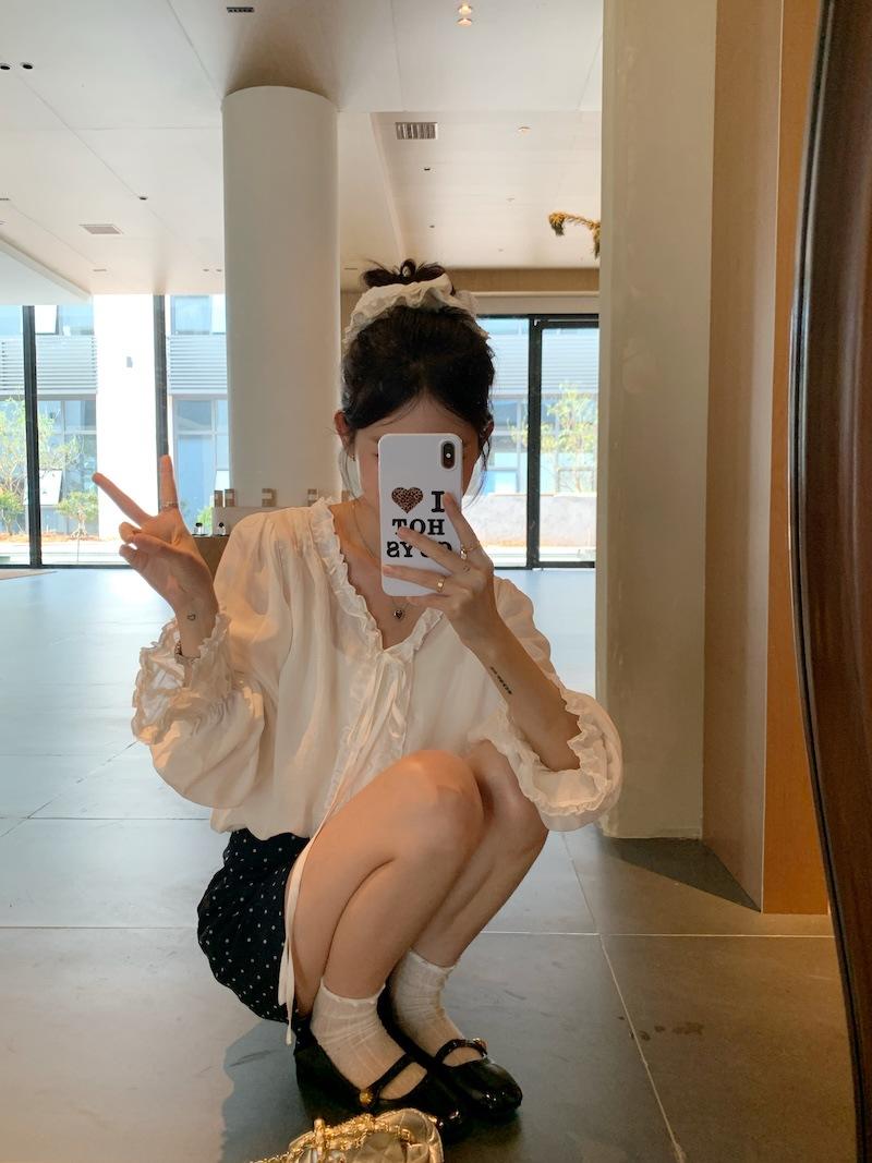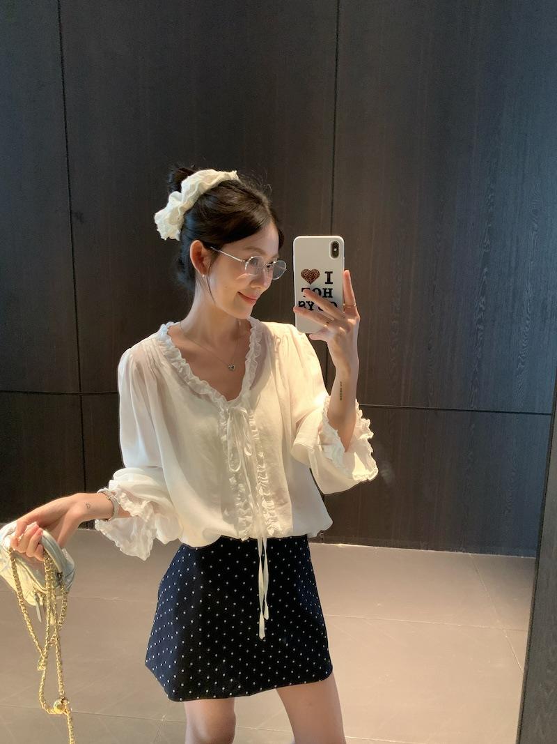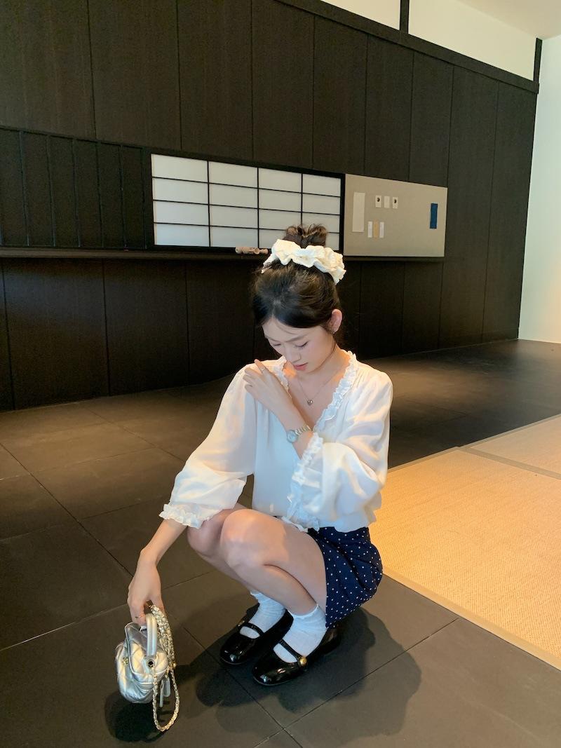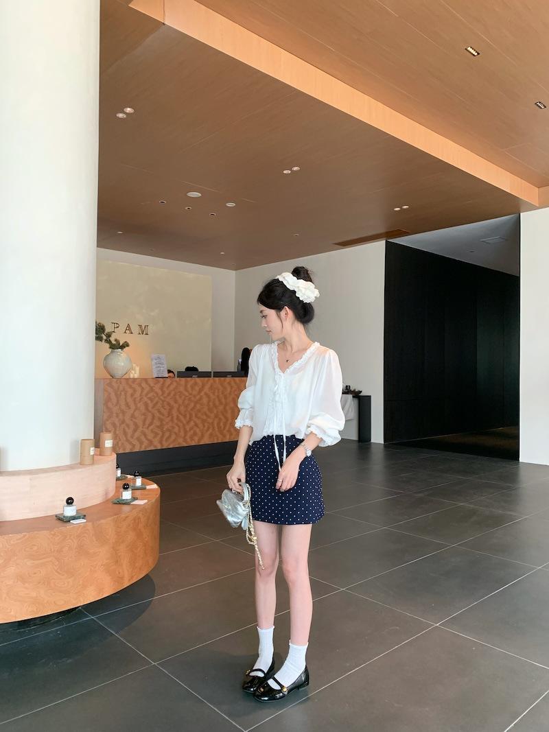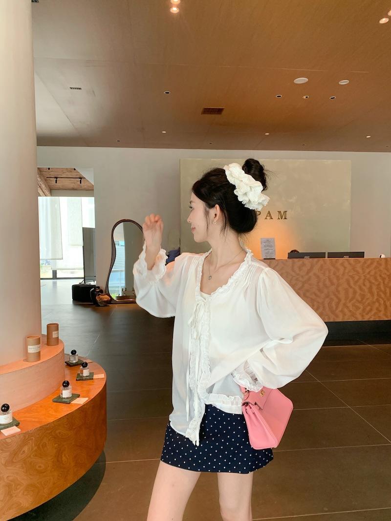 Conjunto Pequeño Estilo Coreano de Tiro Real Camisa con Volantes y Cuello en V Falda Midi de Lunares Conjunto Exquisito de Dos Piezas Súper Atractivo Ropa de Mujer