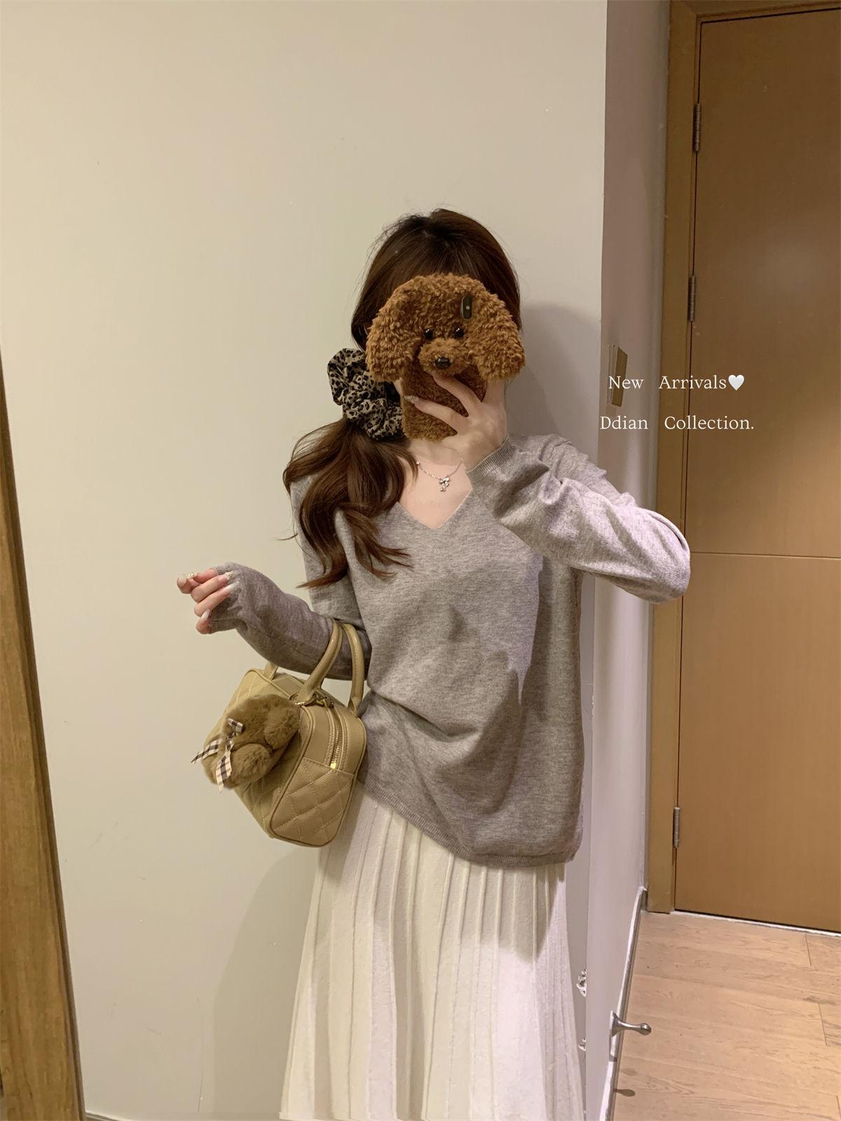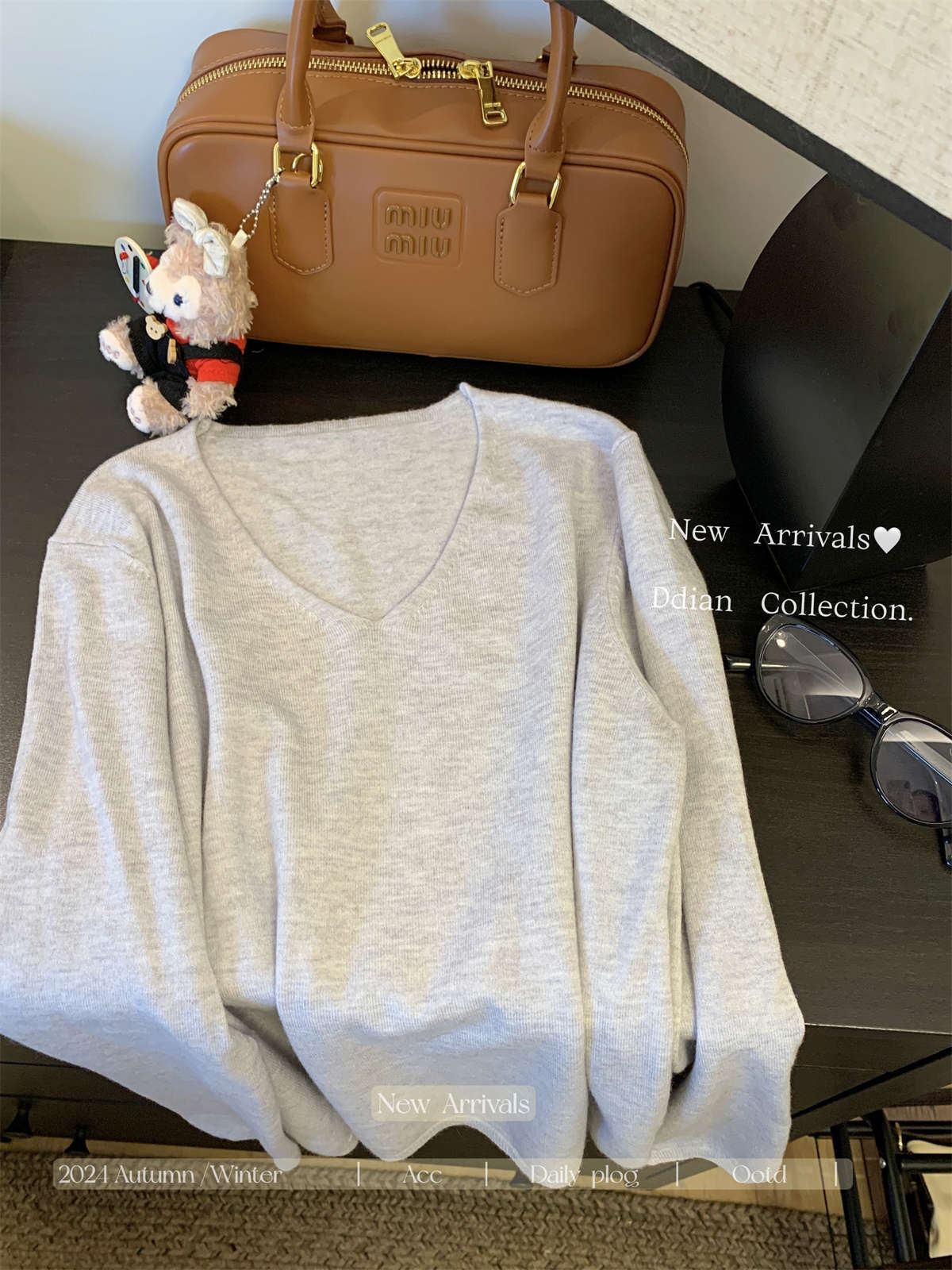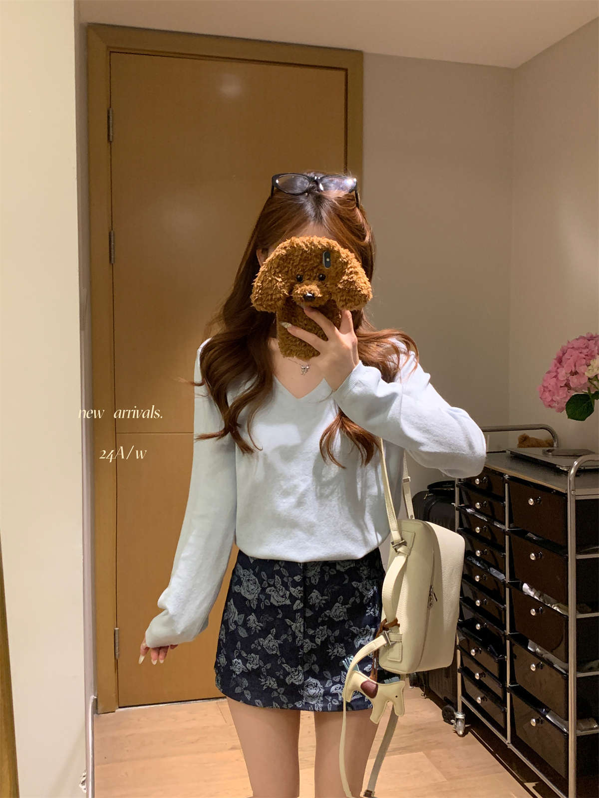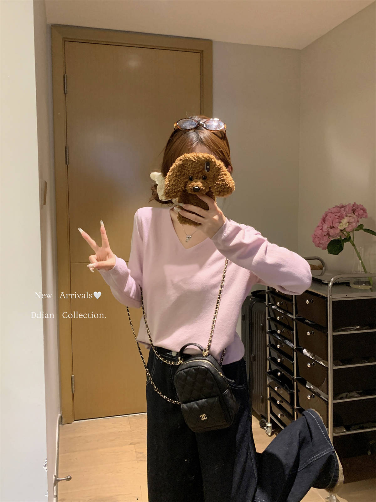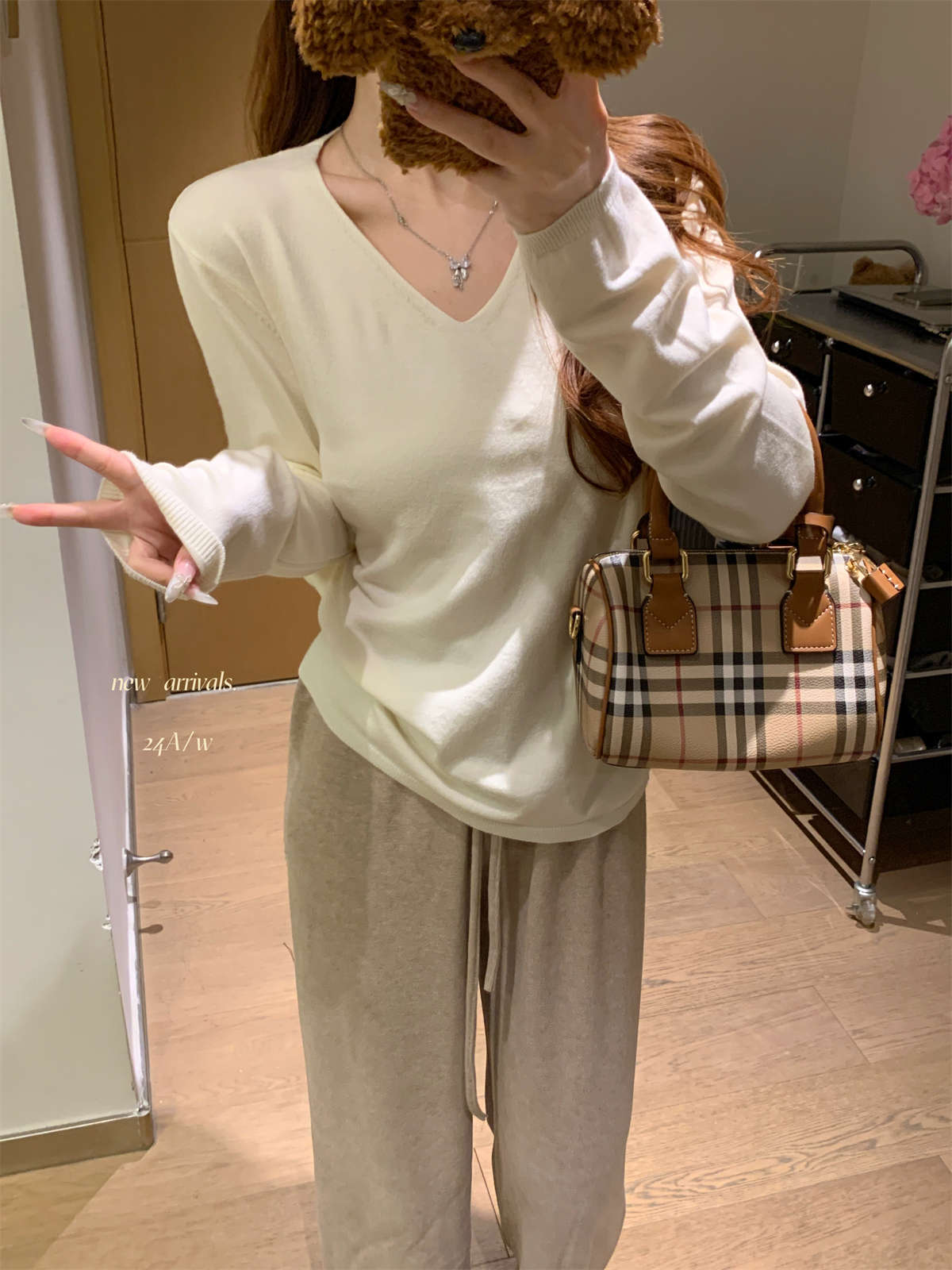 Suéter de Punto Romántico Esponjoso Versátil de Cuello en V Casual de Manga Larga Estilo Francés para Mujer, Elegante Capa Base de Suéter Combinable para Principios de Primavera