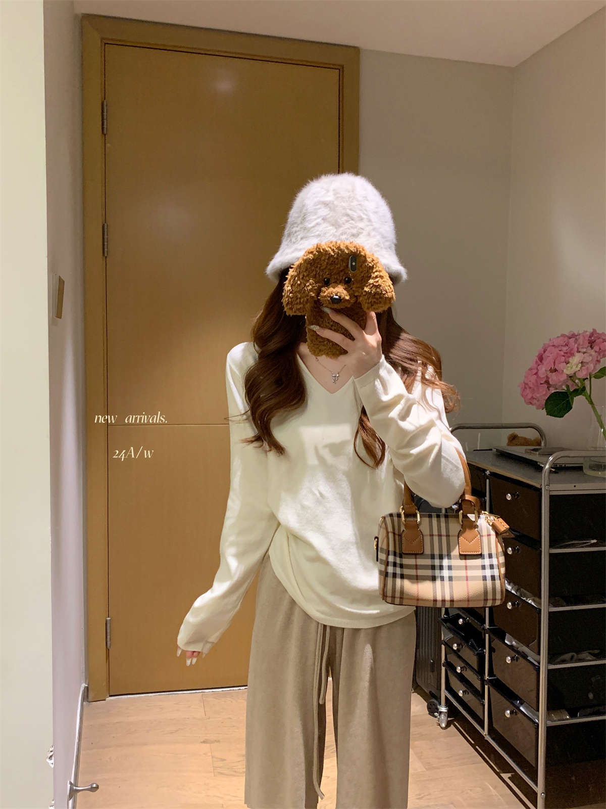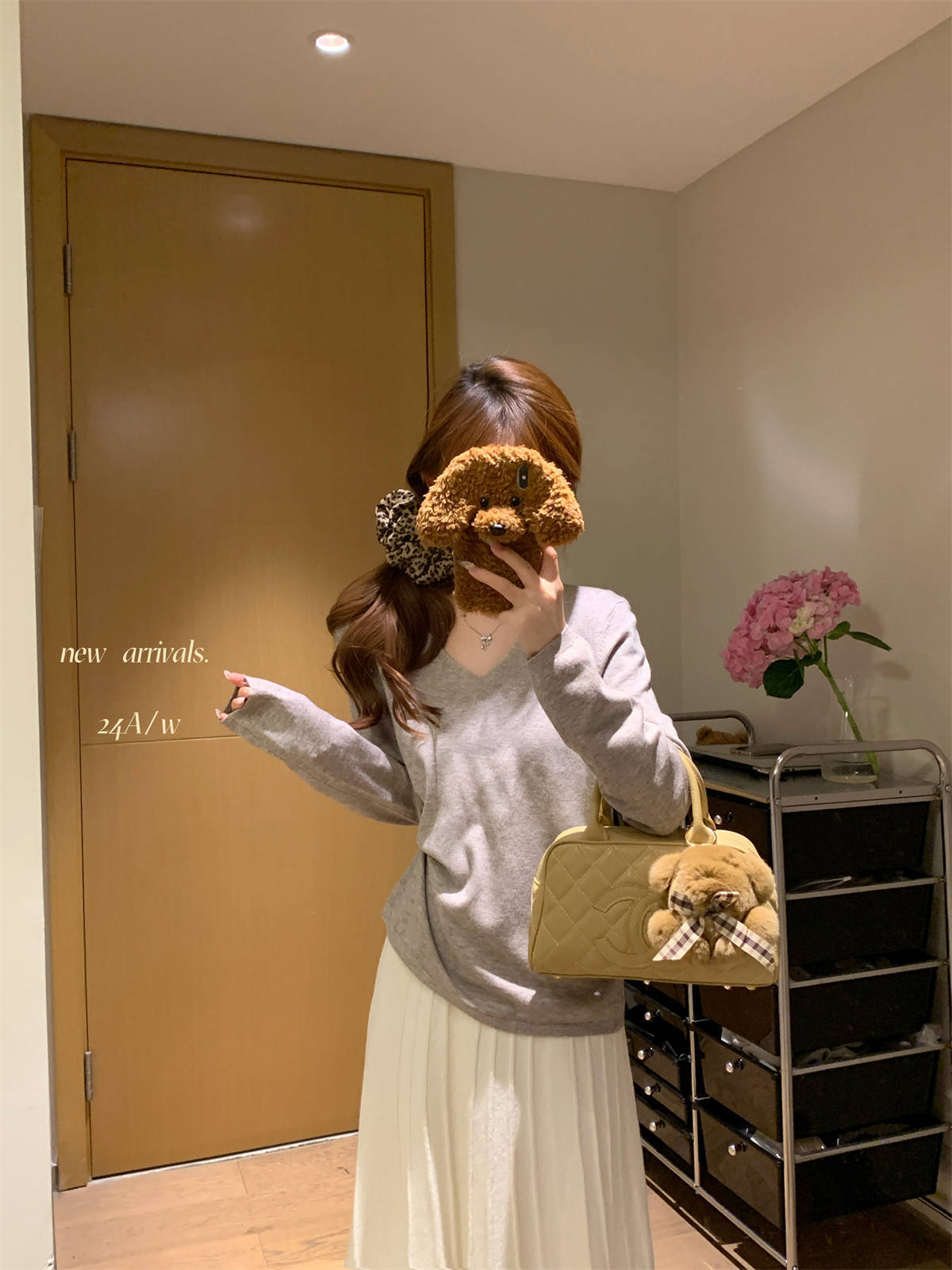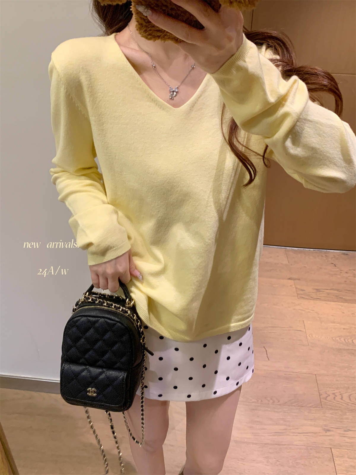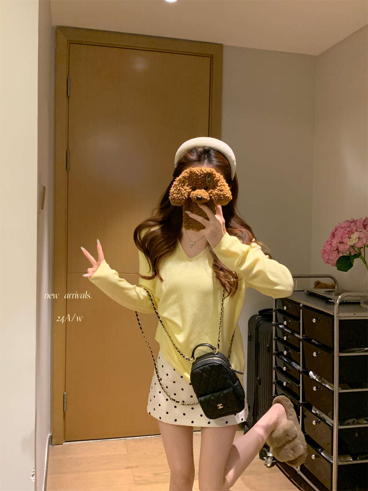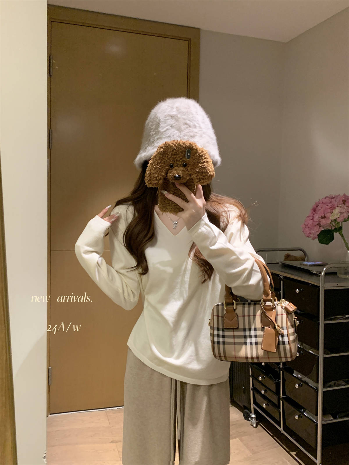 Suéter de Punto Romántico Esponjoso Versátil de Cuello en V Casual de Manga Larga Estilo Francés para Mujer, Elegante Capa Base de Suéter Combinable para Principios de Primavera