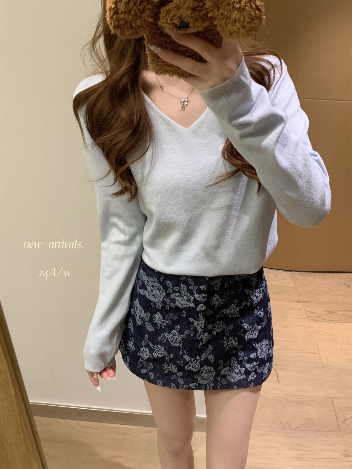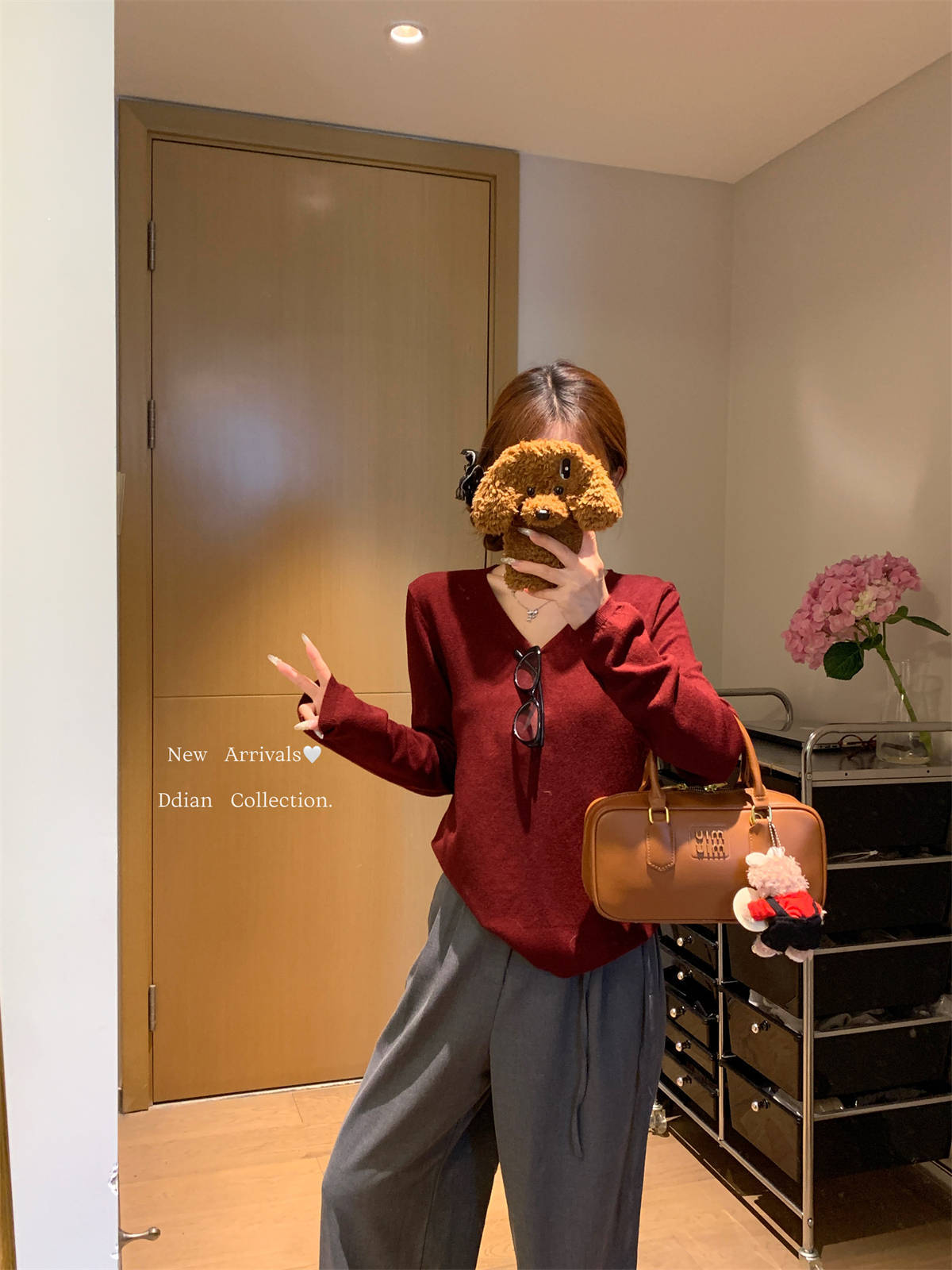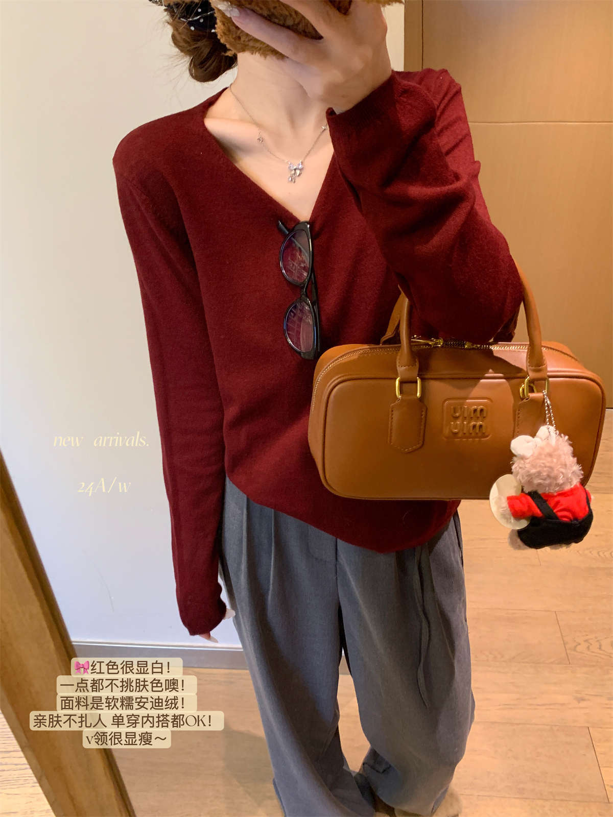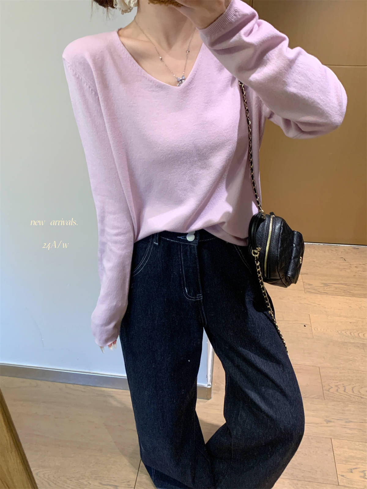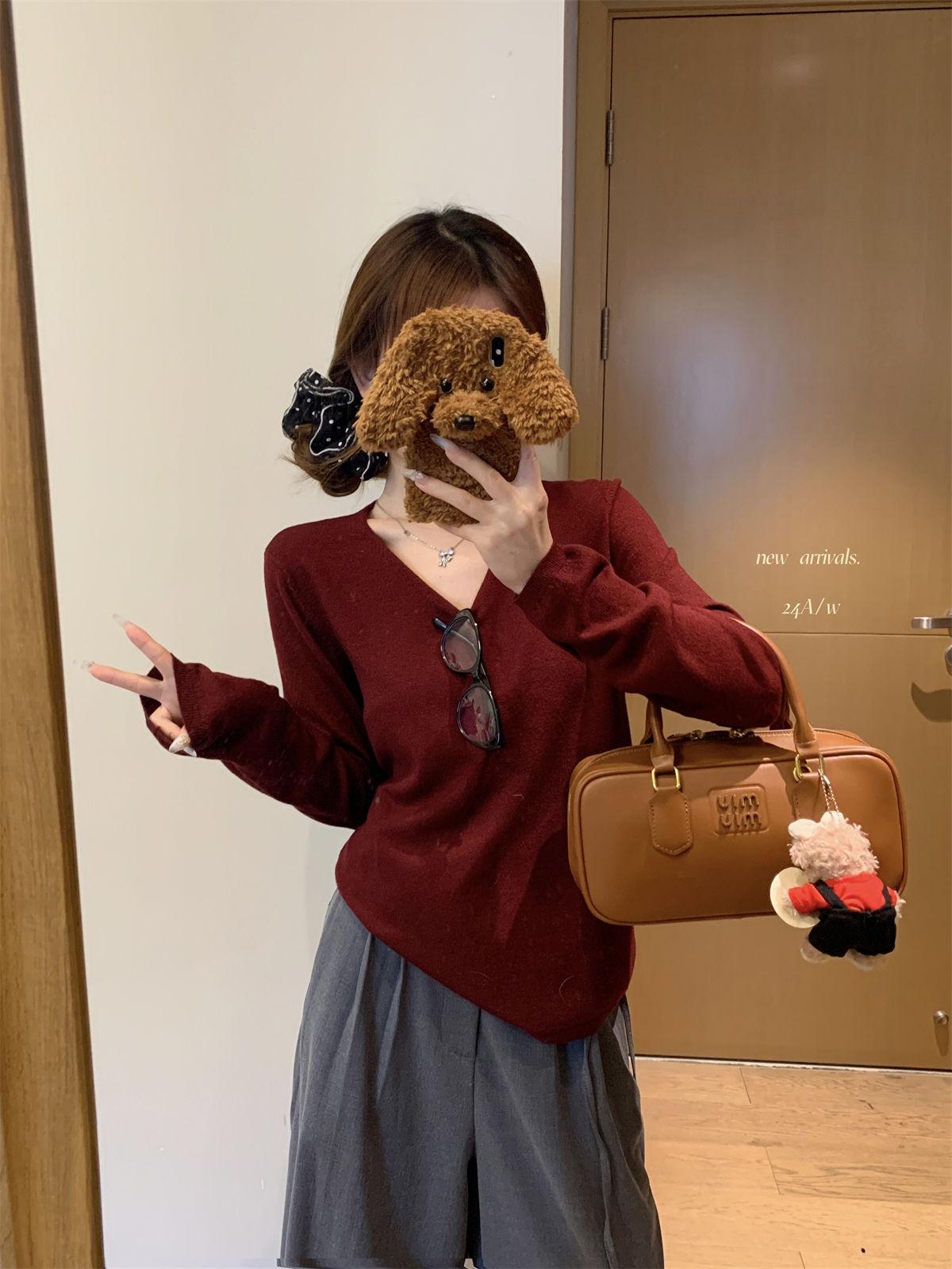 Suéter de Punto Romántico Esponjoso Versátil de Cuello en V Casual de Manga Larga Estilo Francés para Mujer, Elegante Capa Base de Suéter Combinable para Principios de Primavera