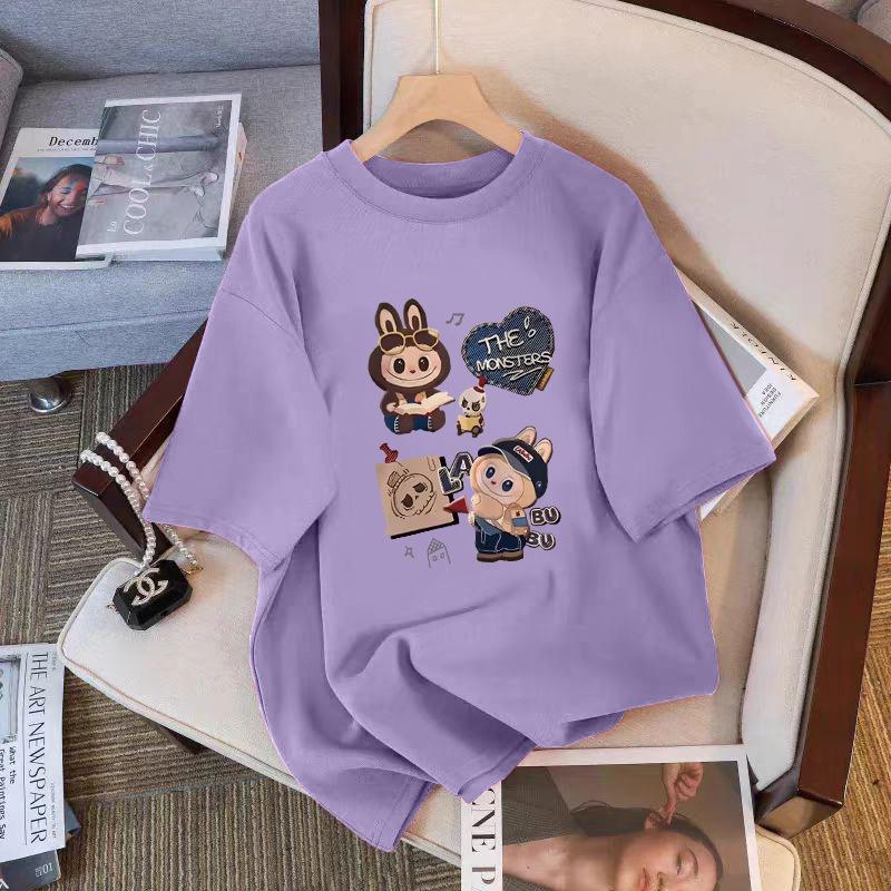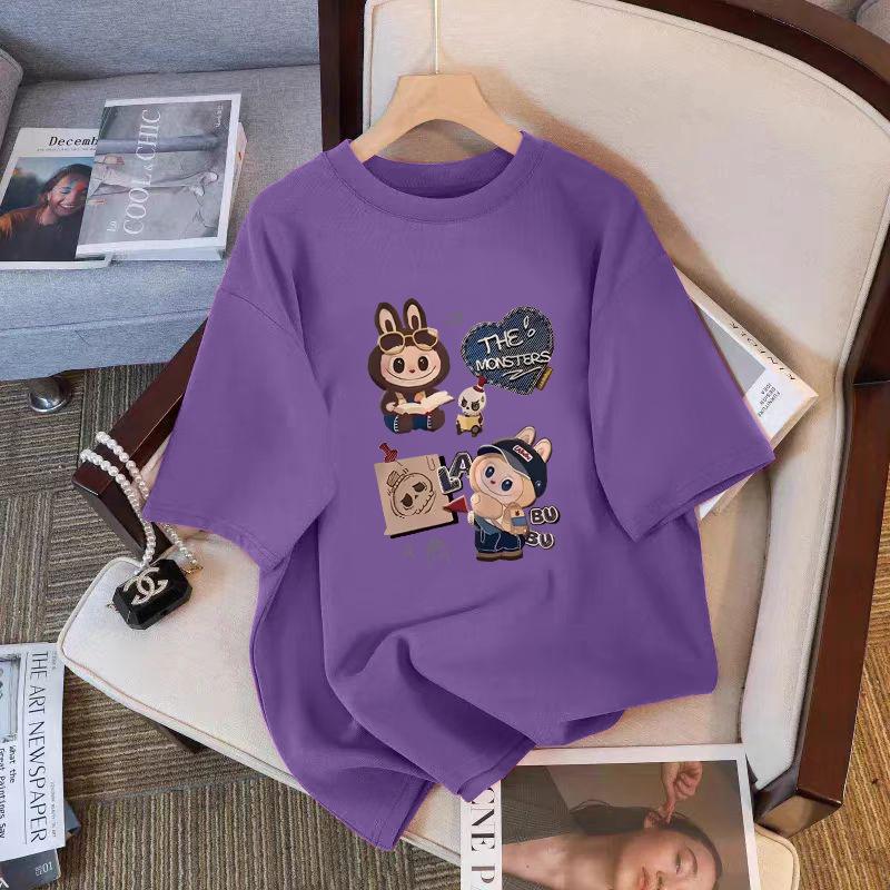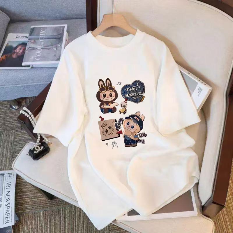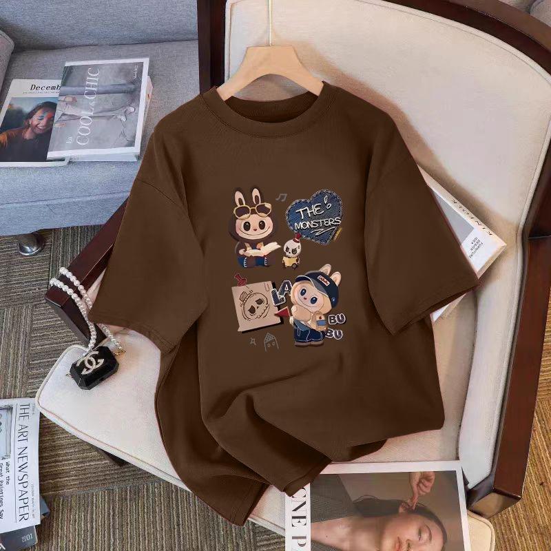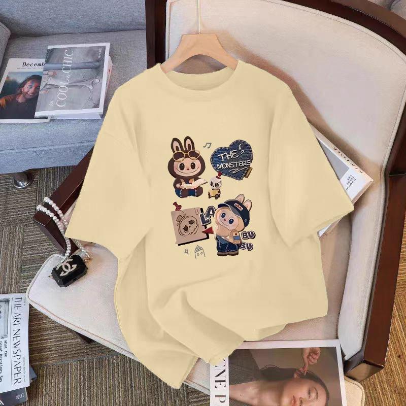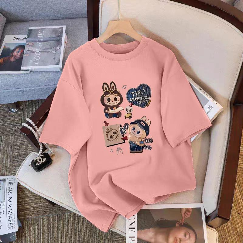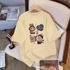 Camiseta de Manga Corta con Estampado de Dibujos Animados para Mujer 100% Algodón Puro Verano Nuevo Estilo Top de Punto Versátil Moda Camiseta Holgada