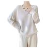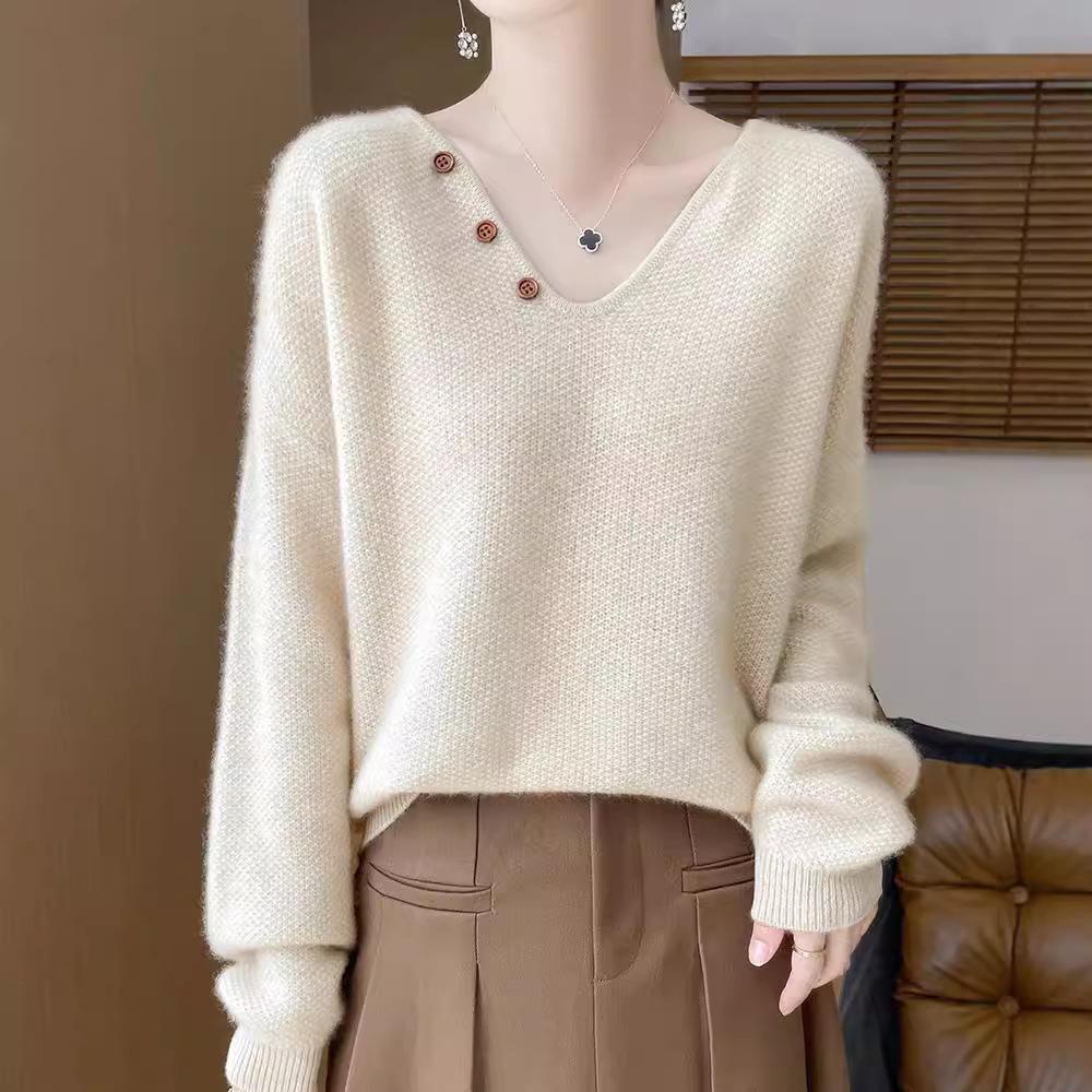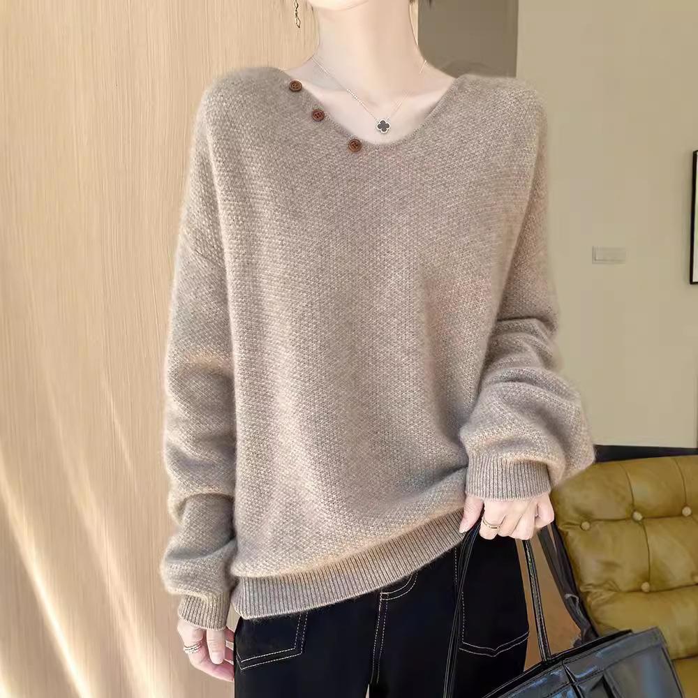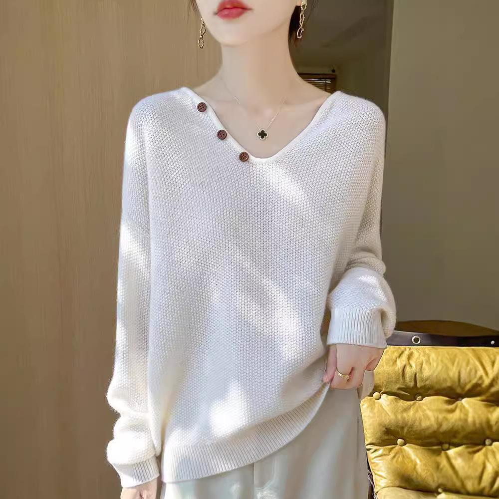 Otoño e Invierno Nuevo Suéter Simple Combinable Suave Ceroso Base Suéter de Punto para Mujer Holgado Adelgazante Color Sólido Cuello en V