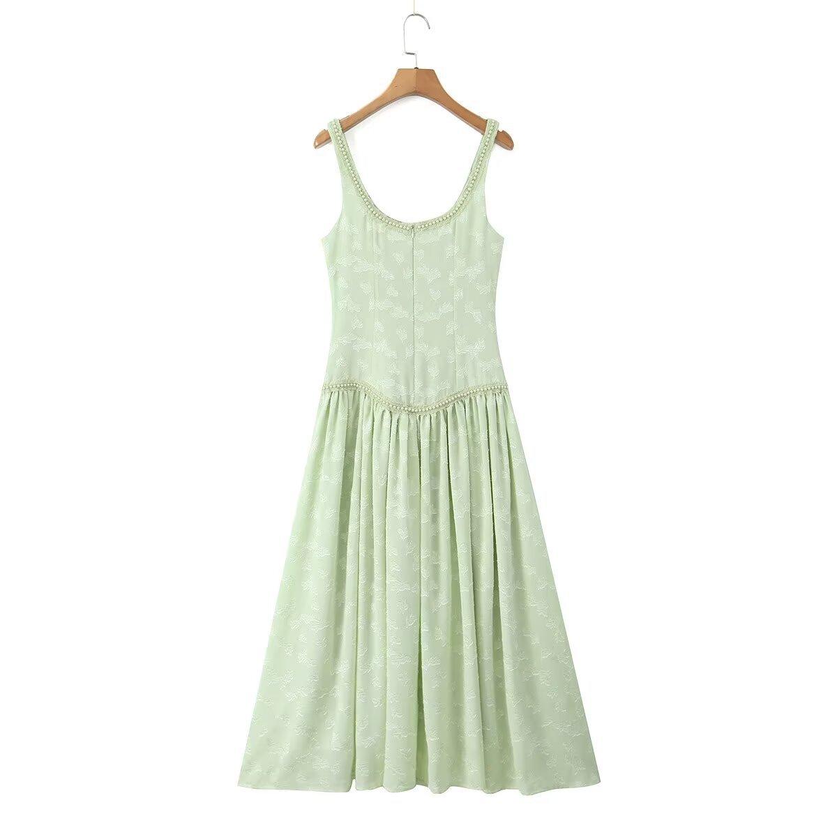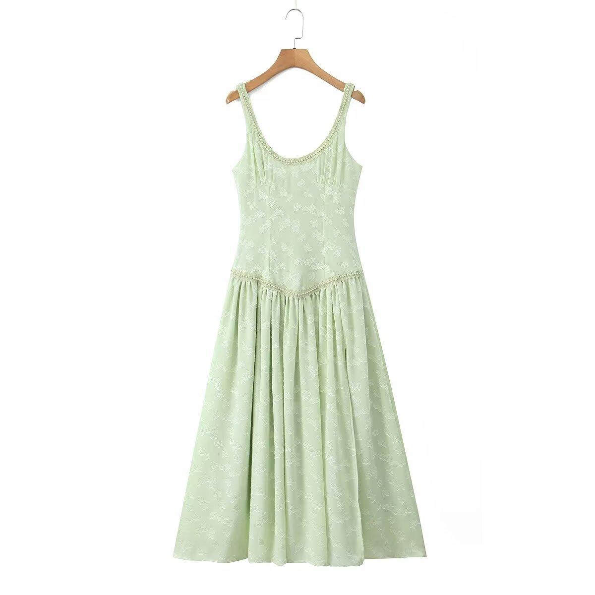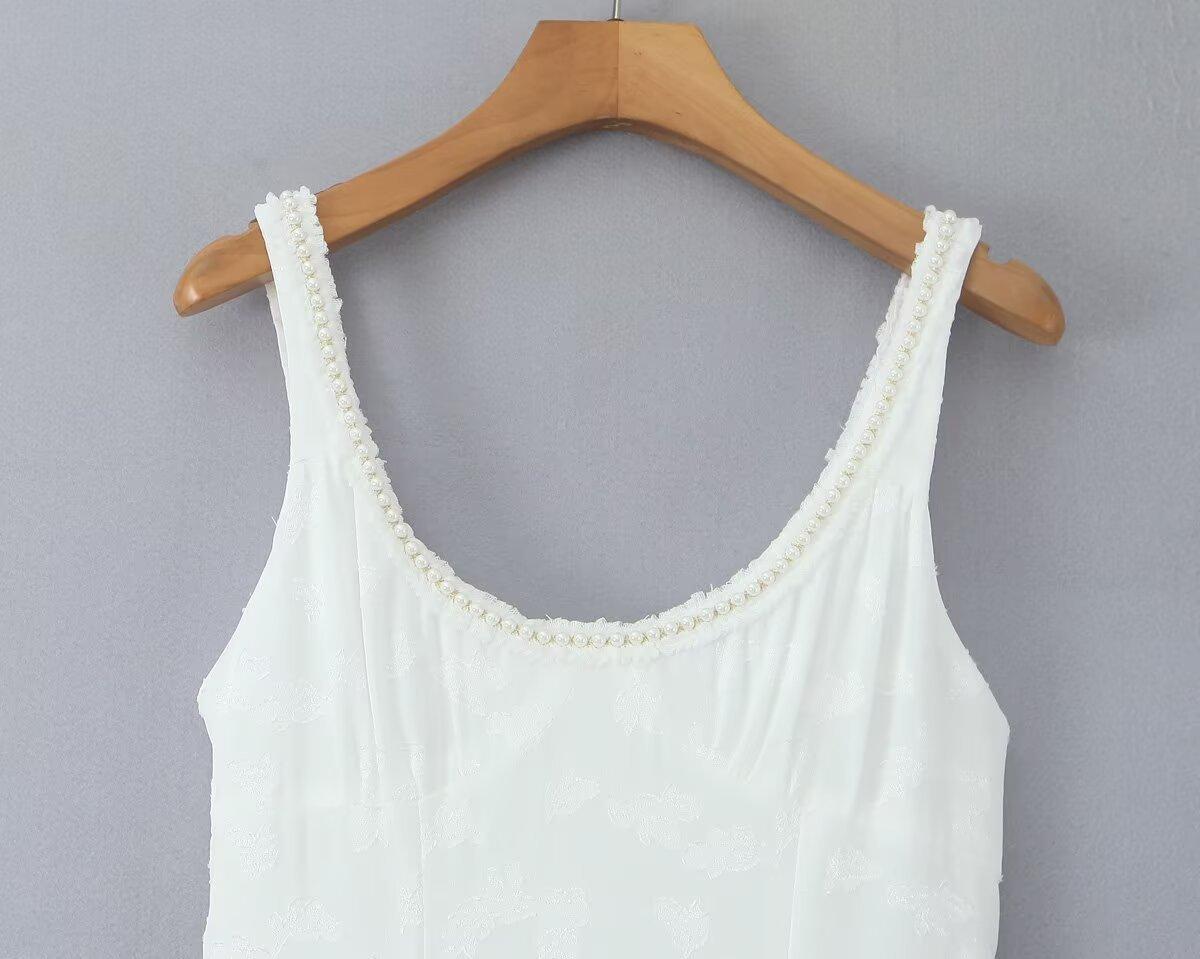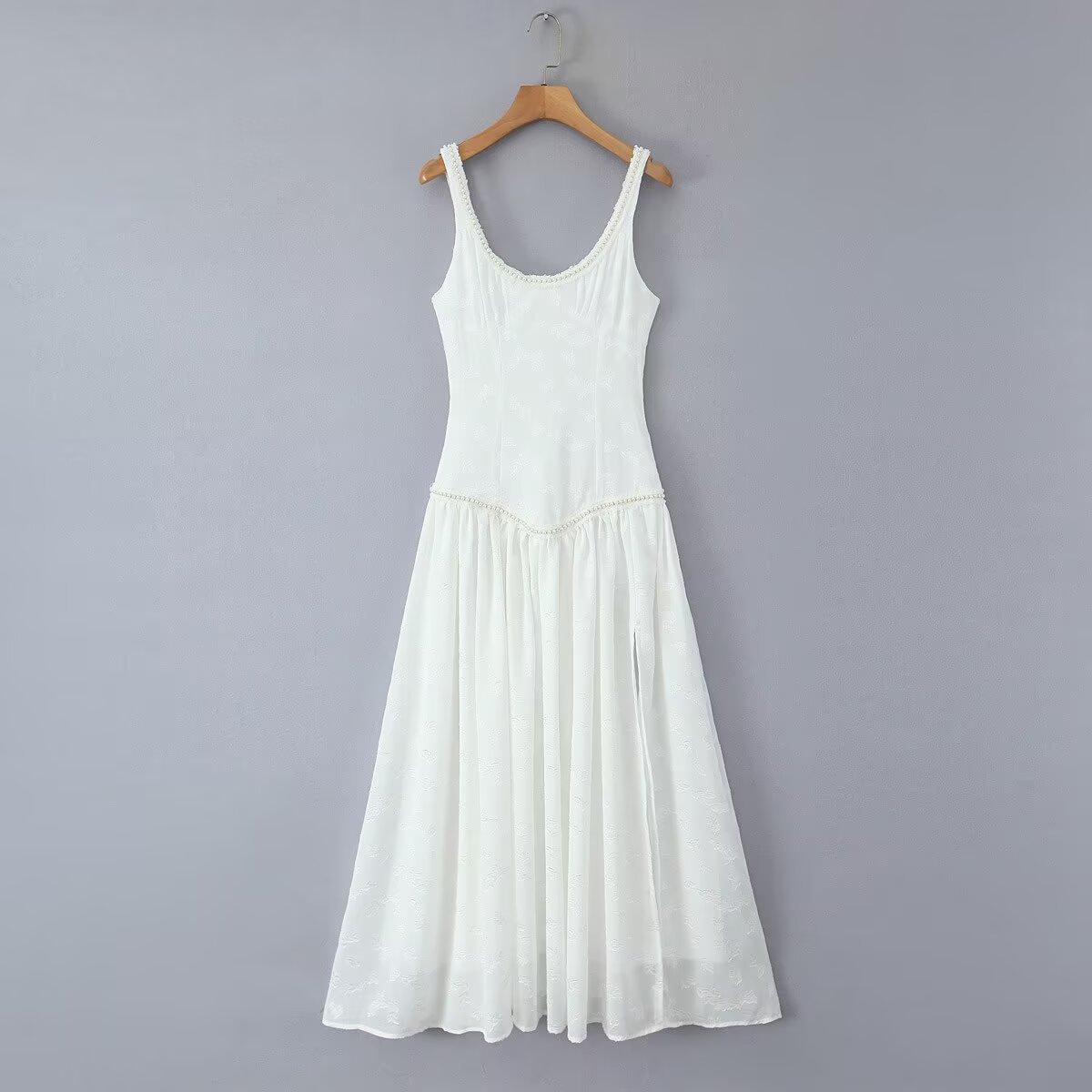 Vestido Largo Sexy con Abertura Estilo Europeo y Americano con Sentido del Diseño Ins Decorado con Perlas Jacquard Vestido de Tirantes para Vacaciones en la Playa de Mujer