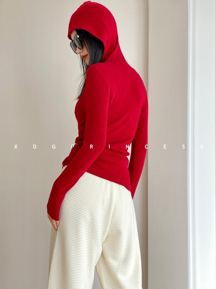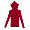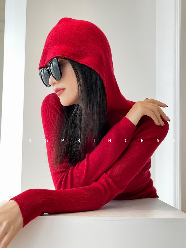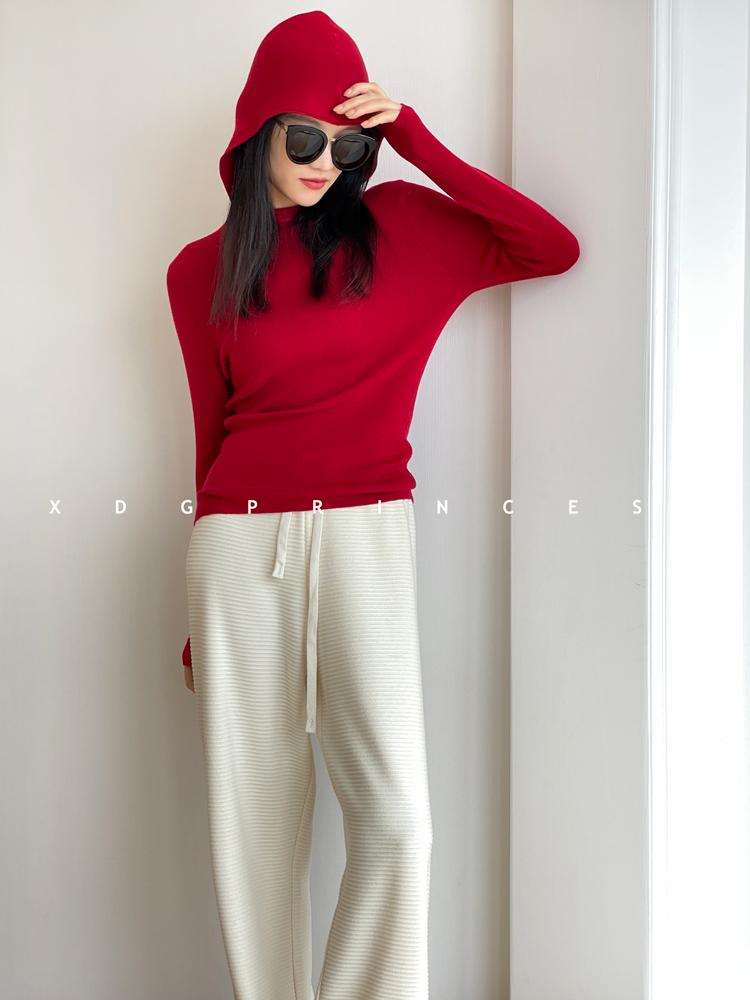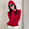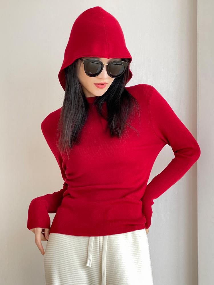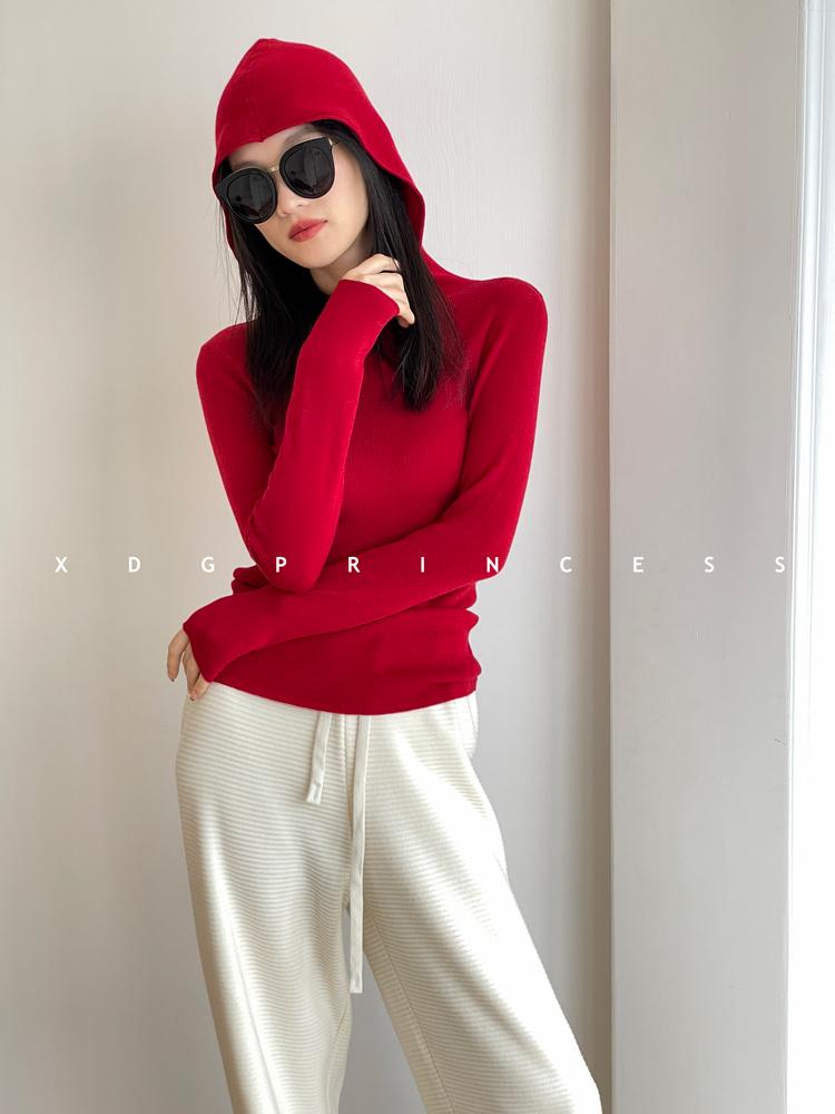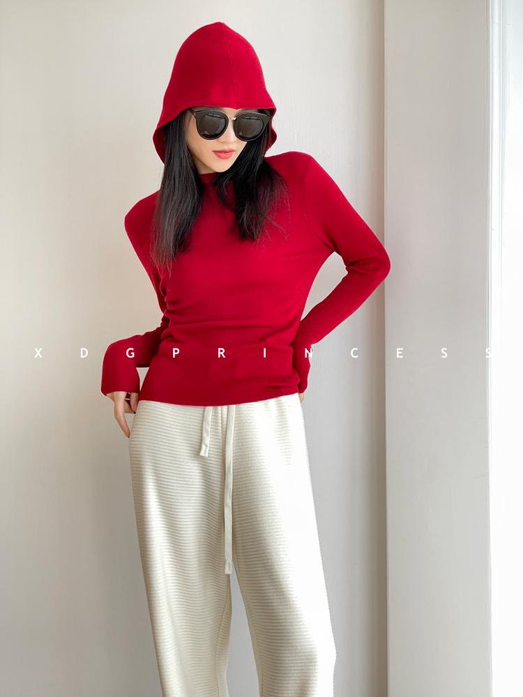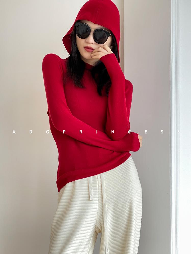 Nueva Ropa de Punto con Capucha Roja para Mujer en Otoño e Invierno Nueva Ropa de Punto Base Interior de Corte Slim Jersey de Manga Larga