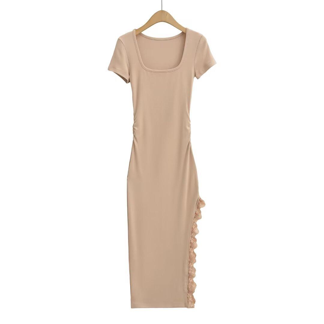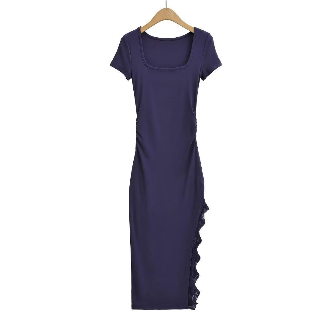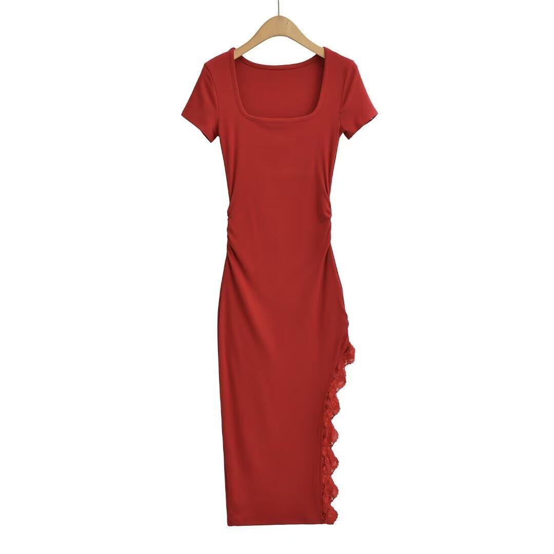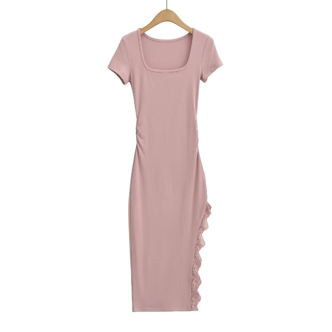 Vestido Spice Girl Cuello Cuadrado Puro Adelgazante Ajustado Encaje Lateral Manga Corta Sexy Cintura Ajustada Abertura Lateral Falda de Cadera