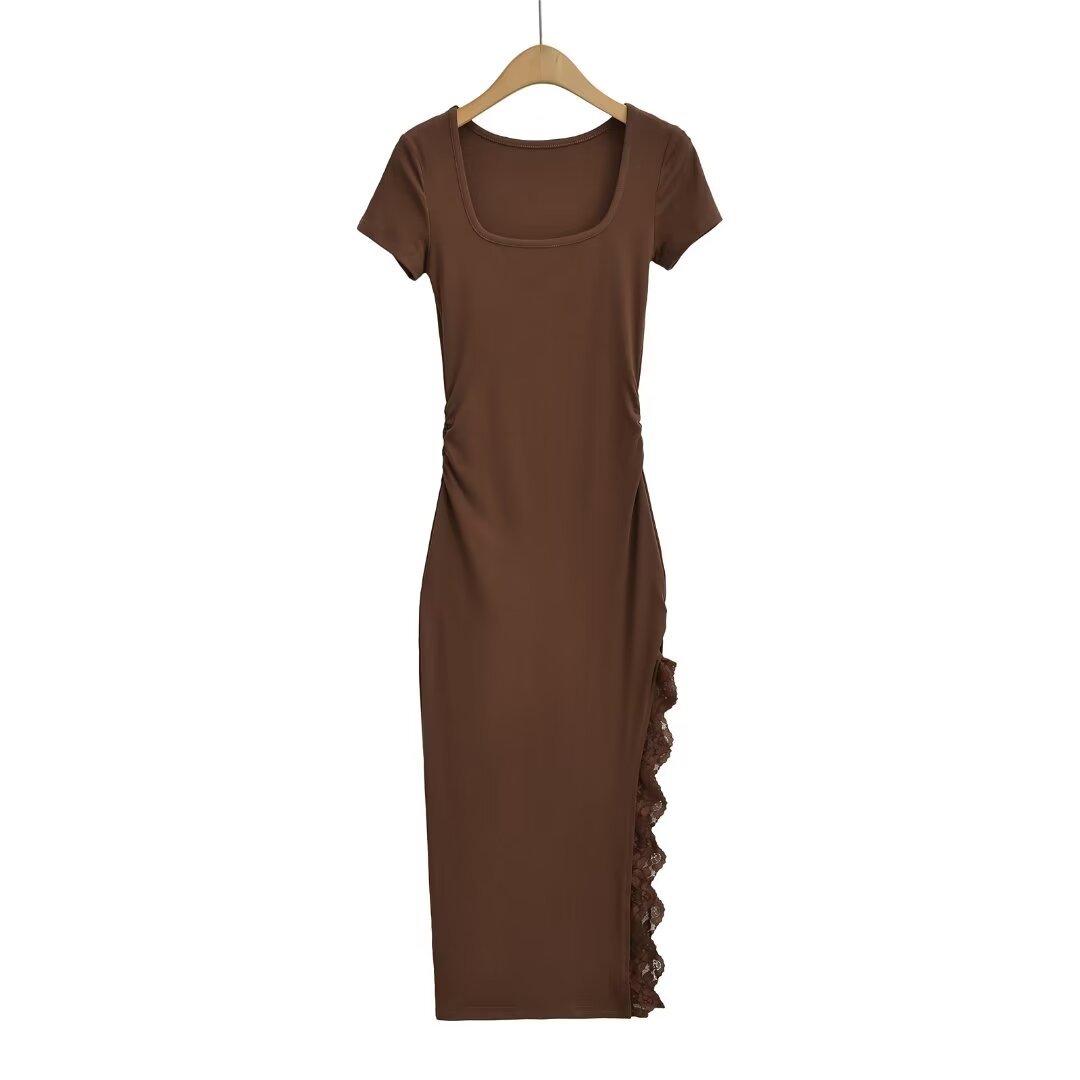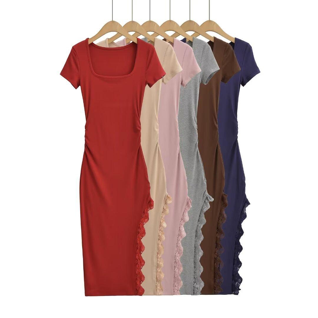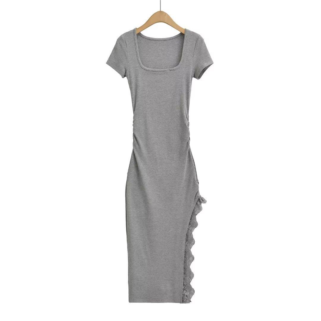 Vestido Spice Girl Cuello Cuadrado Puro Adelgazante Ajustado Encaje Lateral Manga Corta Sexy Cintura Ajustada Abertura Lateral Falda de Cadera