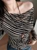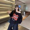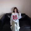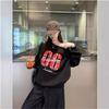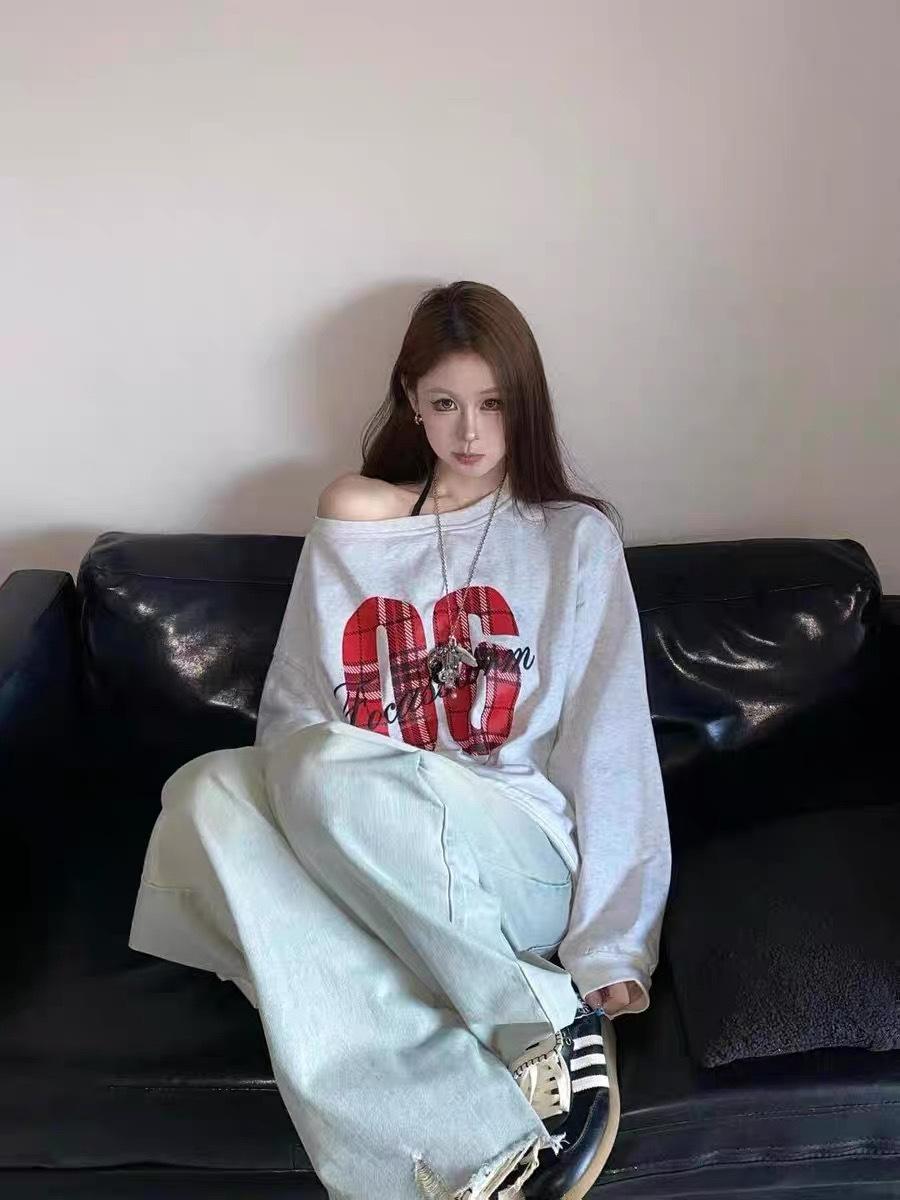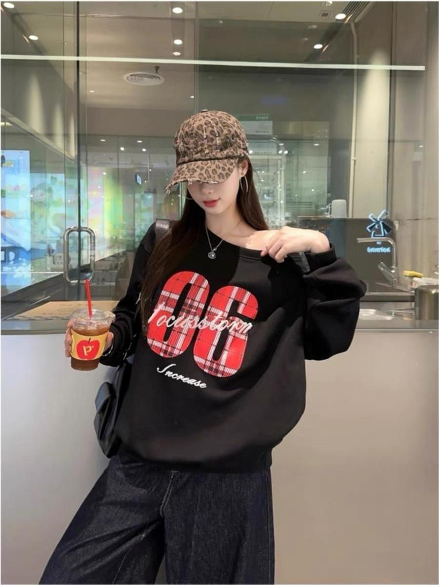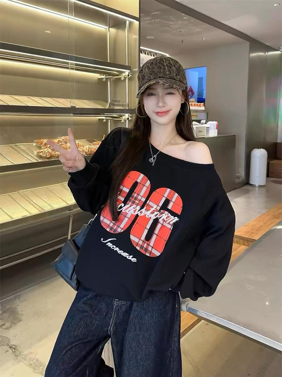 Sudadera de Hombro Inclinado Estampada American Hot Girl Otoño 2024 Nuevo Diseño Holgado Perezoso Manga Larga Top Descubierto de Hombro Moderno Cool