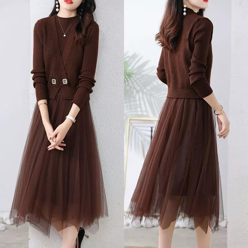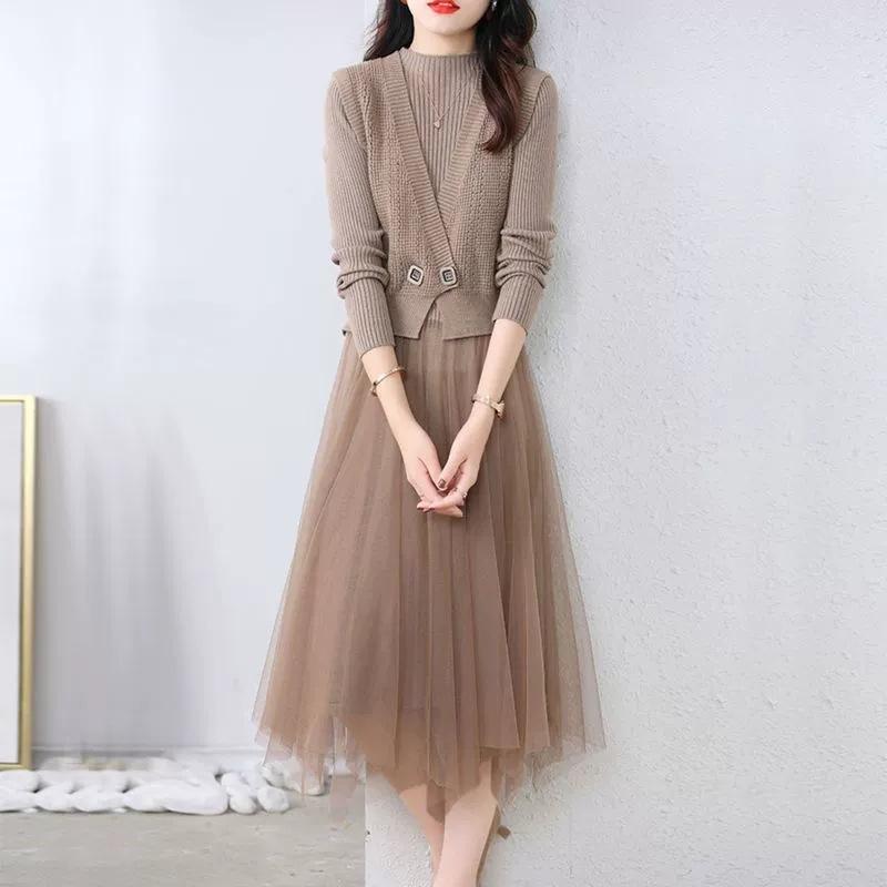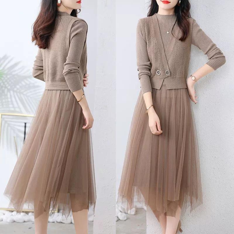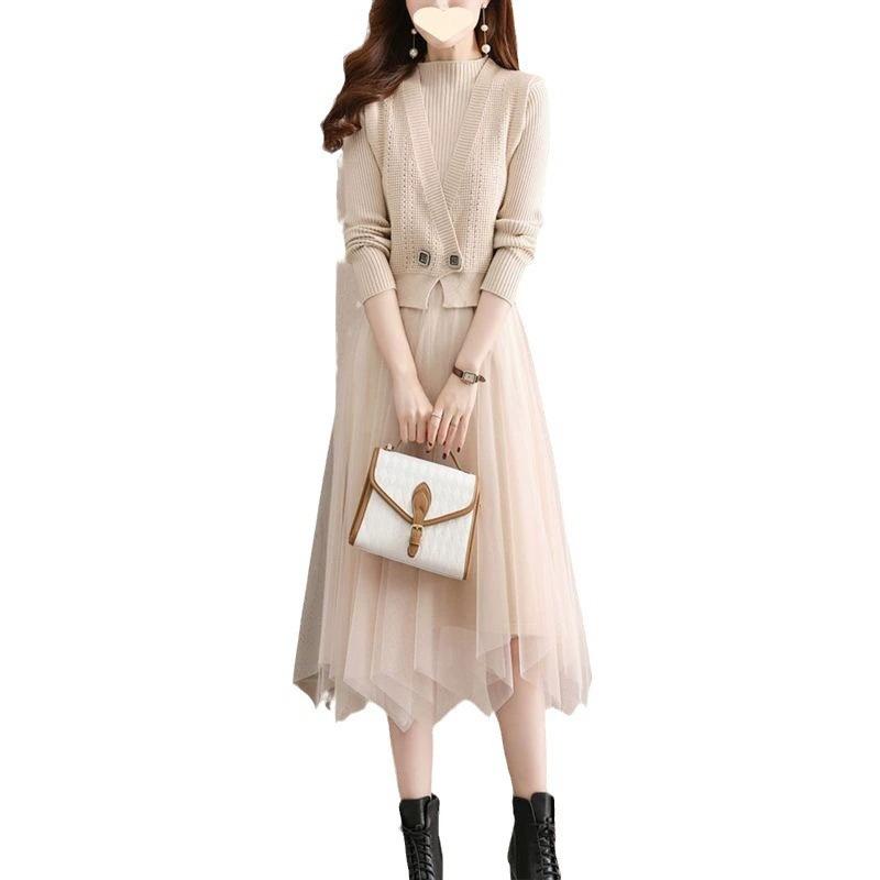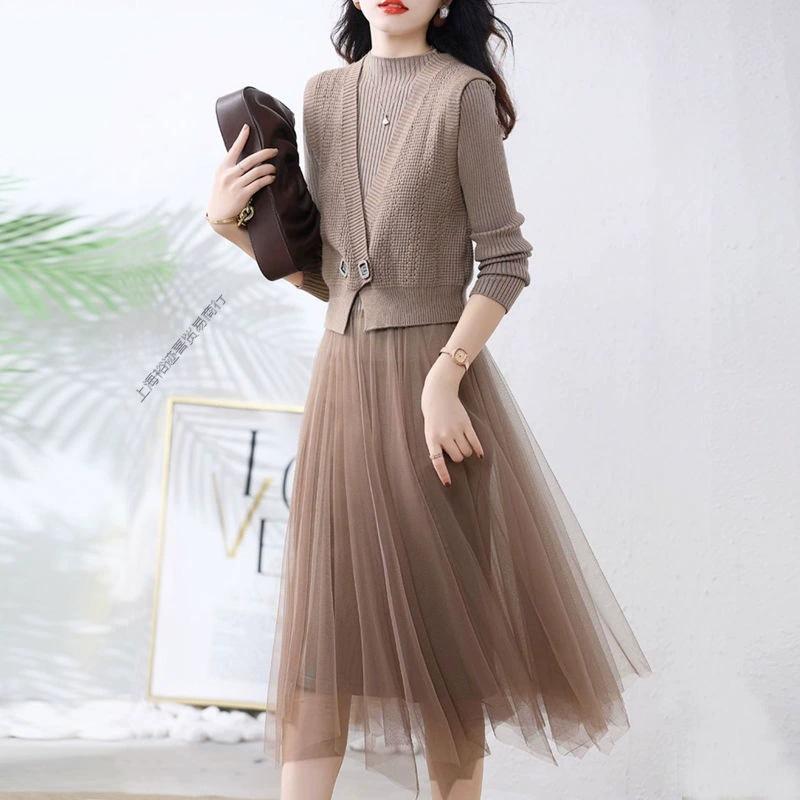 Vestido Fresco de Otoño e Invierno Ropa de Otoño para Mujer 2025 Nuevo Estilo Traje de Dos Piezas Tejido de Alta Gama Falda