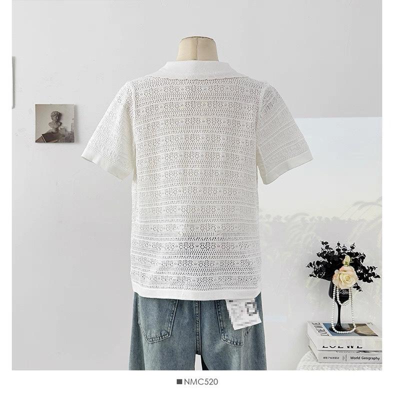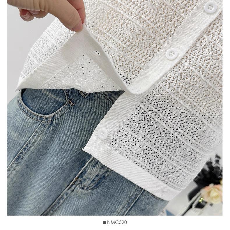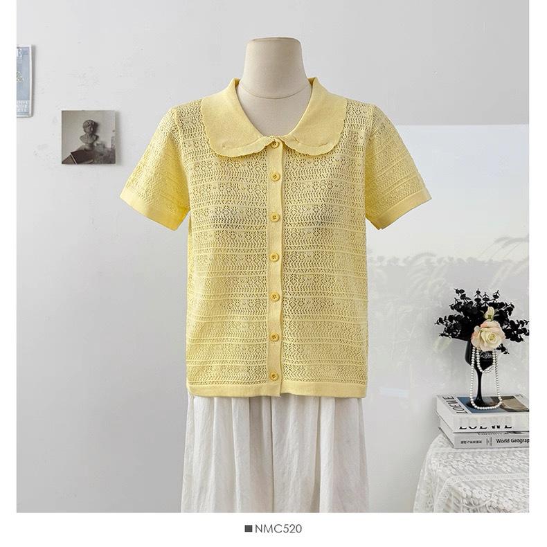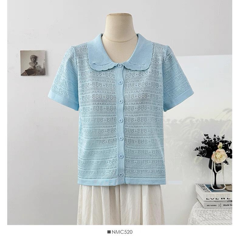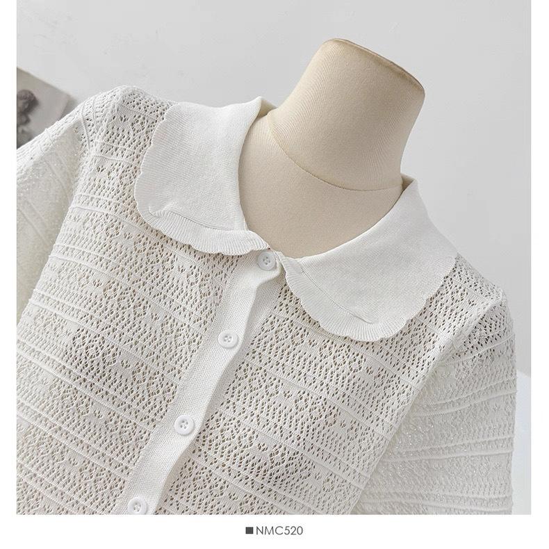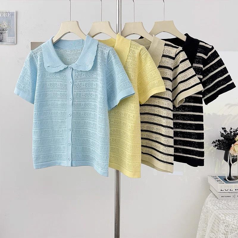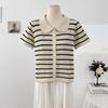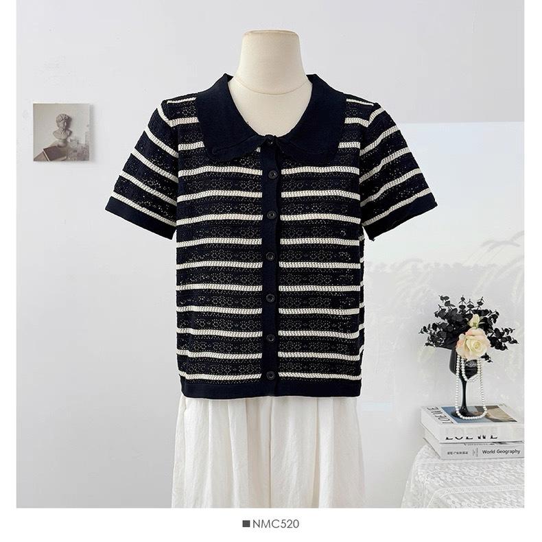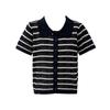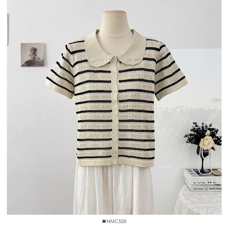 Cárdigan de Punto de Manga Corta con Cuello Peter Pan a Rayas con Bloque de Color Estilo Preppy Coreano Verano Nuevo Top Adelgazante Calado
