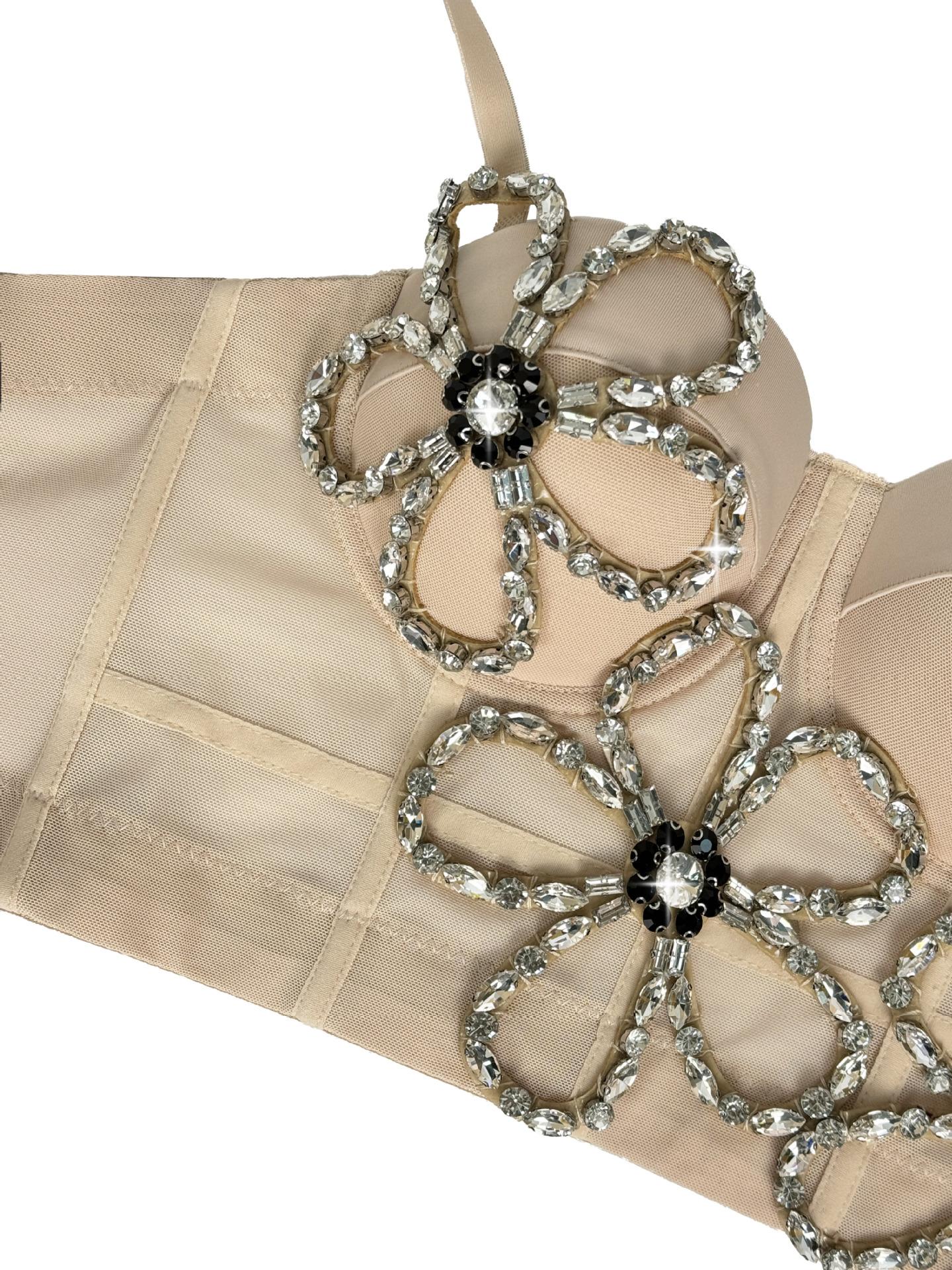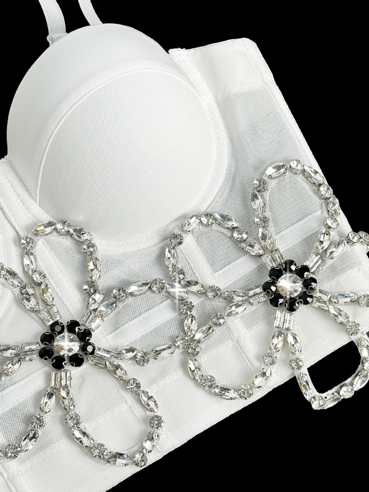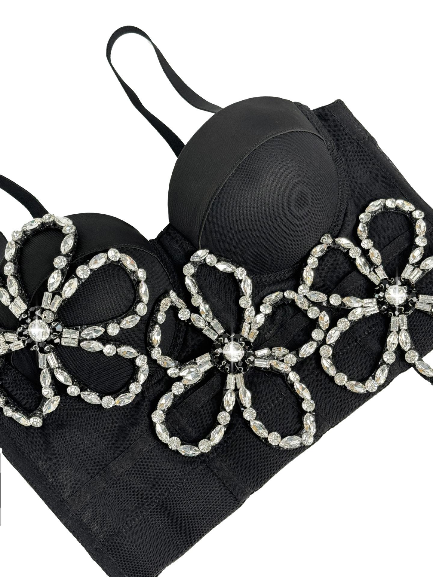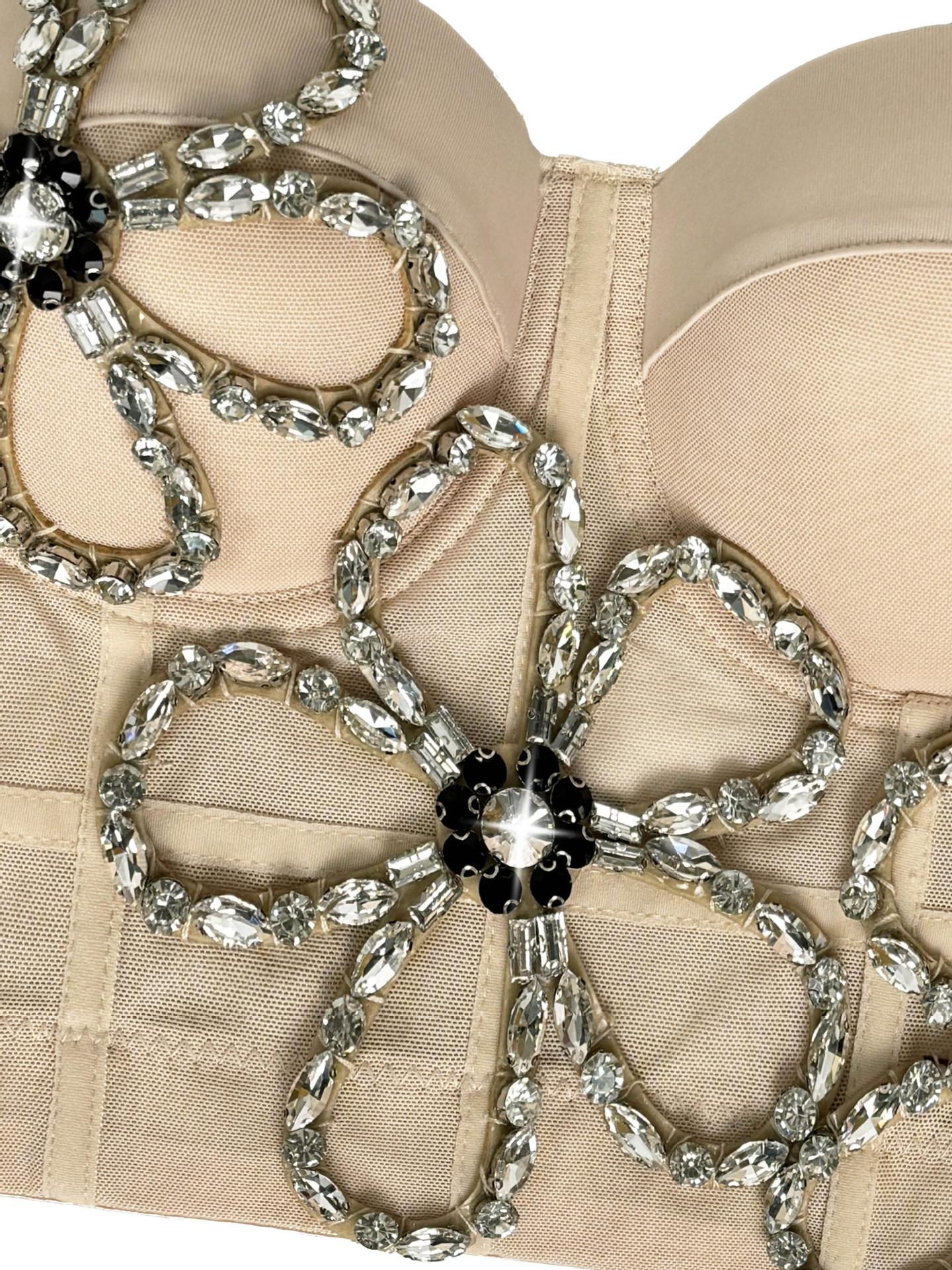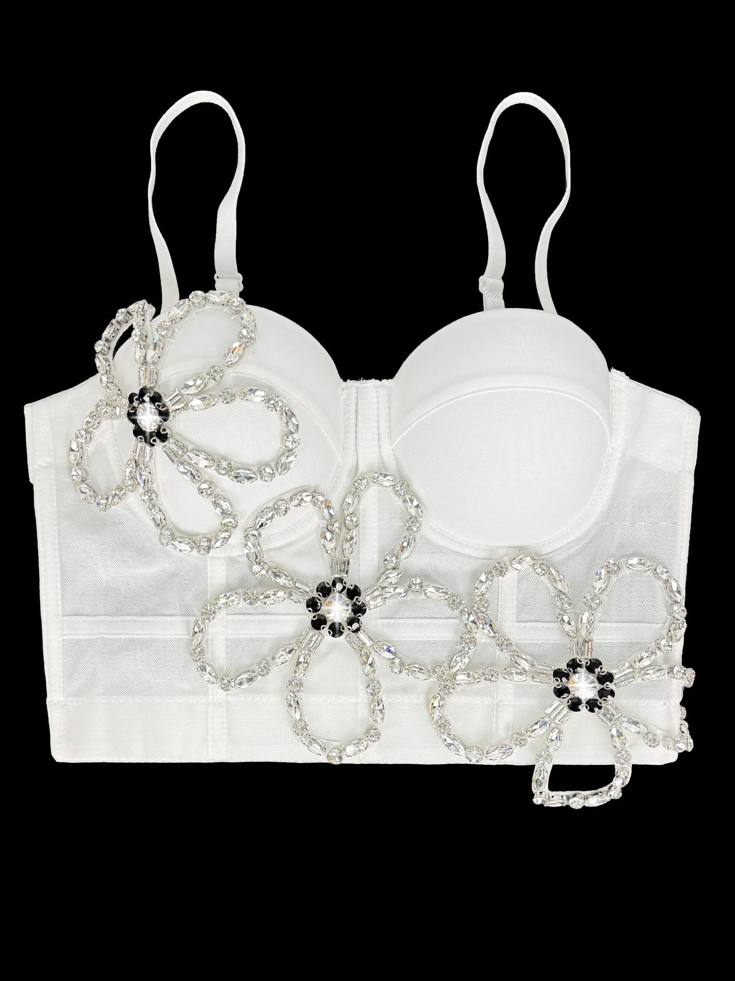 Nuevo corsé de espina de pescado con flores de diamantes transfronterizo con copas acolchadas, prenda exterior, camisola ajustada, top de espina de pescado de malla semitransparente sin espalda