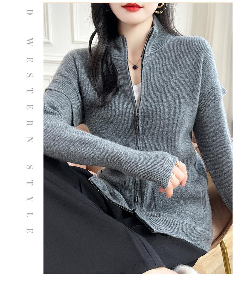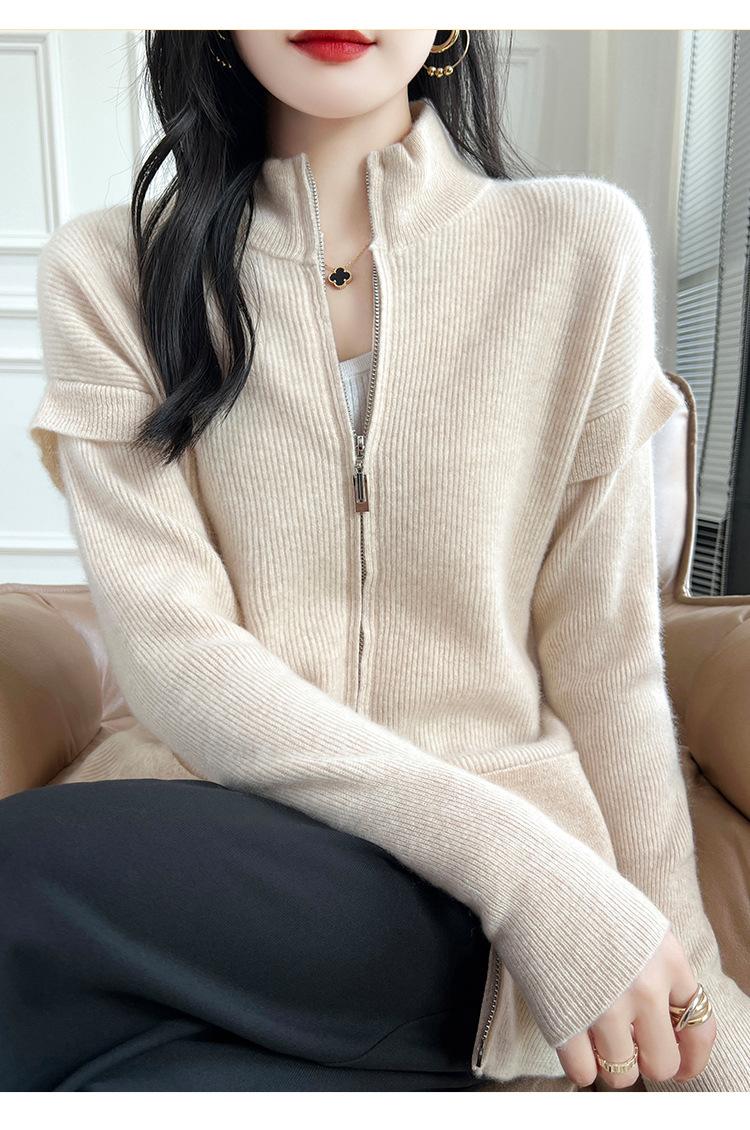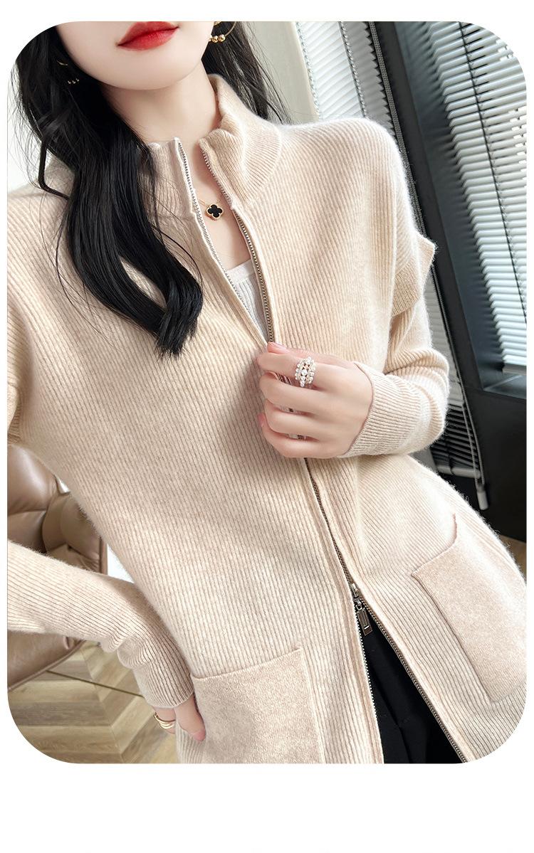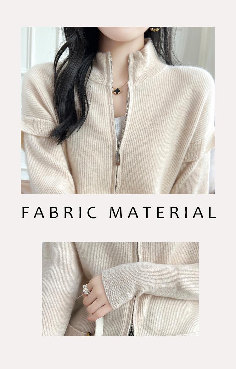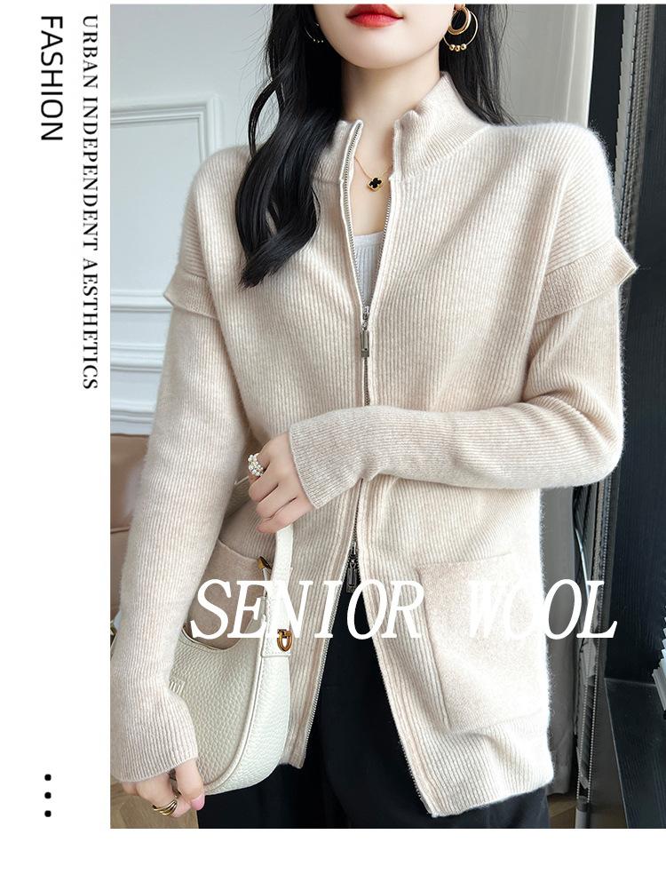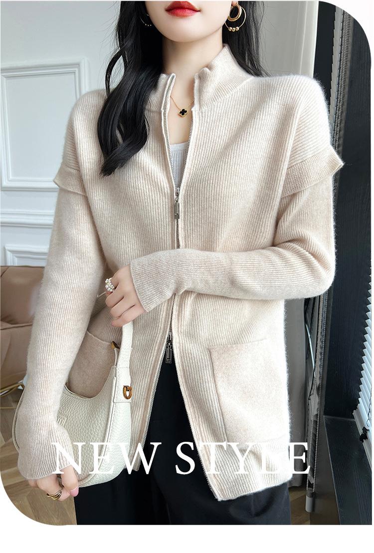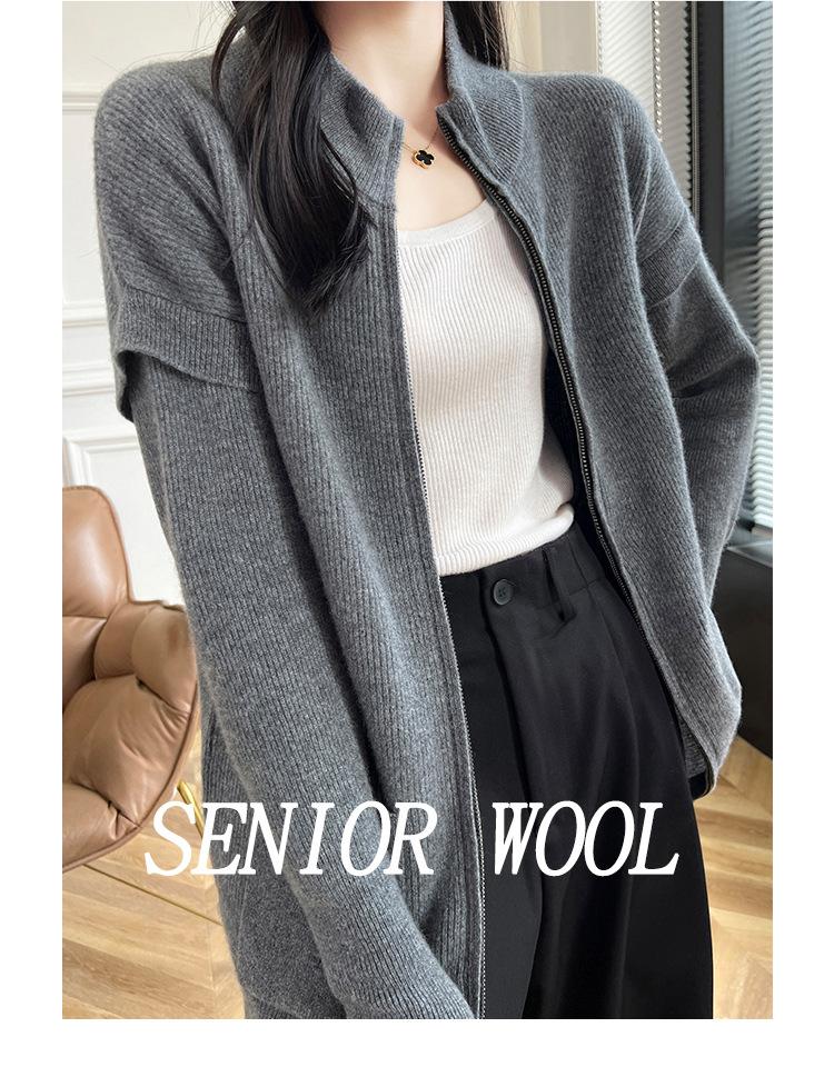 Otoño e Invierno 2024 Nuevo Cárdigan de Punto de Lana Pura con Cuello Redondo Semi-alto, Bolsillo con Doble Cremallera, Top Casual Holgado