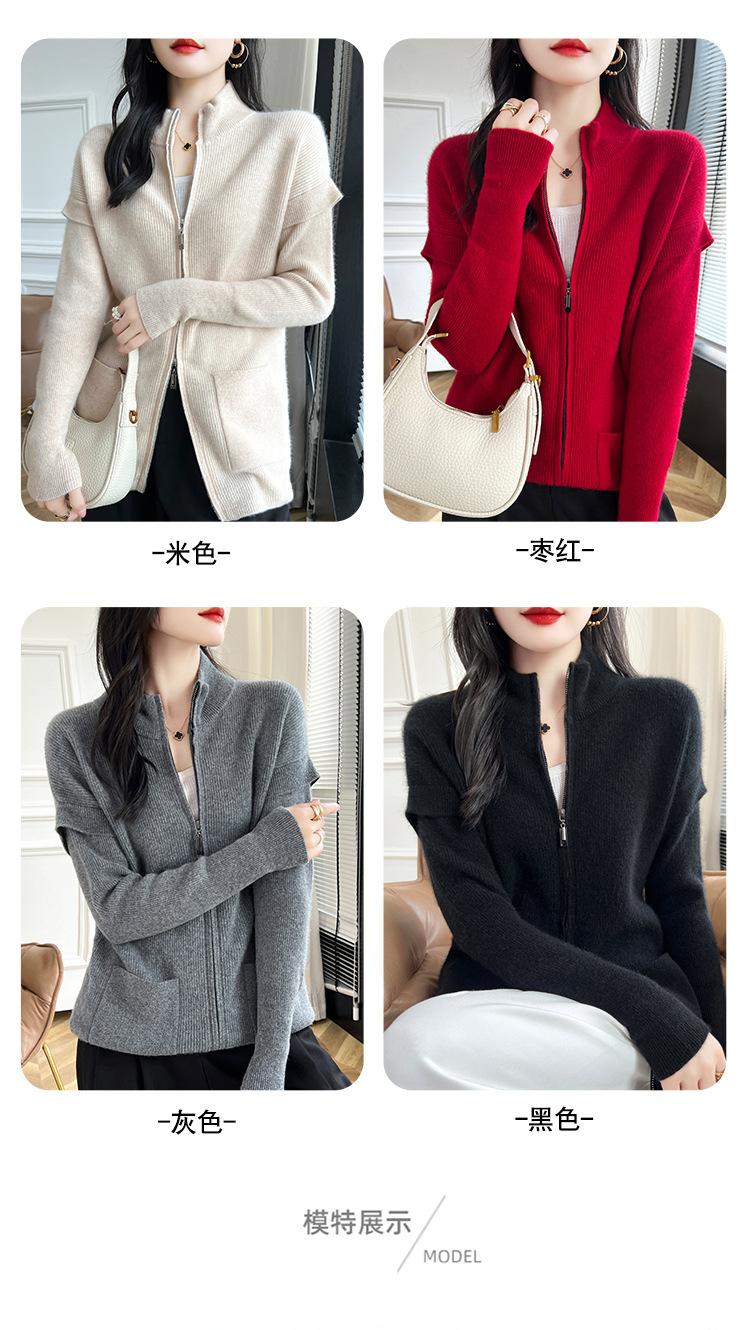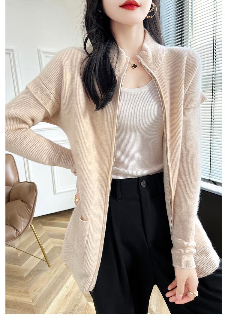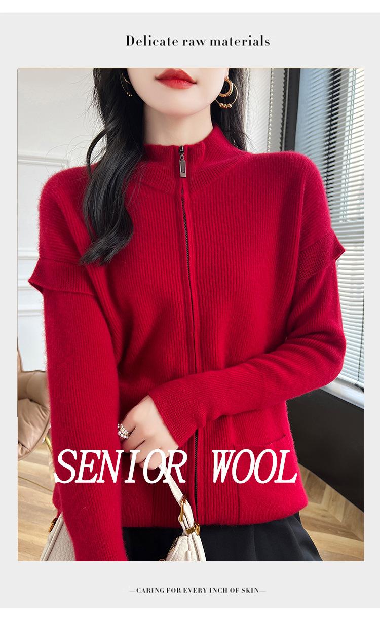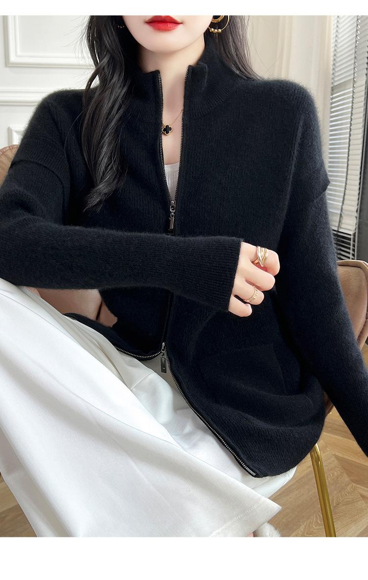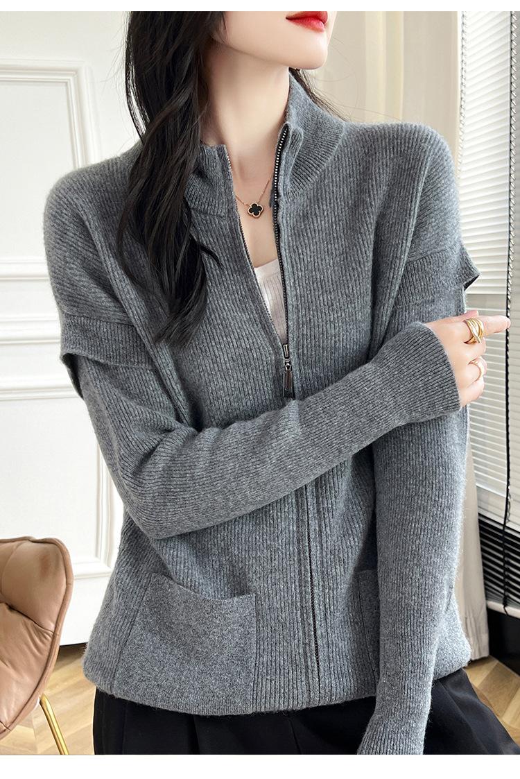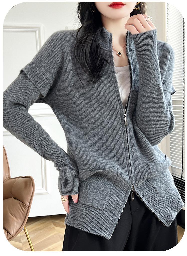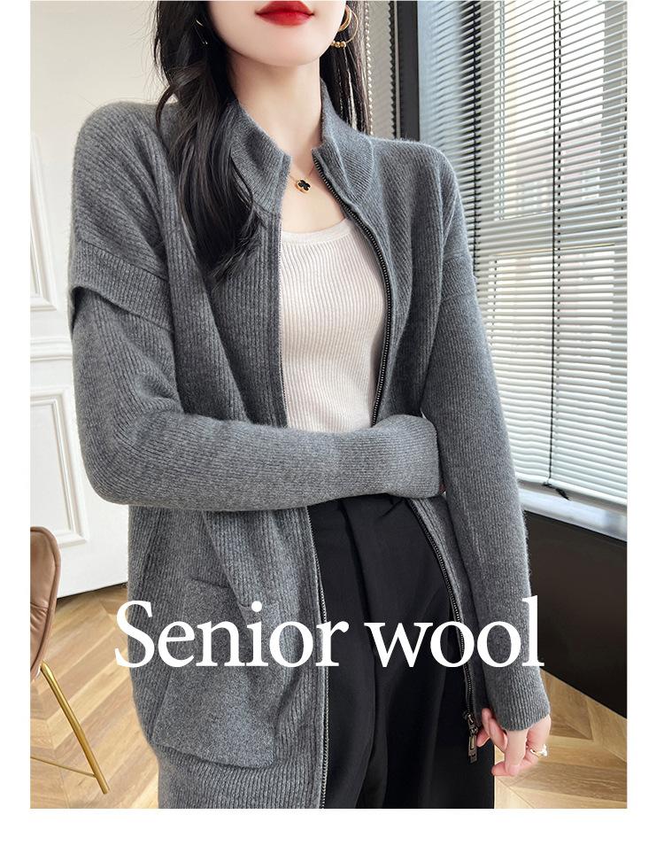 Otoño e Invierno 2024 Nuevo Cárdigan de Punto de Lana Pura con Cuello Redondo Semi-alto, Bolsillo con Doble Cremallera, Top Casual Holgado