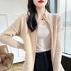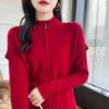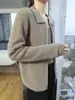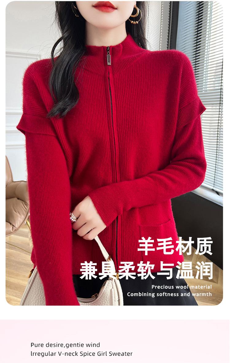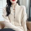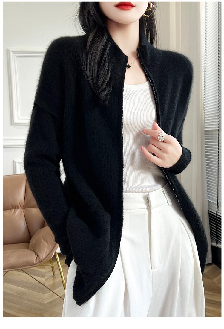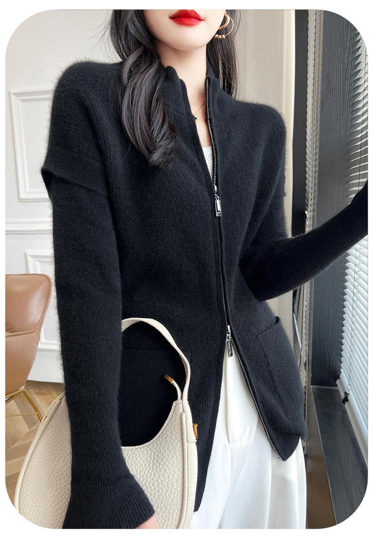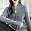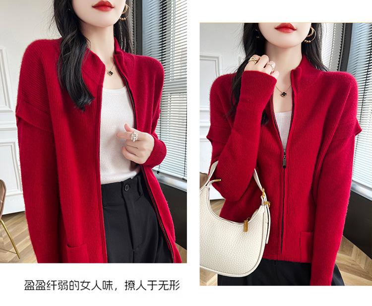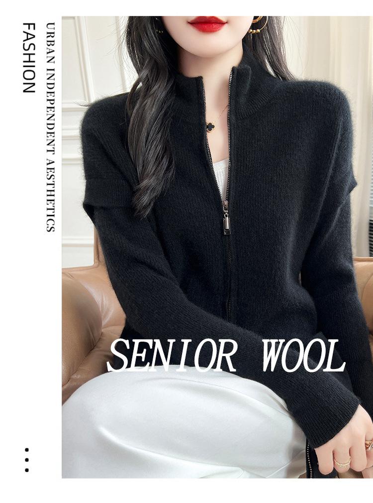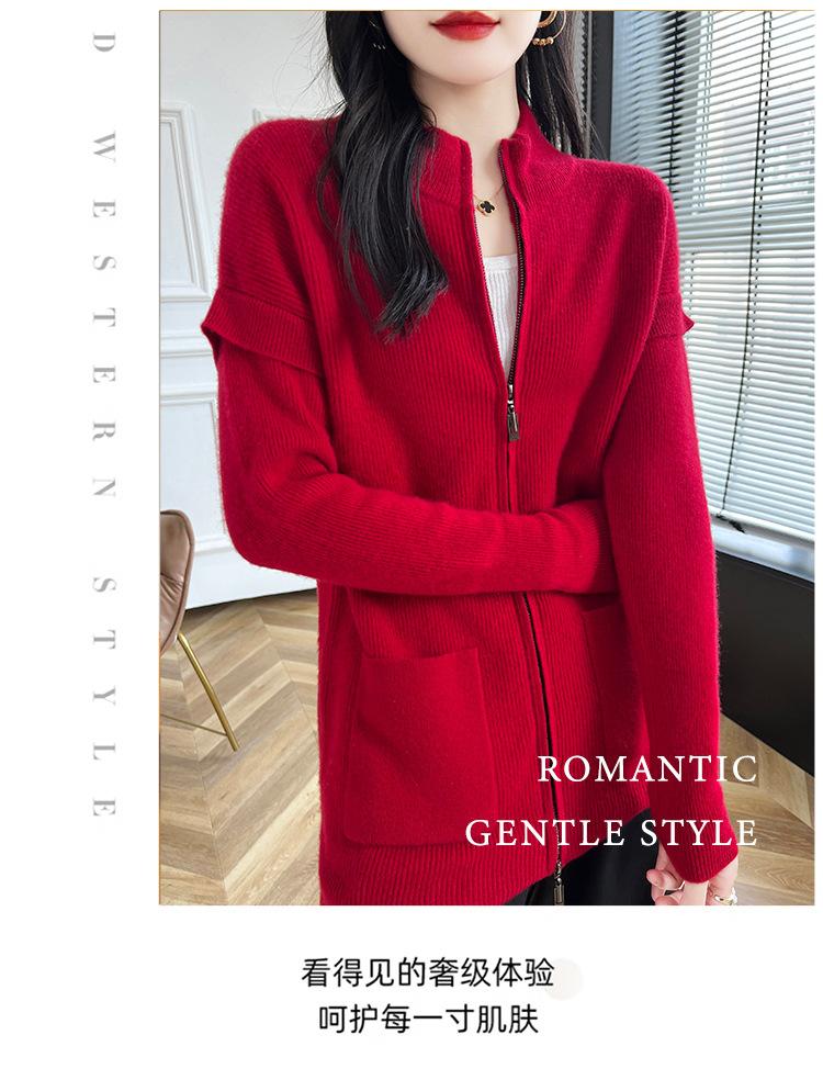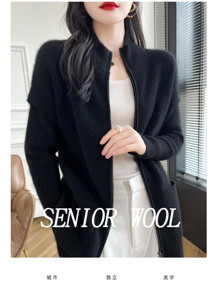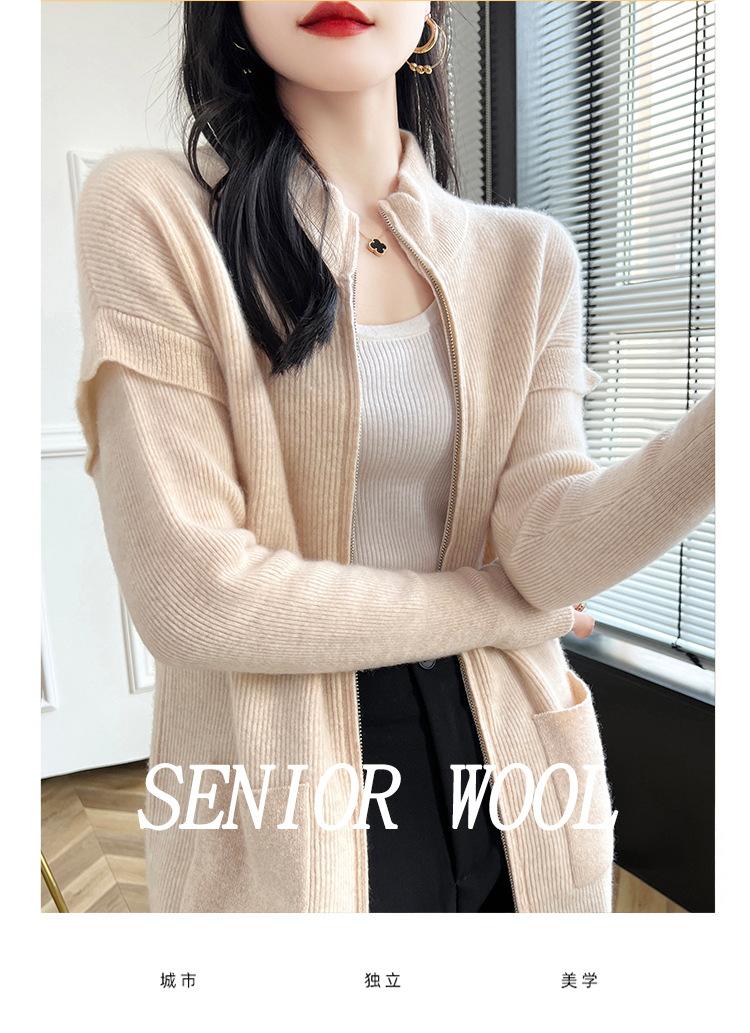 Otoño e Invierno 2024 Nuevo Cárdigan de Punto de Lana Pura con Cuello Redondo Semi-alto, Bolsillo con Doble Cremallera, Top Casual Holgado
