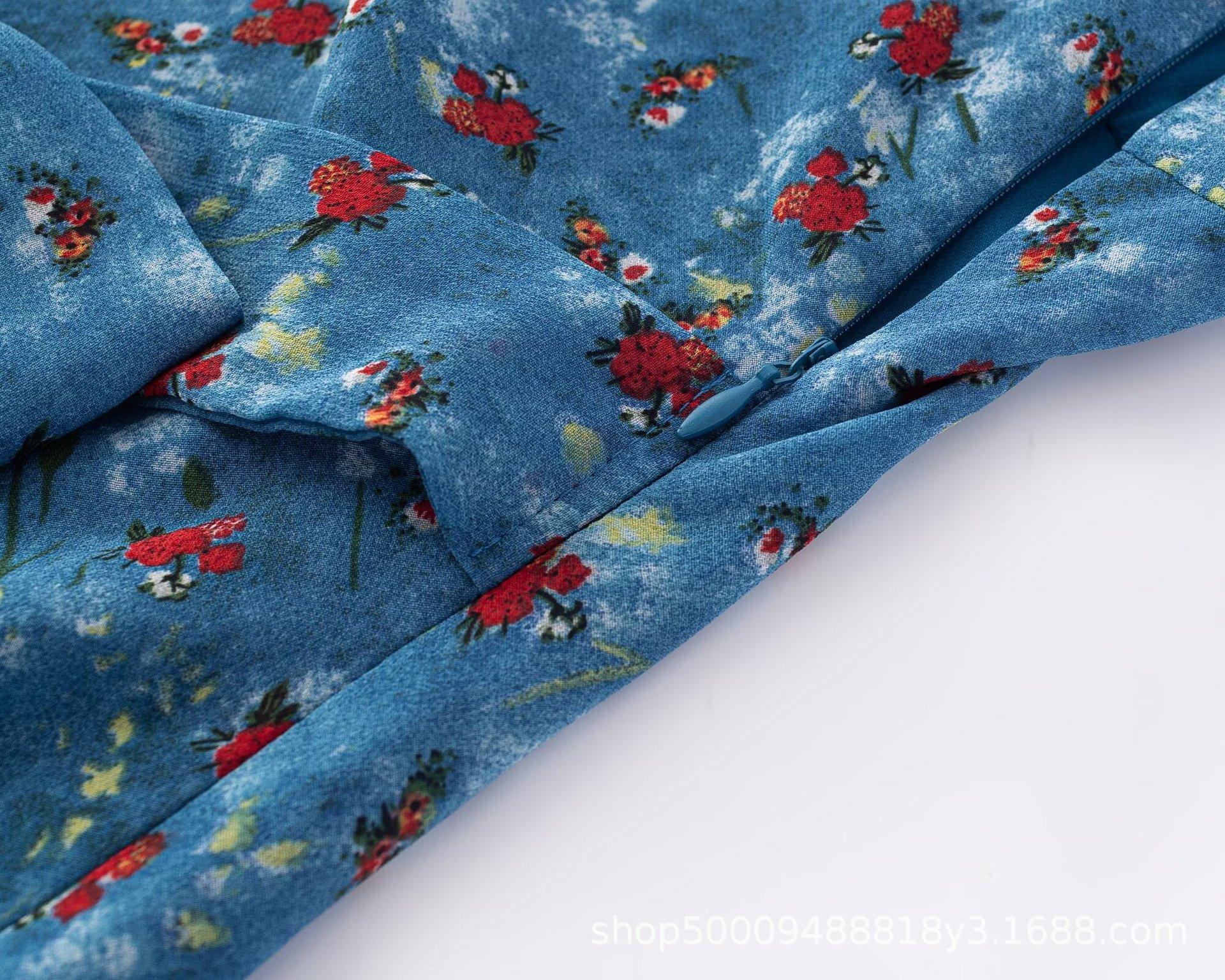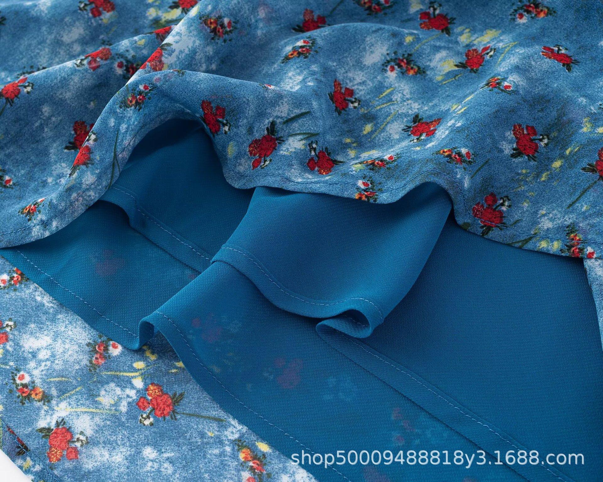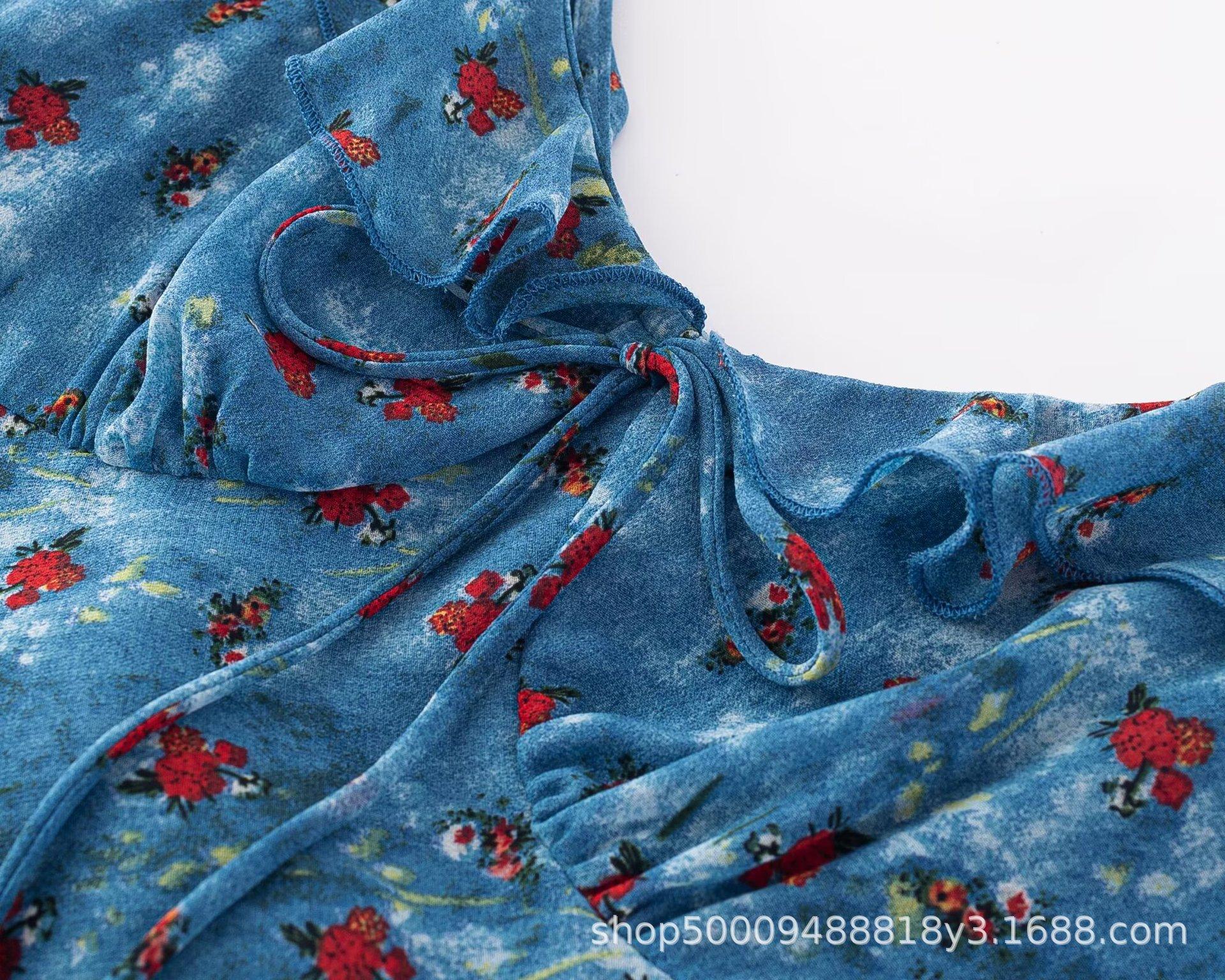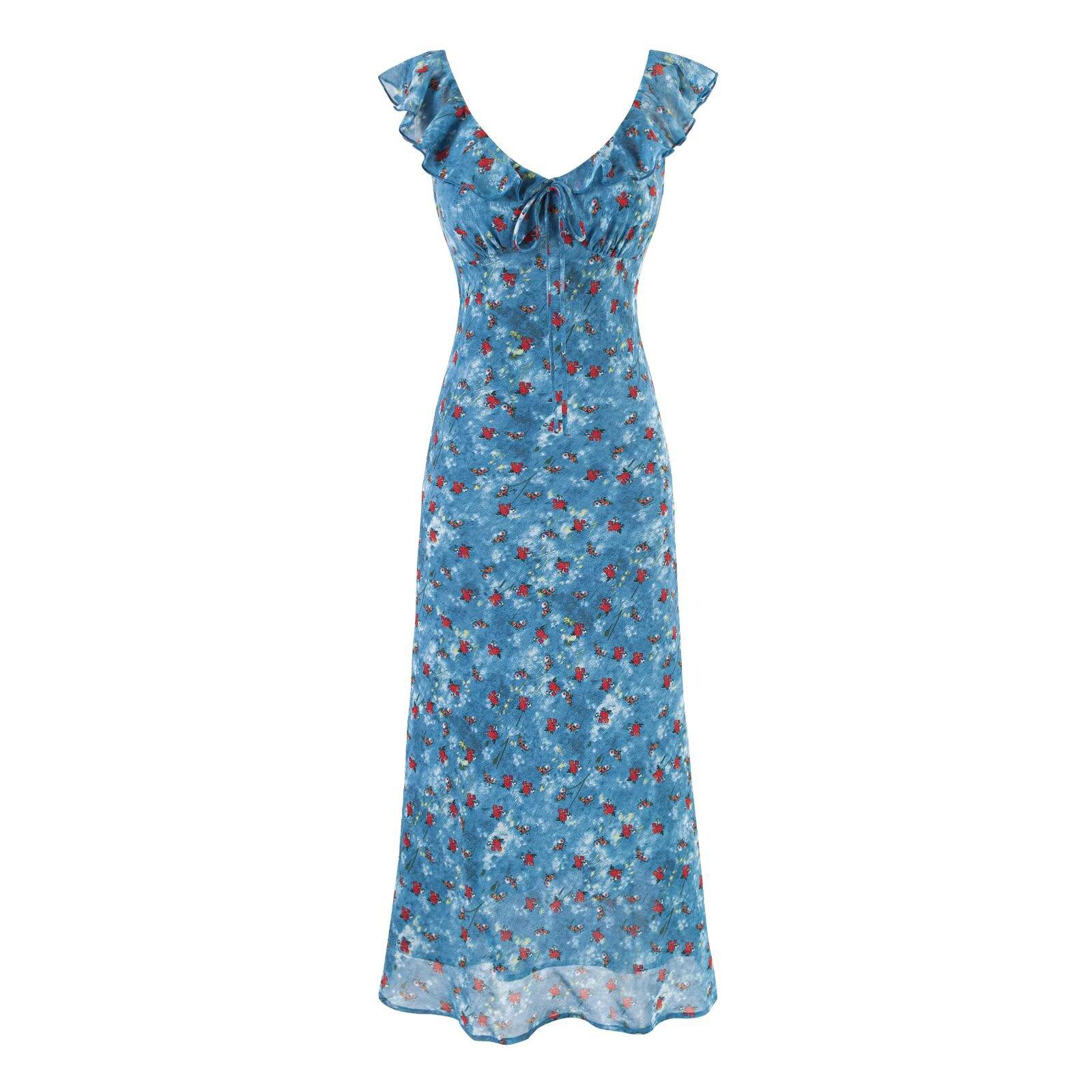 Vestido Azul Estilo Resort con Estampado y Cintura Fruncida para Mujer 2025 Nuevo Estilo Vestido Suave Cuello en V Francés Falda Larga