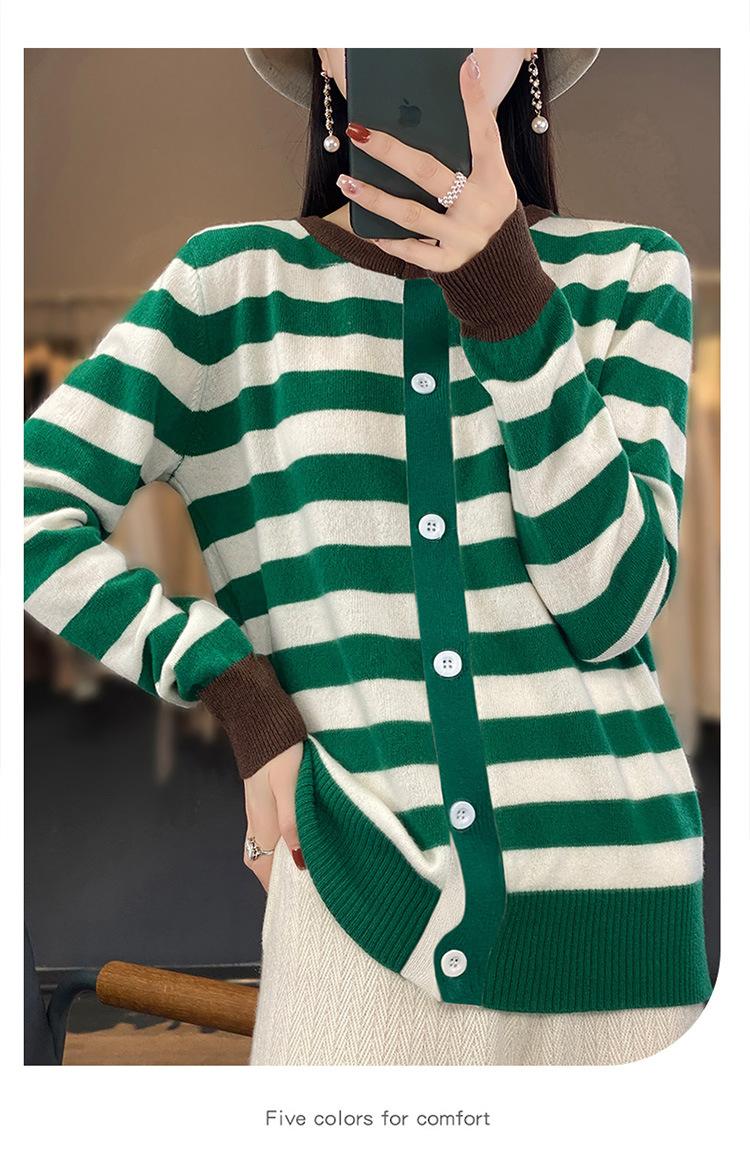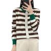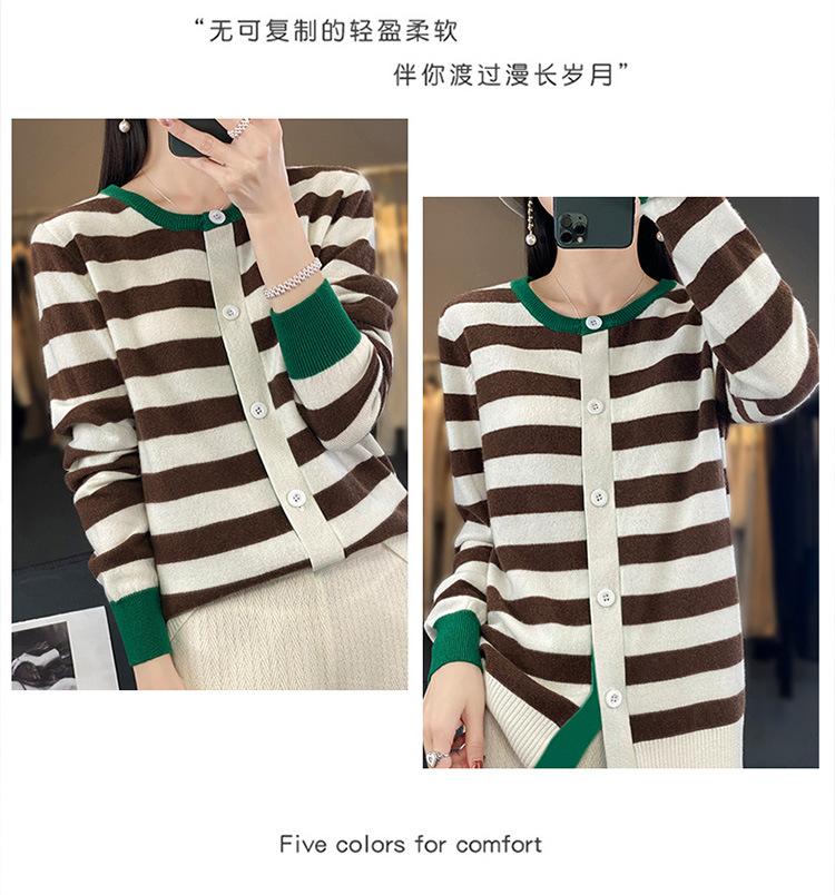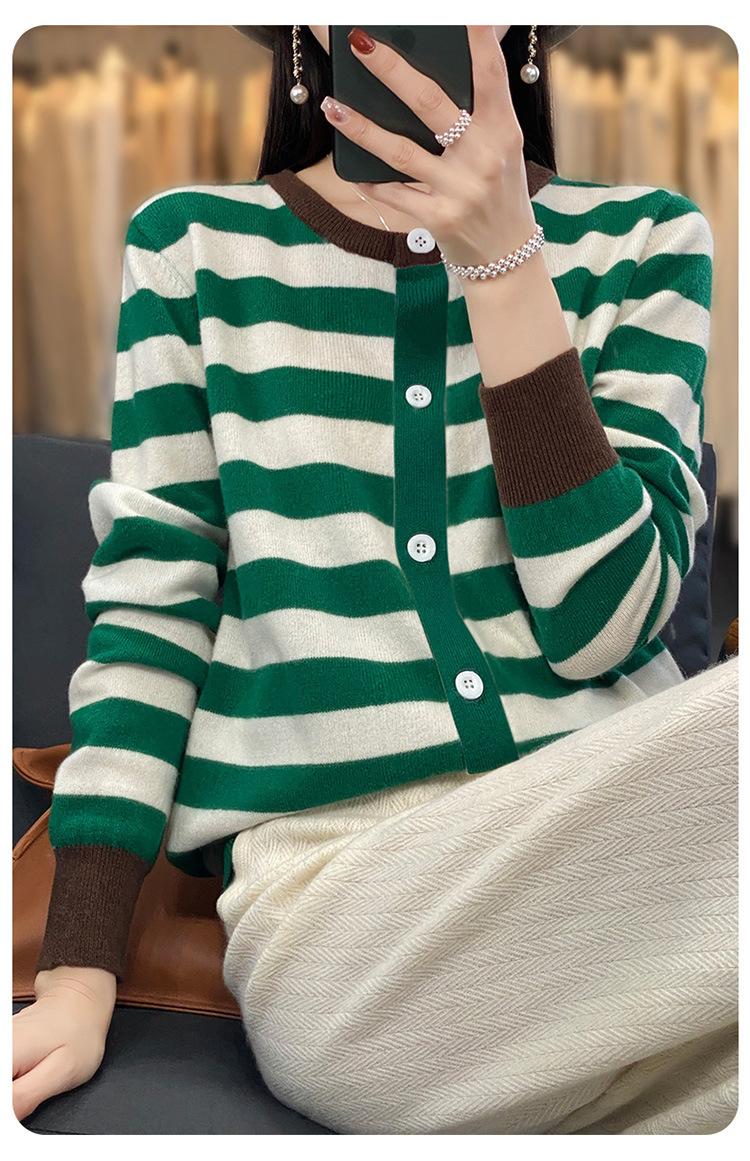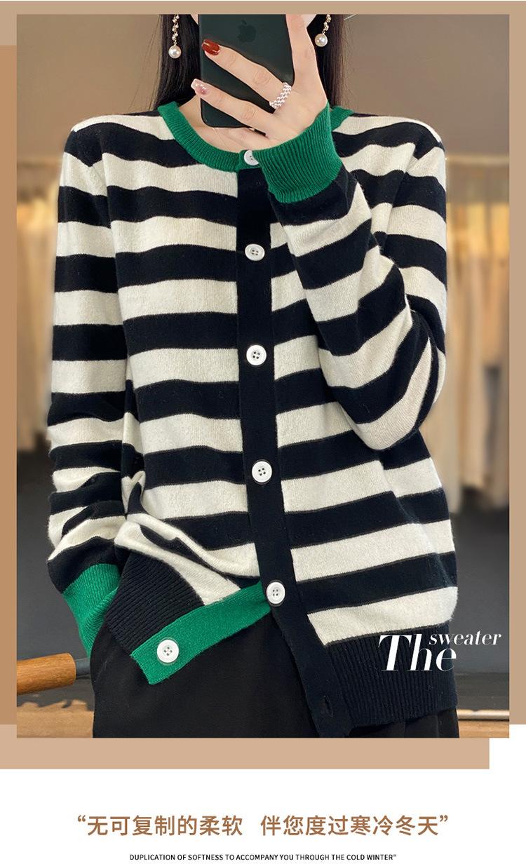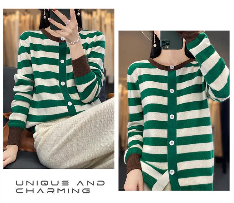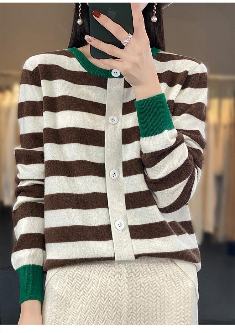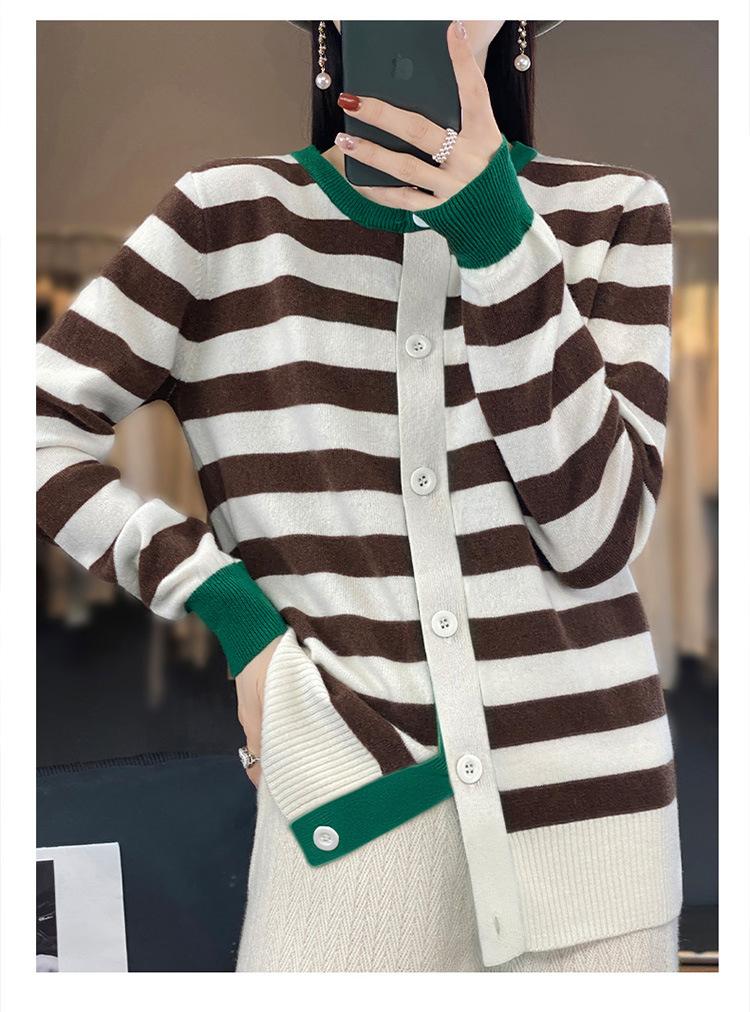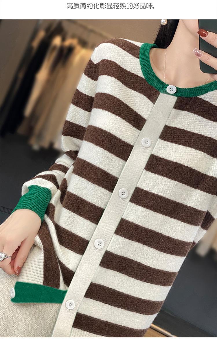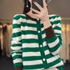 Otoño e Invierno 2024 Nuevo Estilo Coreano Cárdigan de Punto Cuello Redondo de Lana Pura a Rayas de Color en Contraste Suelto Combinable Top Chaqueta