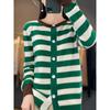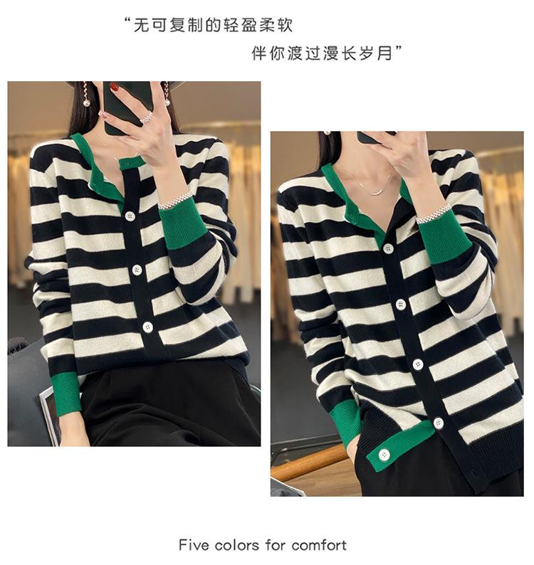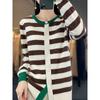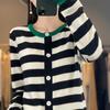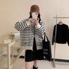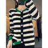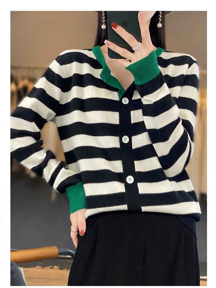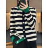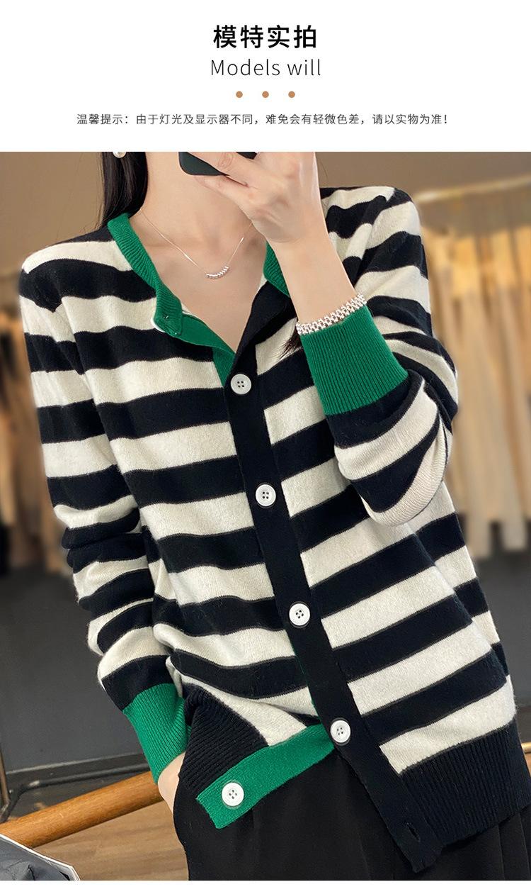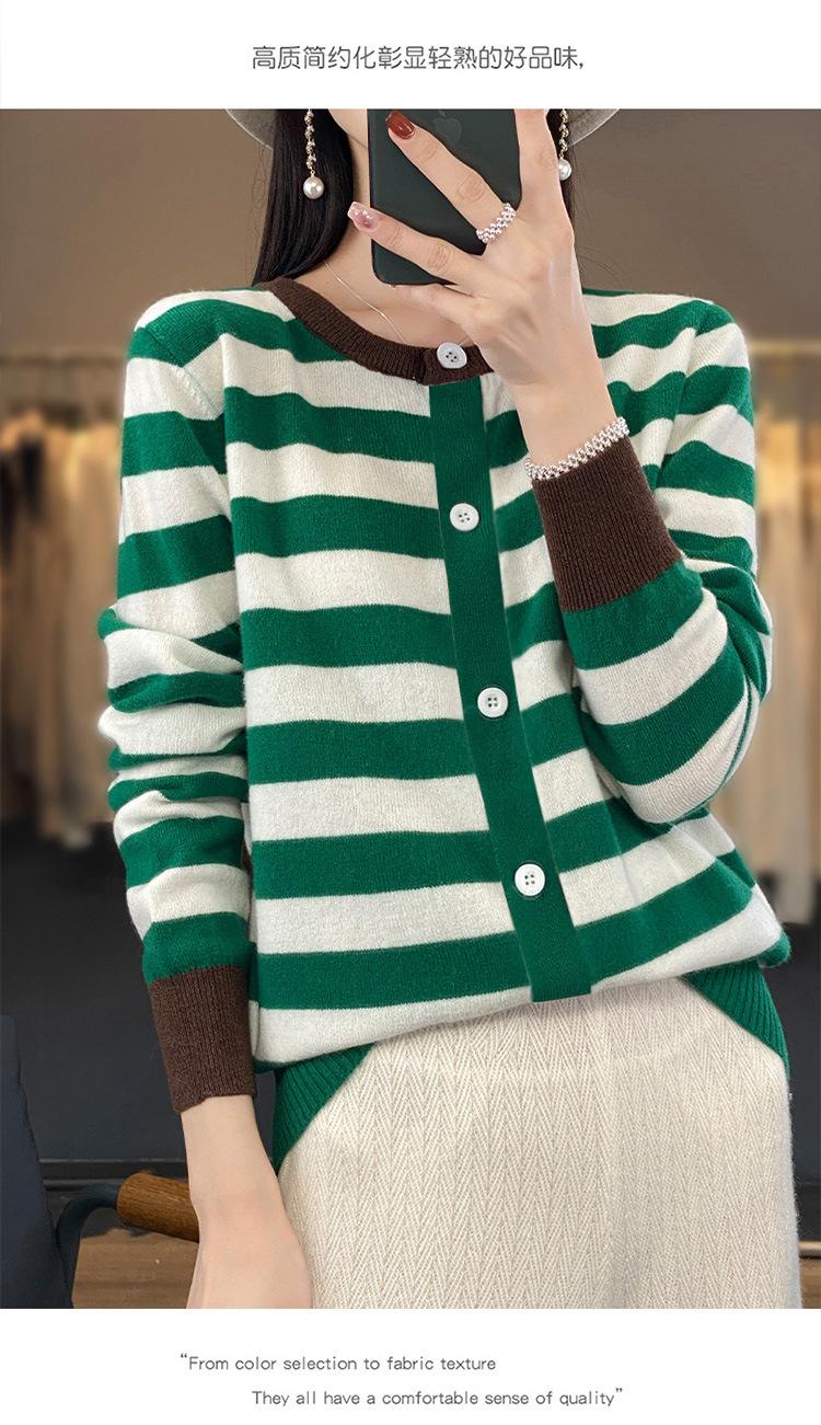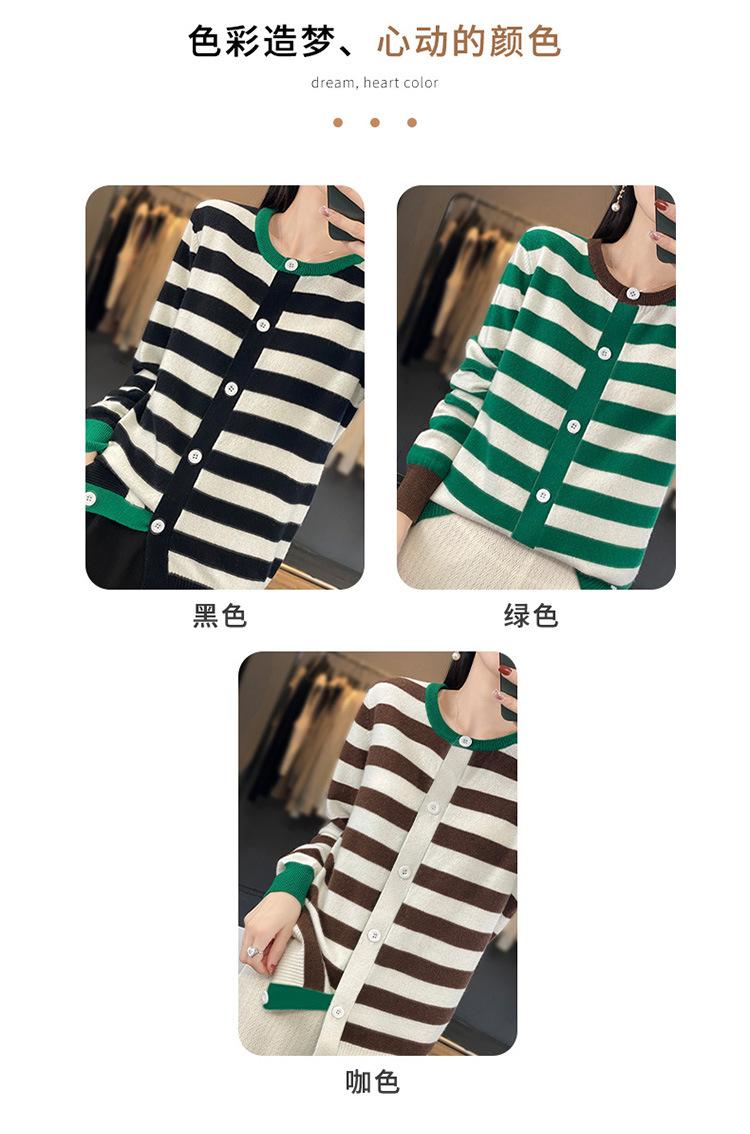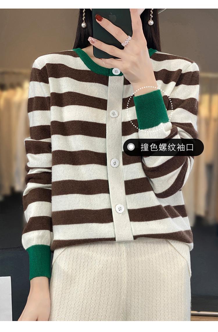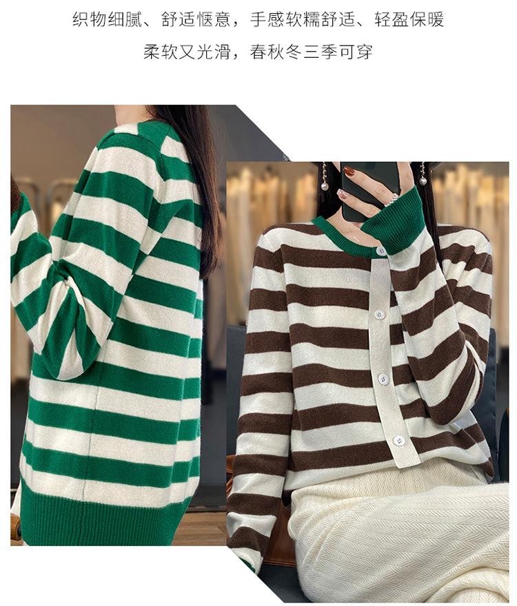 Otoño e Invierno 2024 Nuevo Estilo Coreano Cárdigan de Punto Cuello Redondo de Lana Pura a Rayas de Color en Contraste Suelto Combinable Top Chaqueta