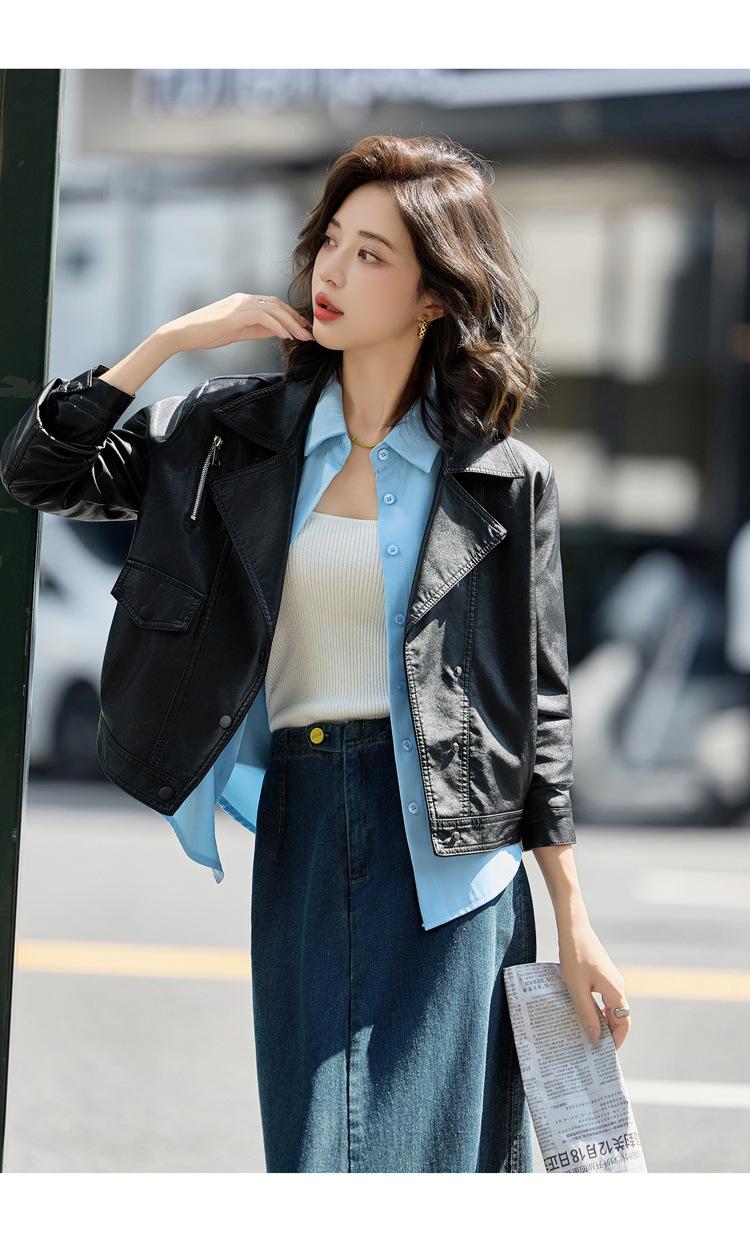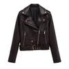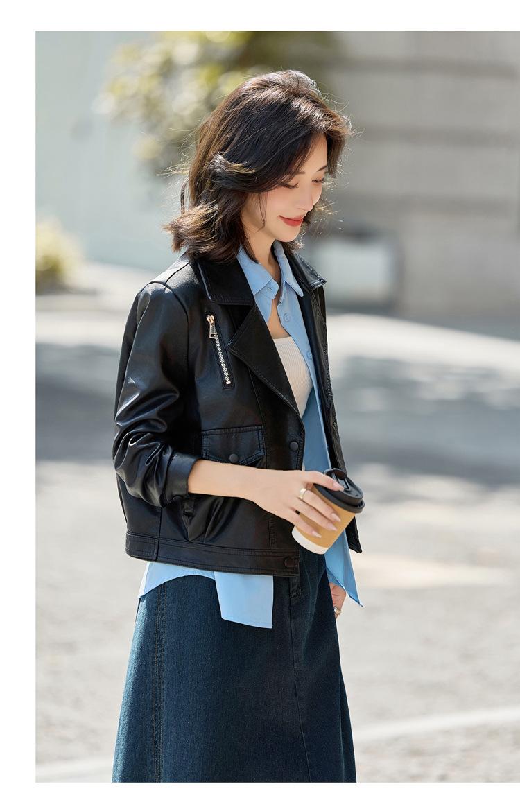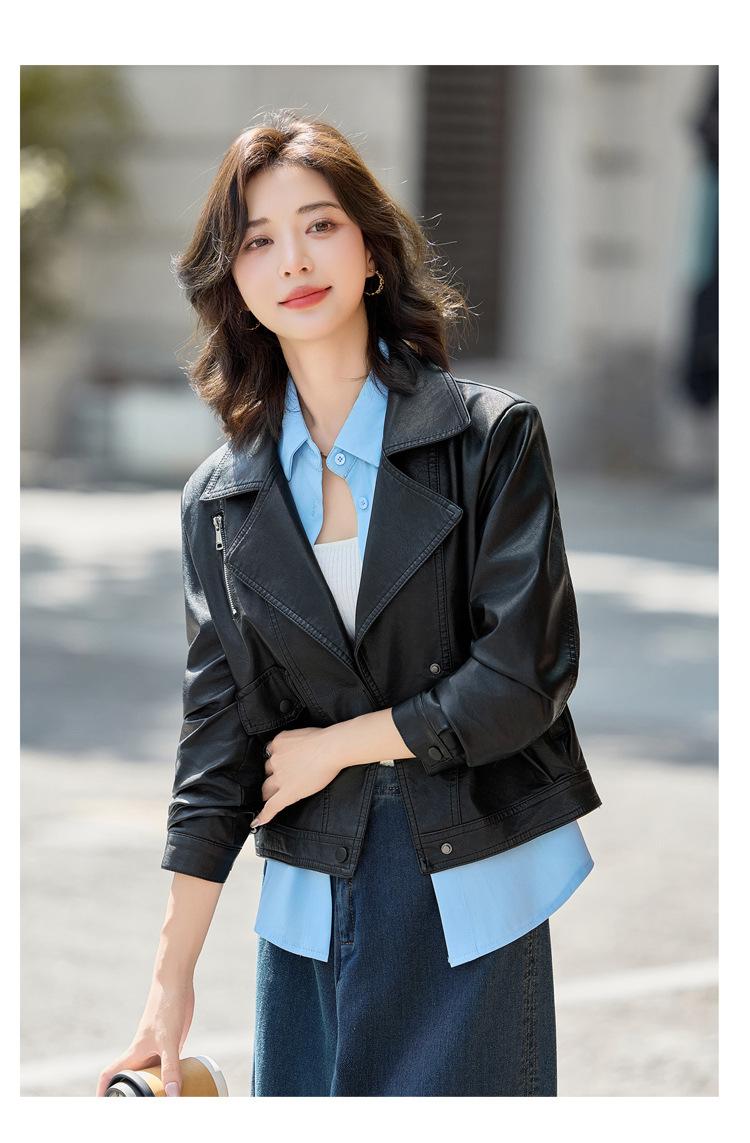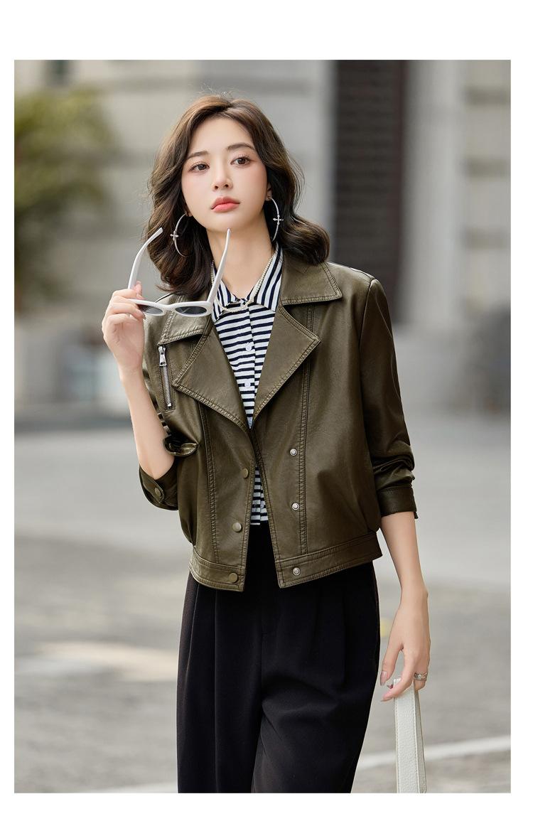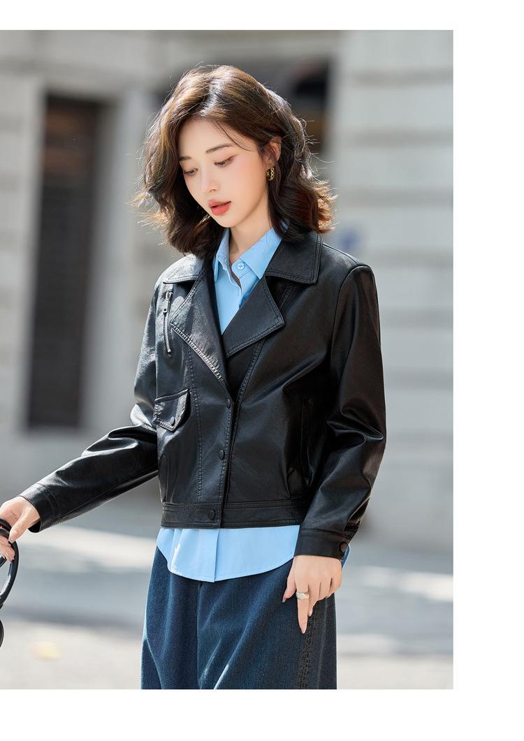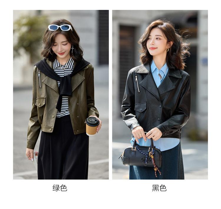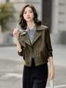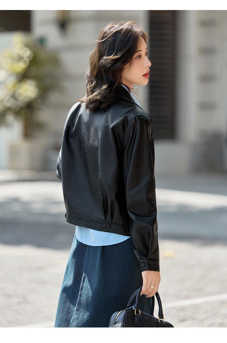 Chaqueta corta de cuero estilo europeo con cuello doblado para mujer 2025 primavera y otoño moda casual estilo callejero de motocicleta chaqueta de cuero petite
