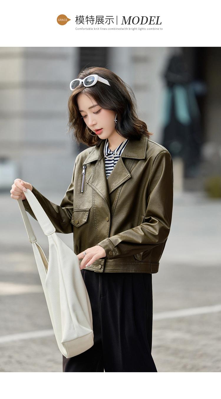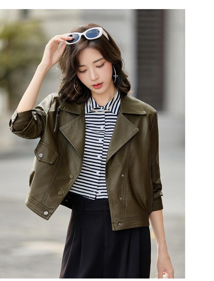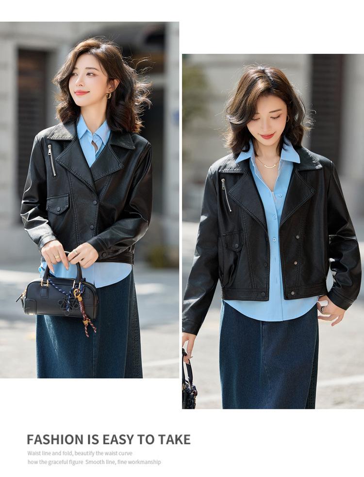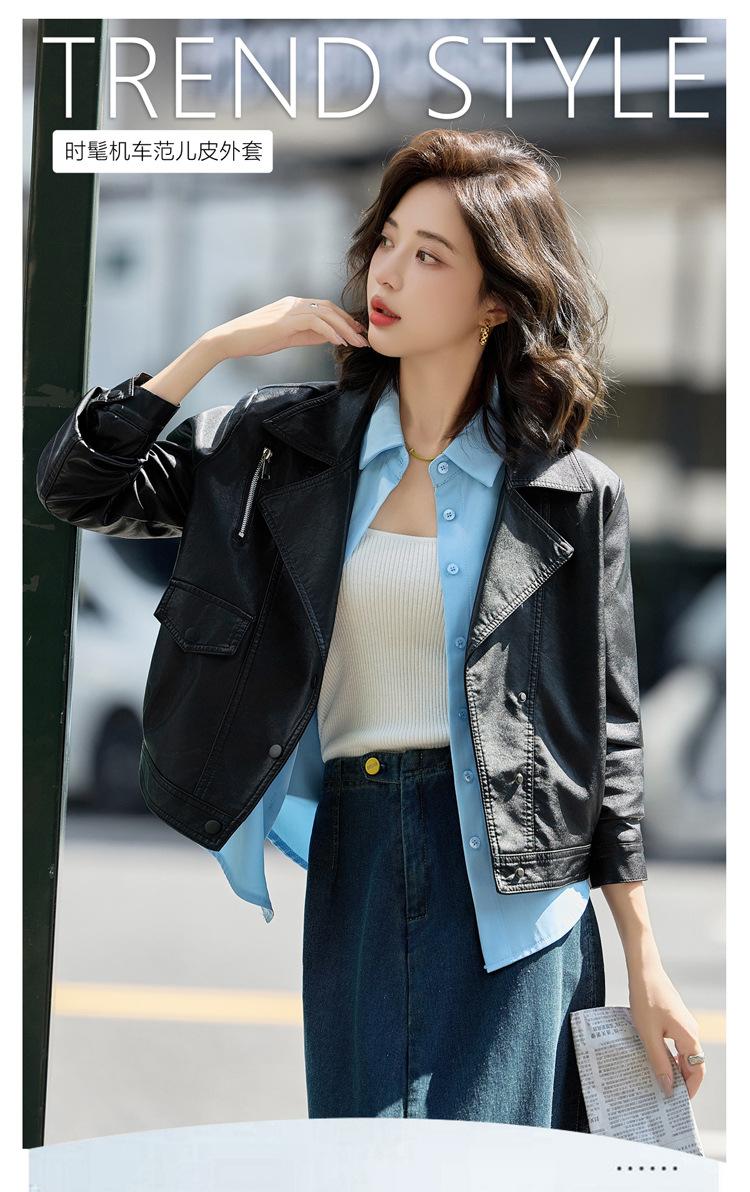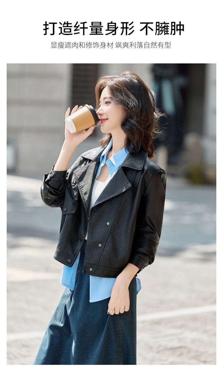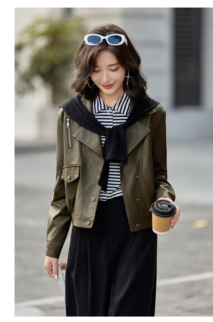 Chaqueta corta de cuero estilo europeo con cuello doblado para mujer 2025 primavera y otoño moda casual estilo callejero de motocicleta chaqueta de cuero petite