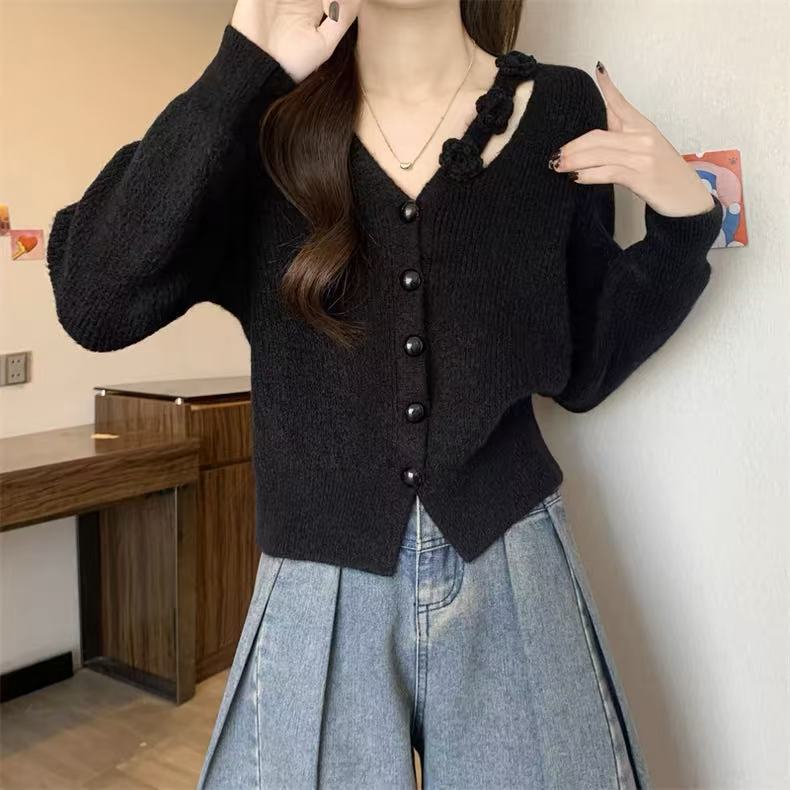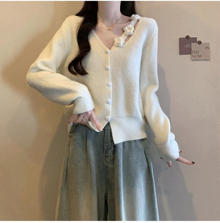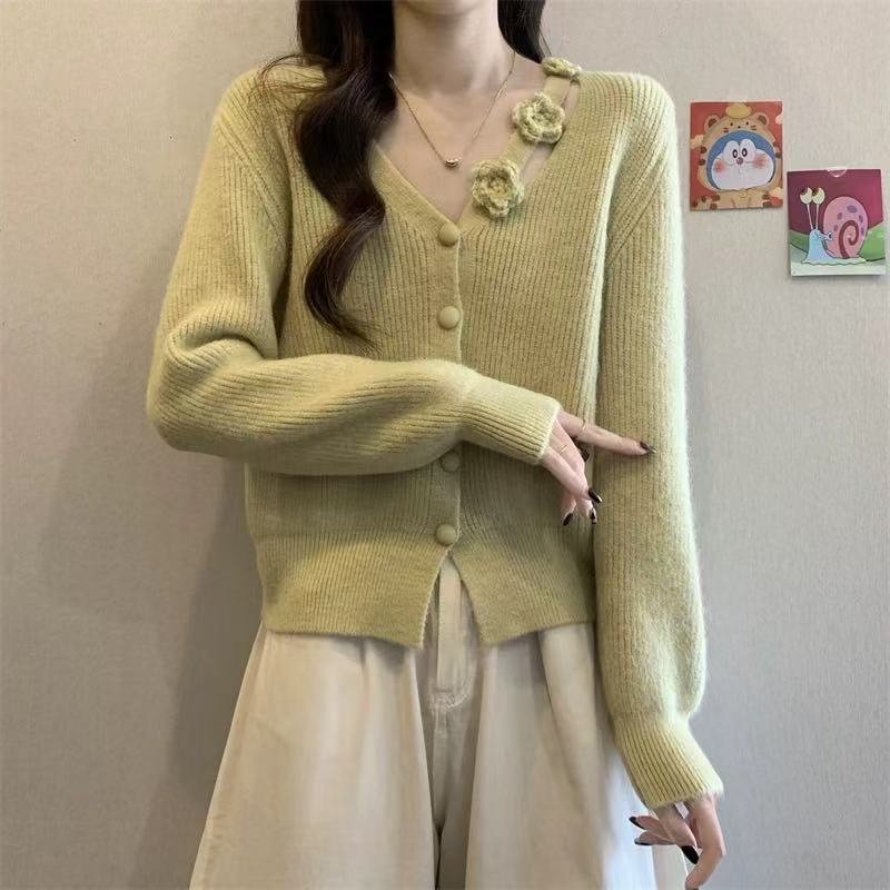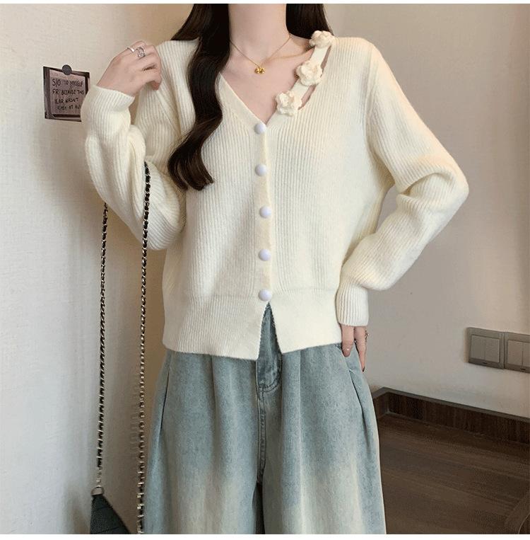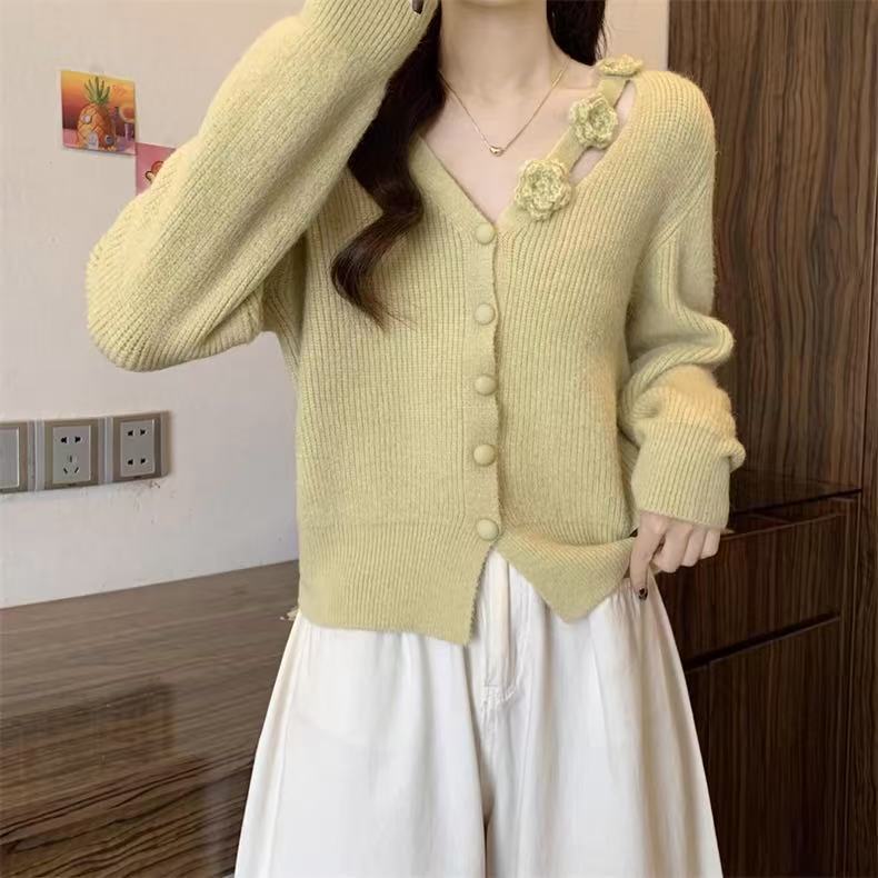 Chaqueta Suéter Estilo Holgazán para Mujer en Otoño e Invierno Estilo Francés Suave Estéreo Flor Calado Cuello en V Suave Cera Cárdigan de Manga Larga Top