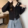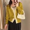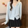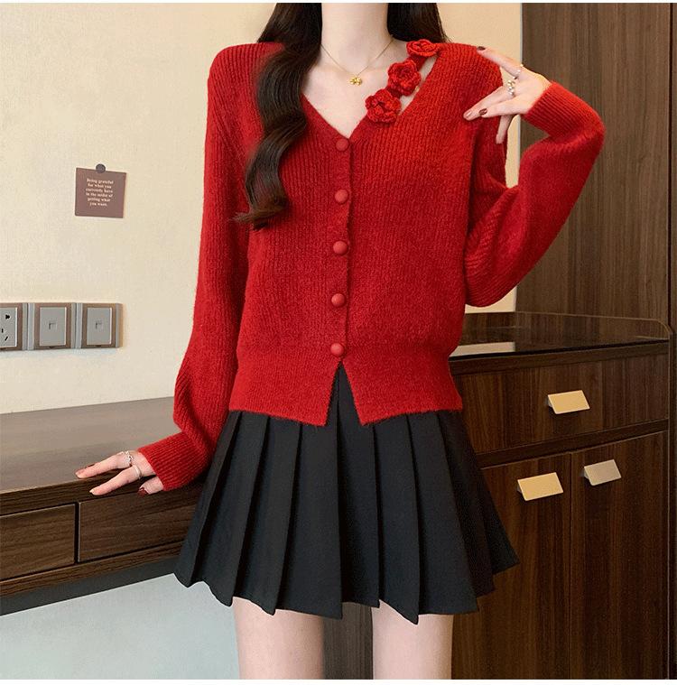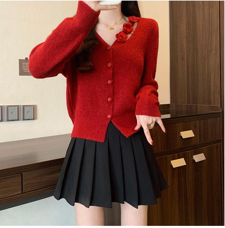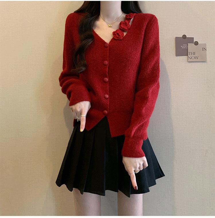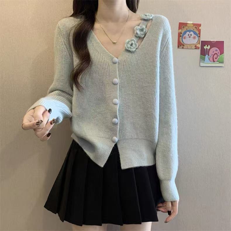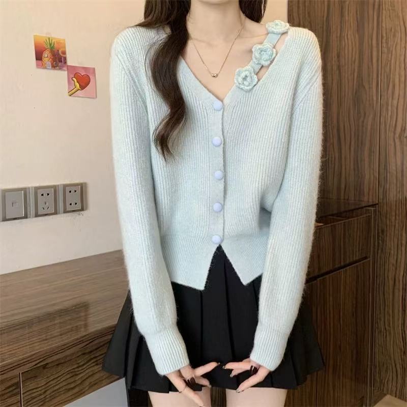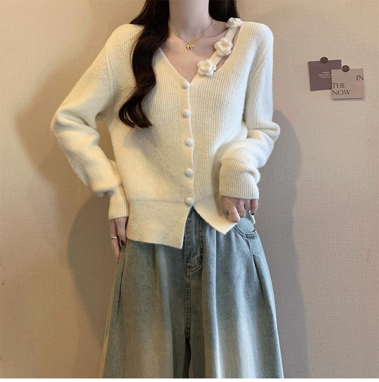 Chaqueta Suéter Estilo Holgazán para Mujer en Otoño e Invierno Estilo Francés Suave Estéreo Flor Calado Cuello en V Suave Cera Cárdigan de Manga Larga Top