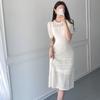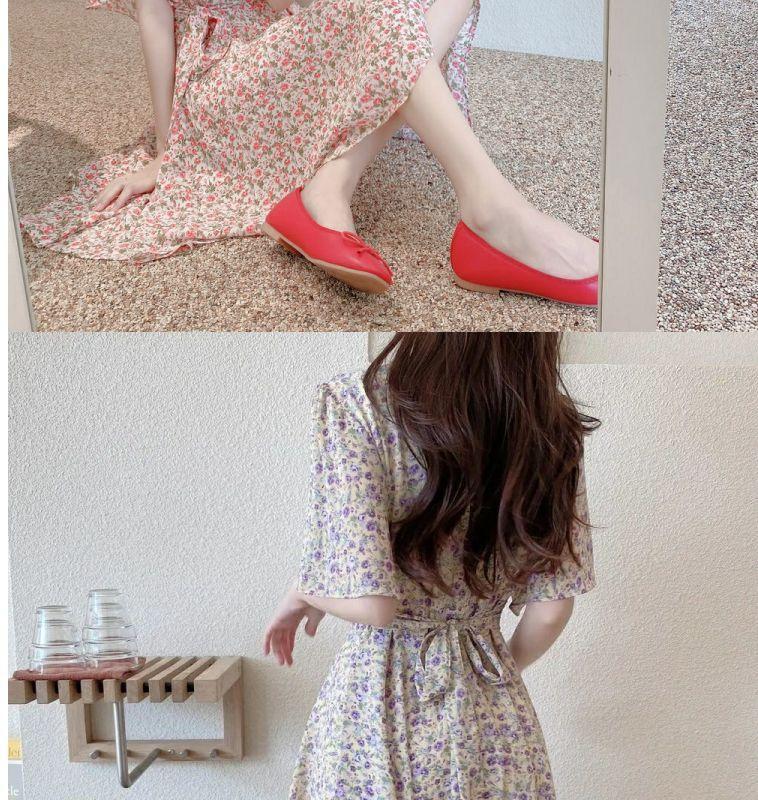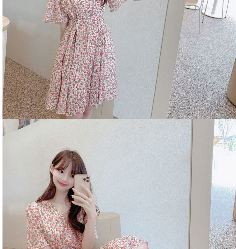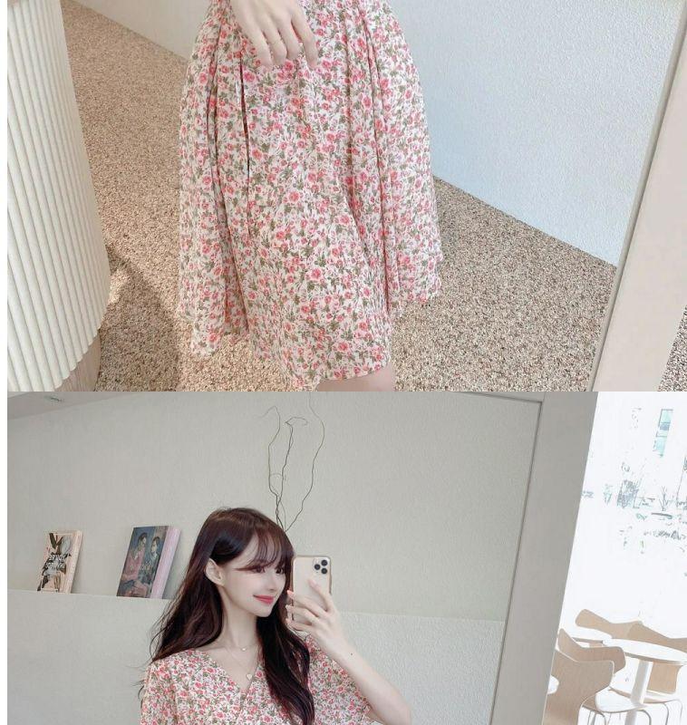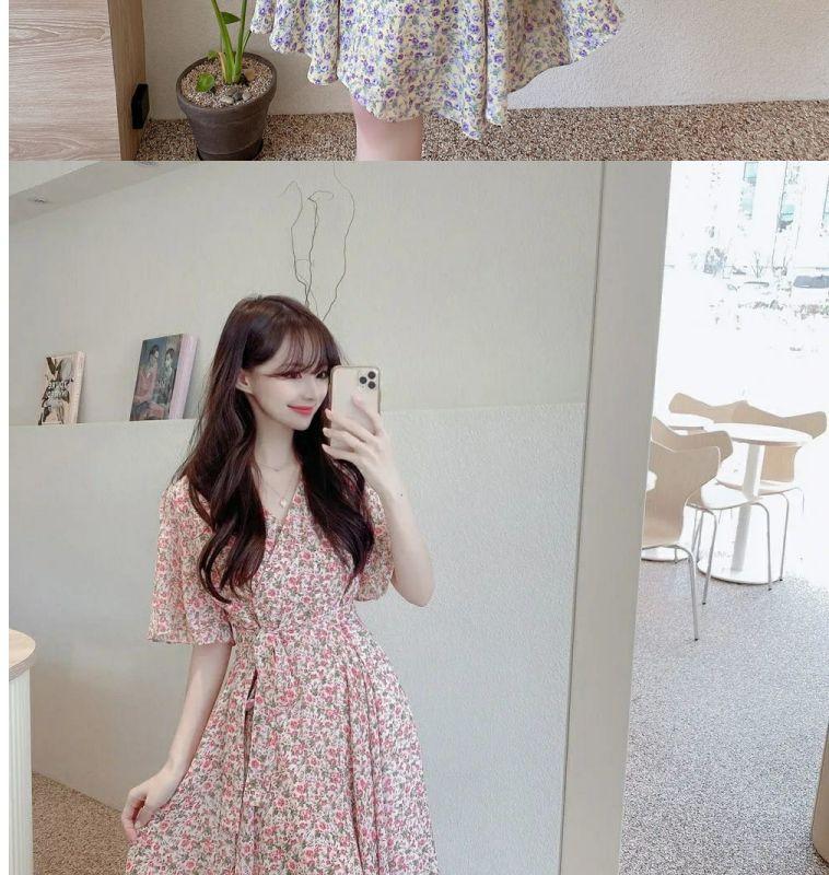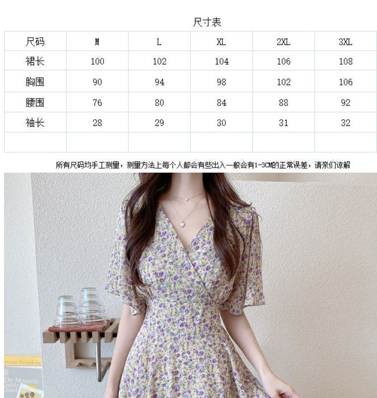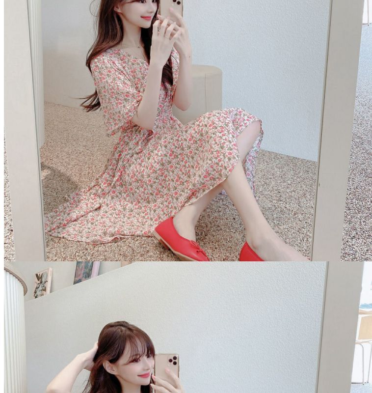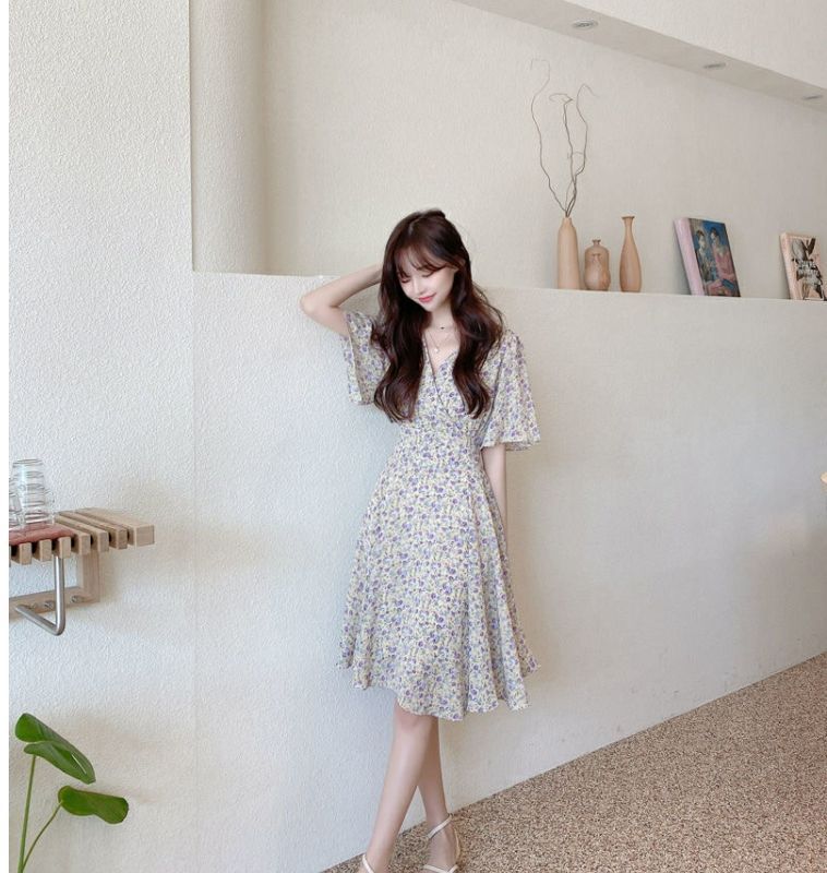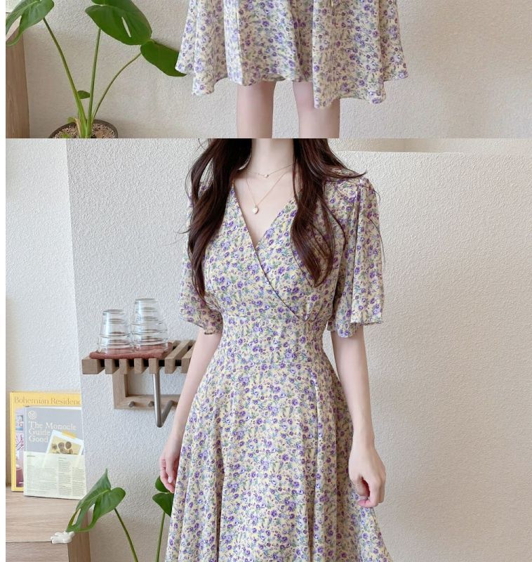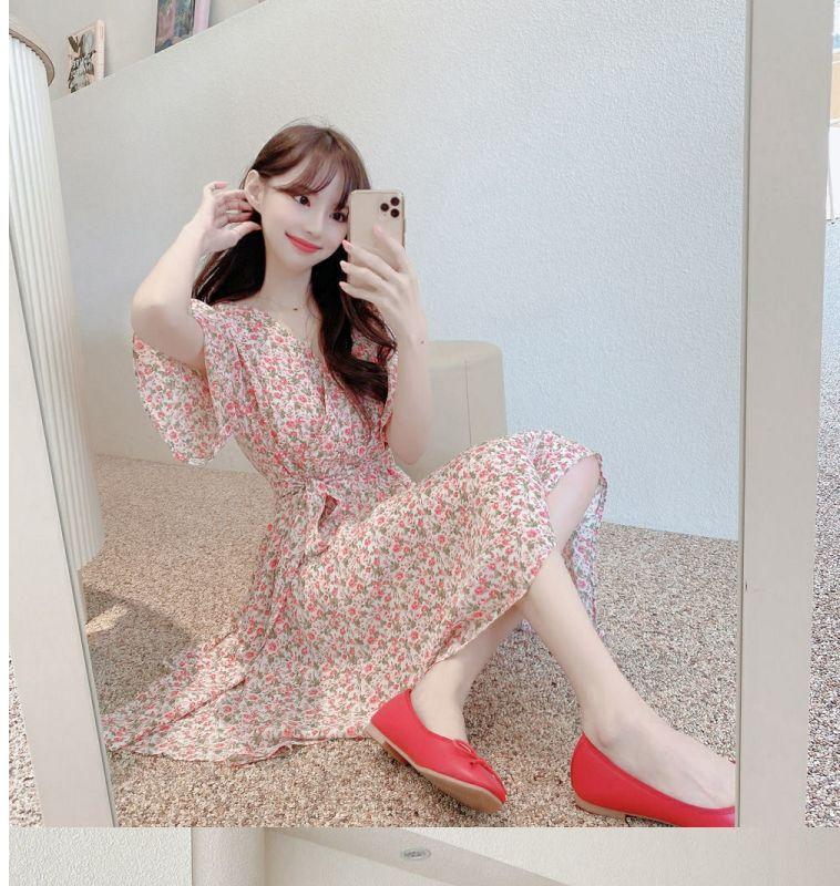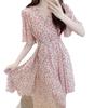 Verano Nuevo Vestido Floral Cuello en V para Mujer Estilo Dulce Temperamento Adelgazante Manga Corta Bodycon Falda A-line Rojo Floral