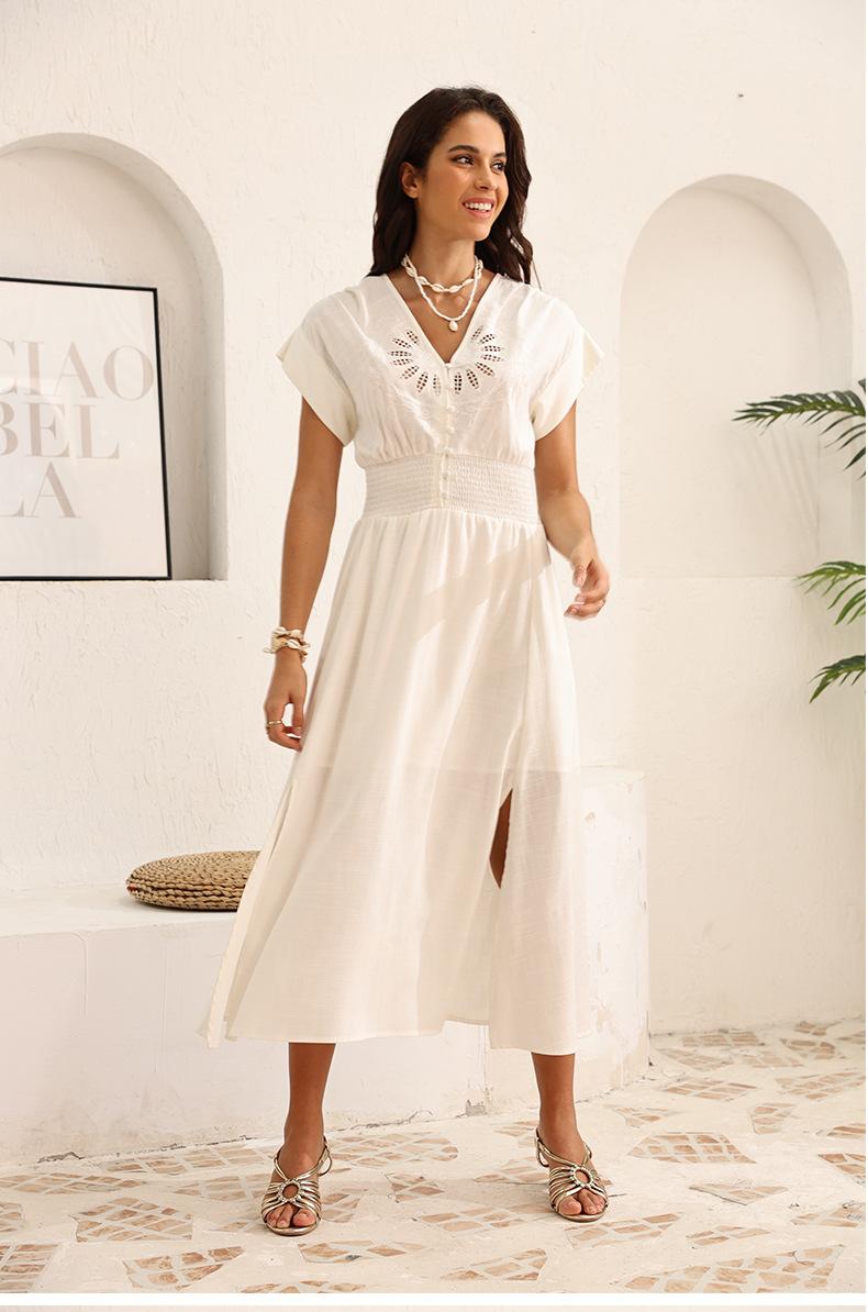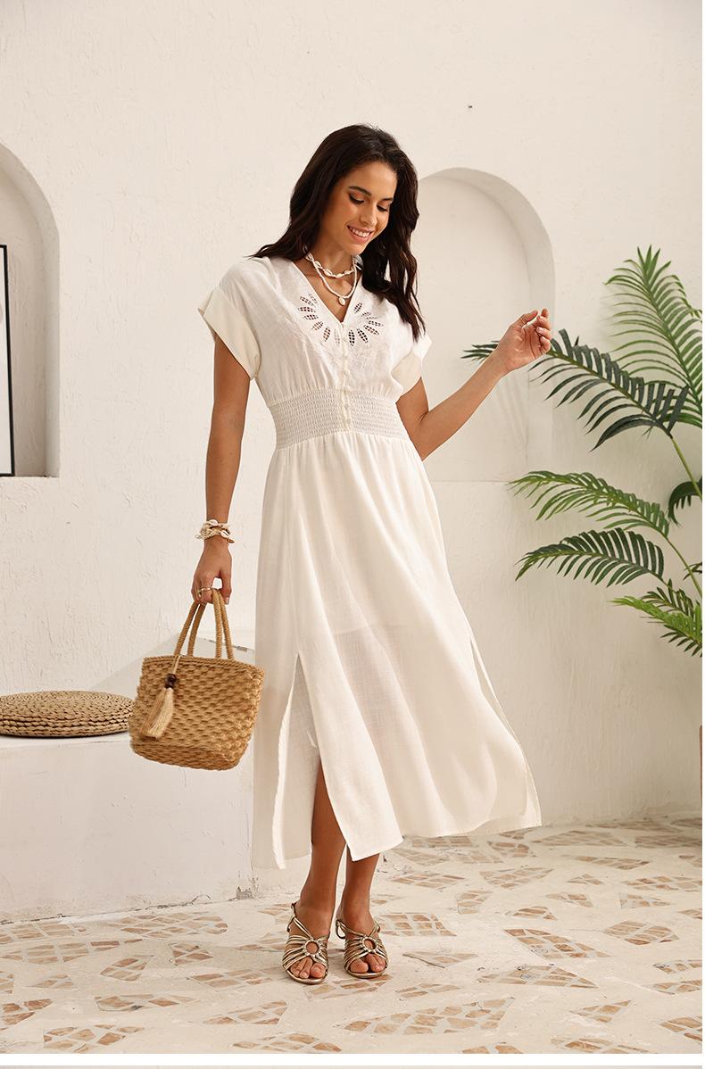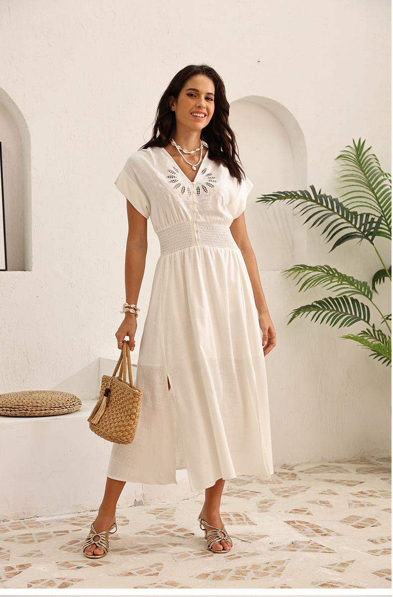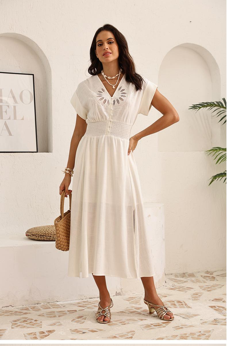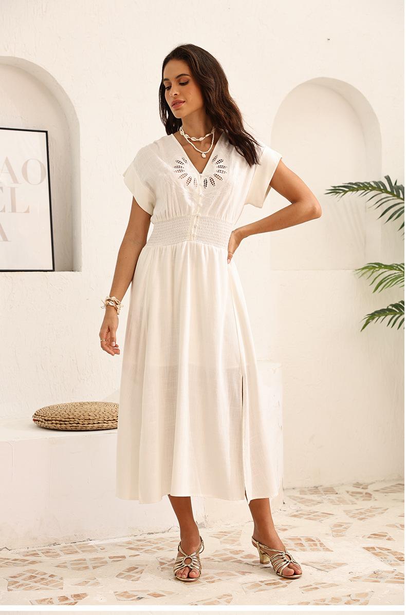 Europeo y Americano Transfronterizo Verano Nuevo Estilo Recorte Bordado Cintura Cuello en V Vestido Estilo Resort Francés Elegante Abertura Falda Larga