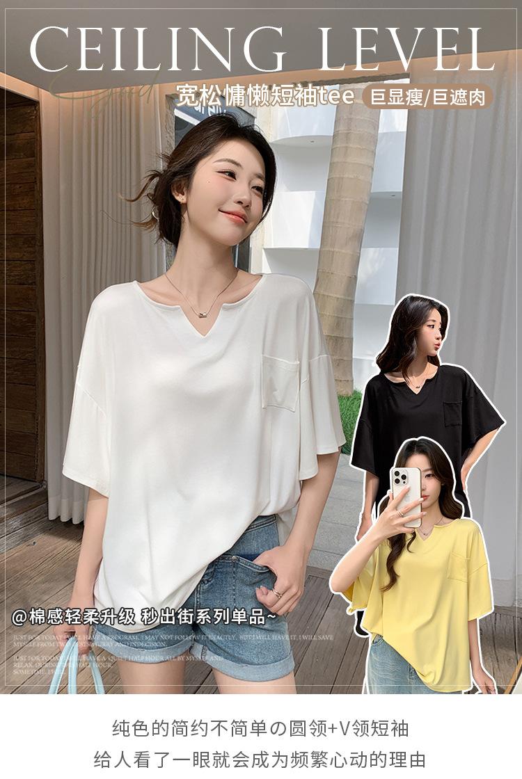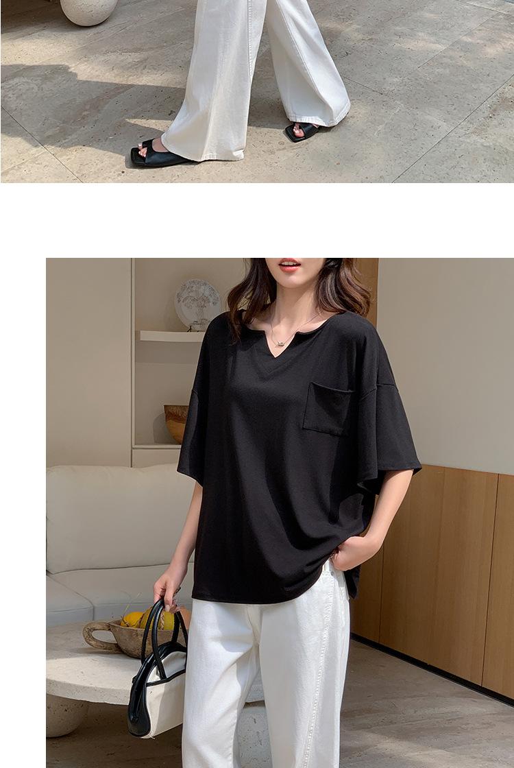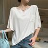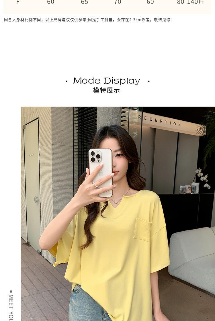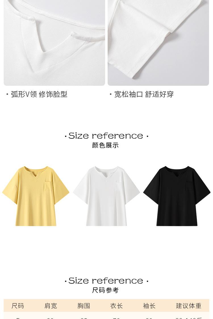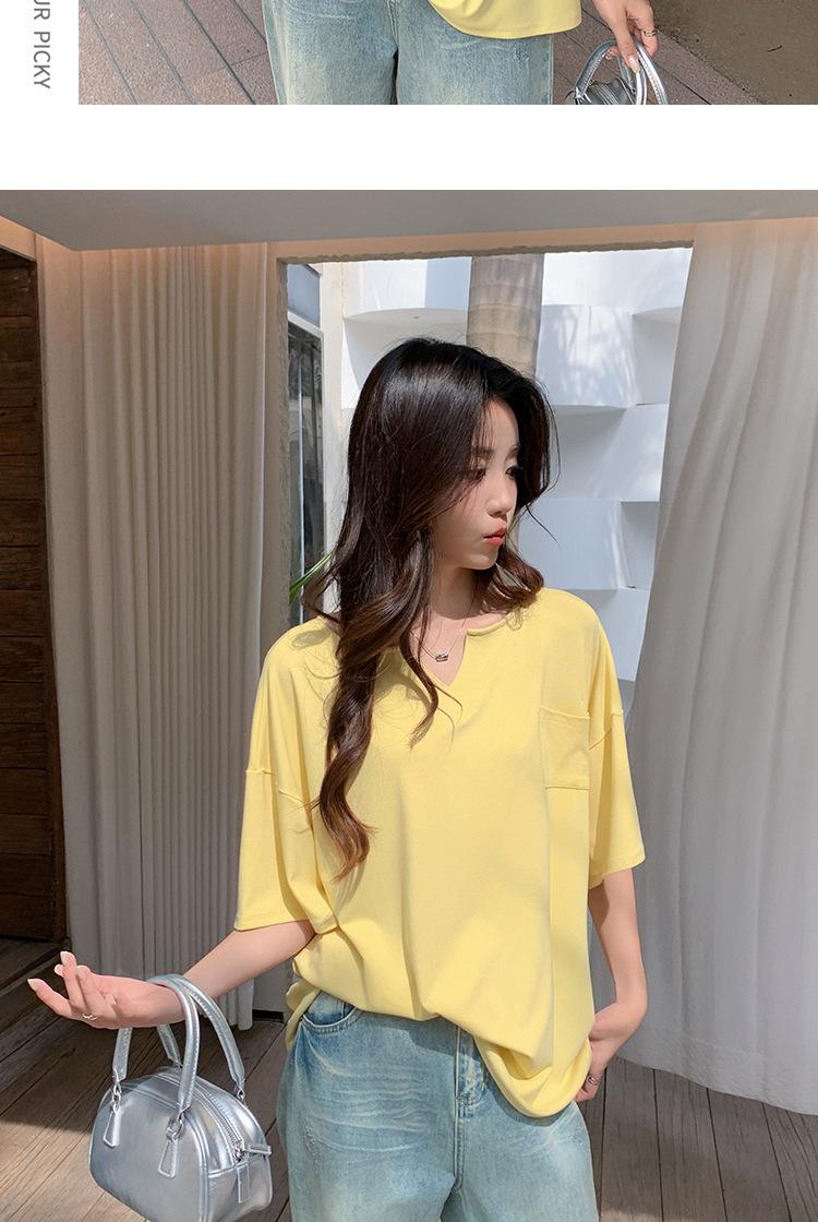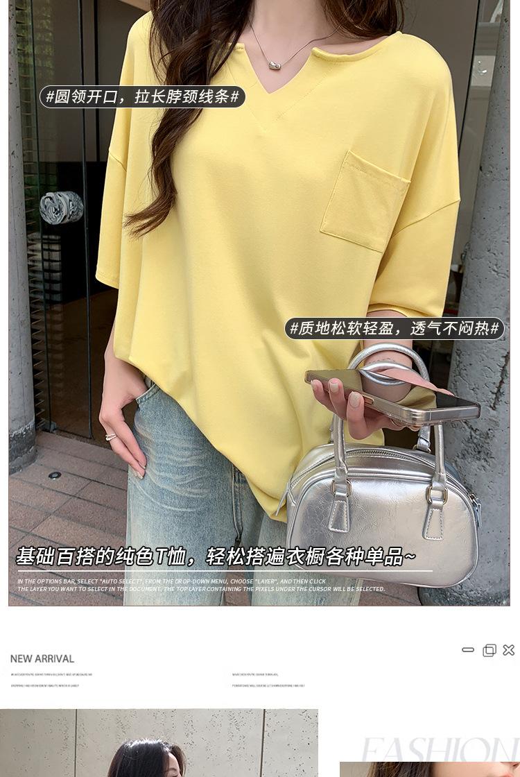 H591 Camiseta de Bolsillo Personalizada con Cuello en V y Manga Corta para Mujer, Estilo Veraniego Relajado, Holgada Adelgazante Color Sólido Top Simple Versátil