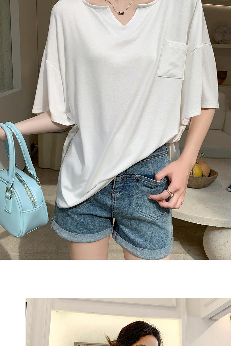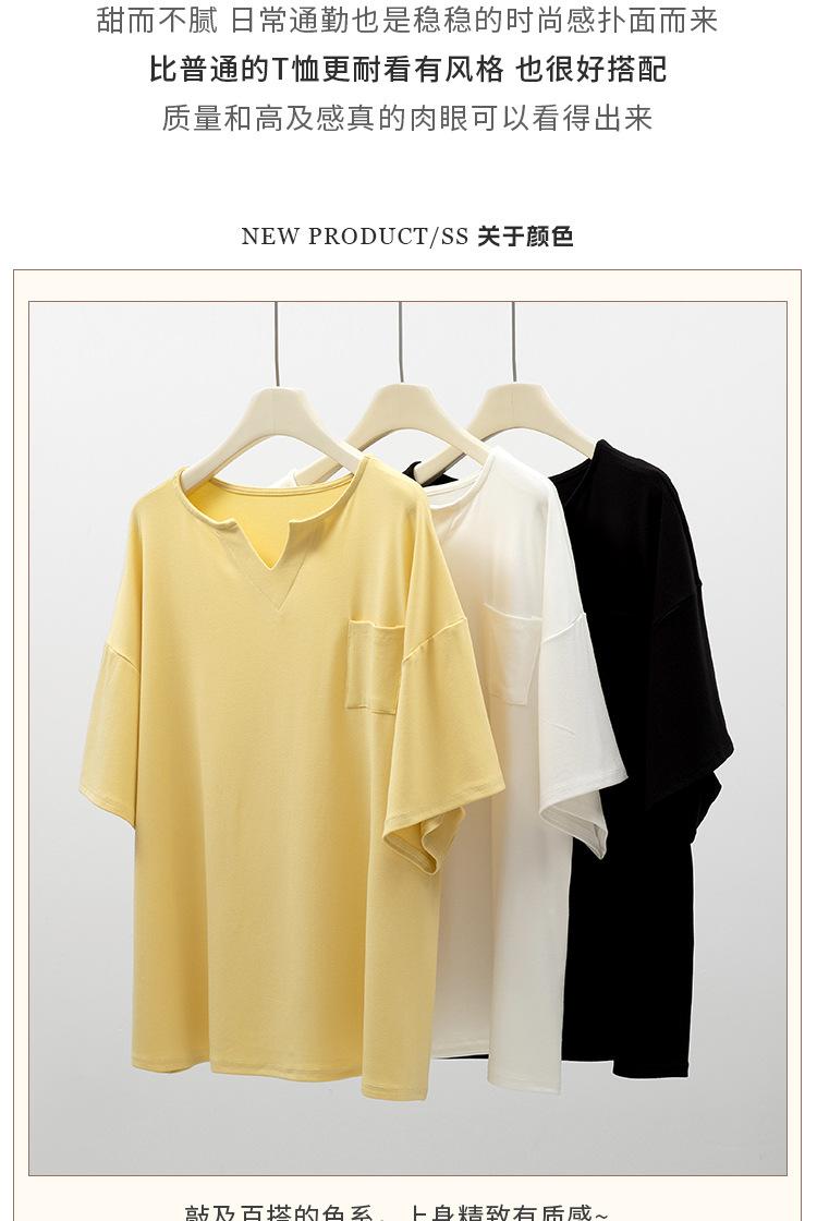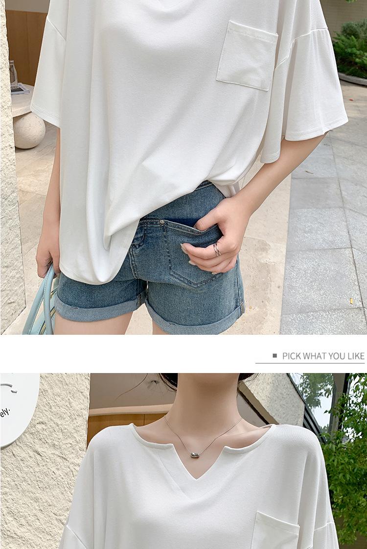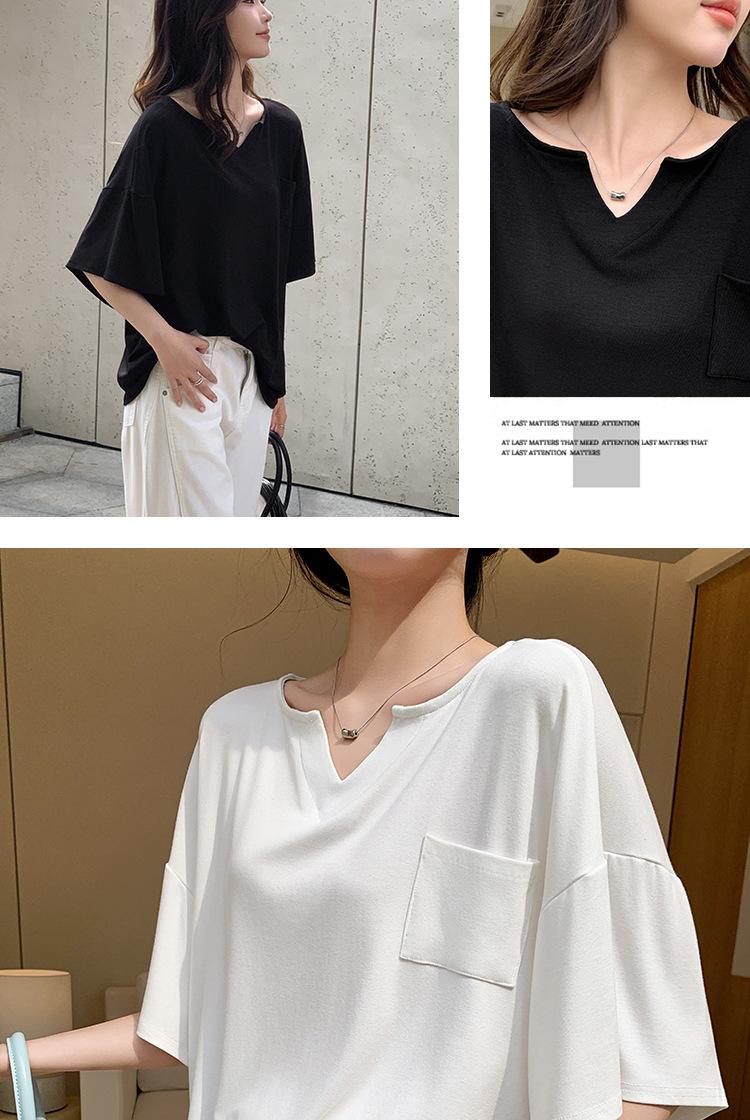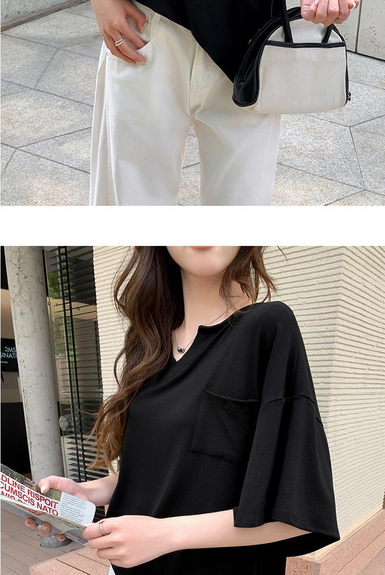 H591 Camiseta de Bolsillo Personalizada con Cuello en V y Manga Corta para Mujer, Estilo Veraniego Relajado, Holgada Adelgazante Color Sólido Top Simple Versátil