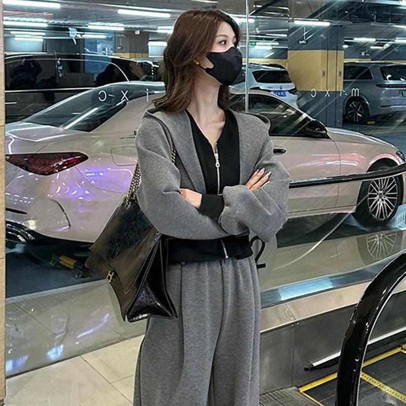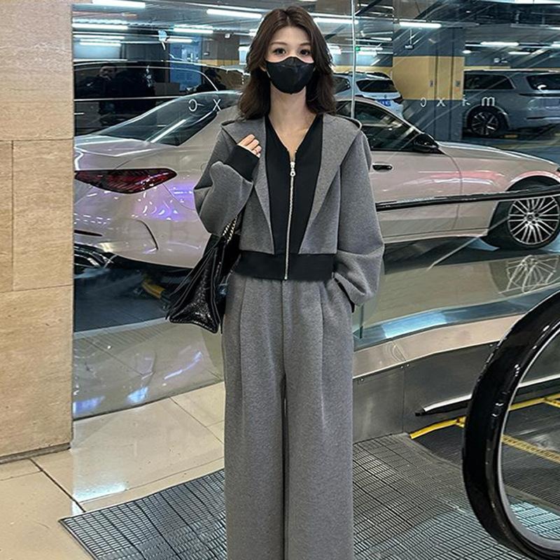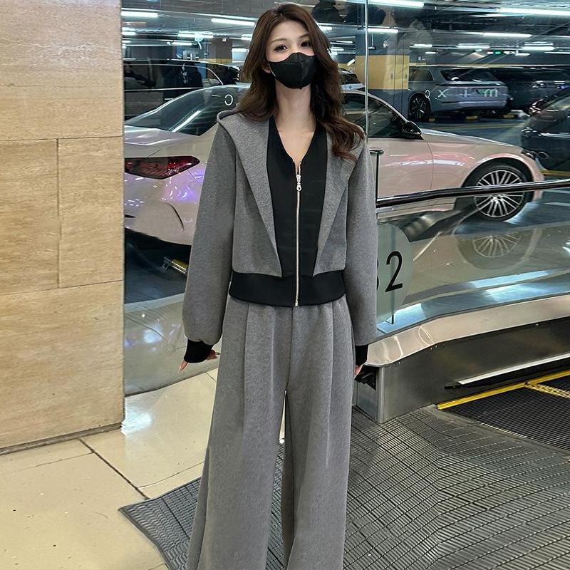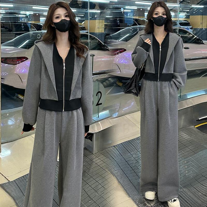 Traje deportivo casual para mujer 2025 Primavera Nuevo estilo occidental Adelgazante Cárdigan con capucha Pantalones de pierna ancha Conjunto de dos piezas que rejuvenece