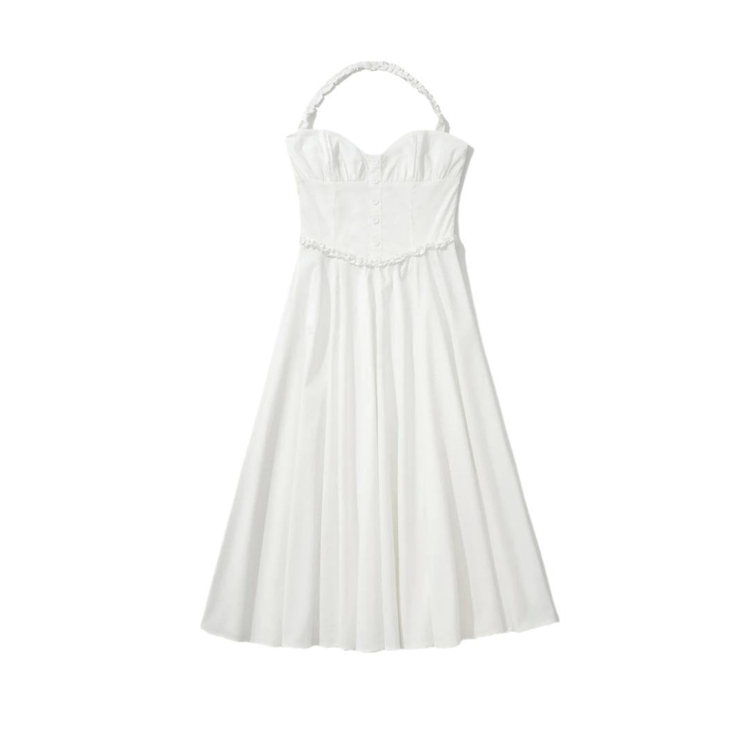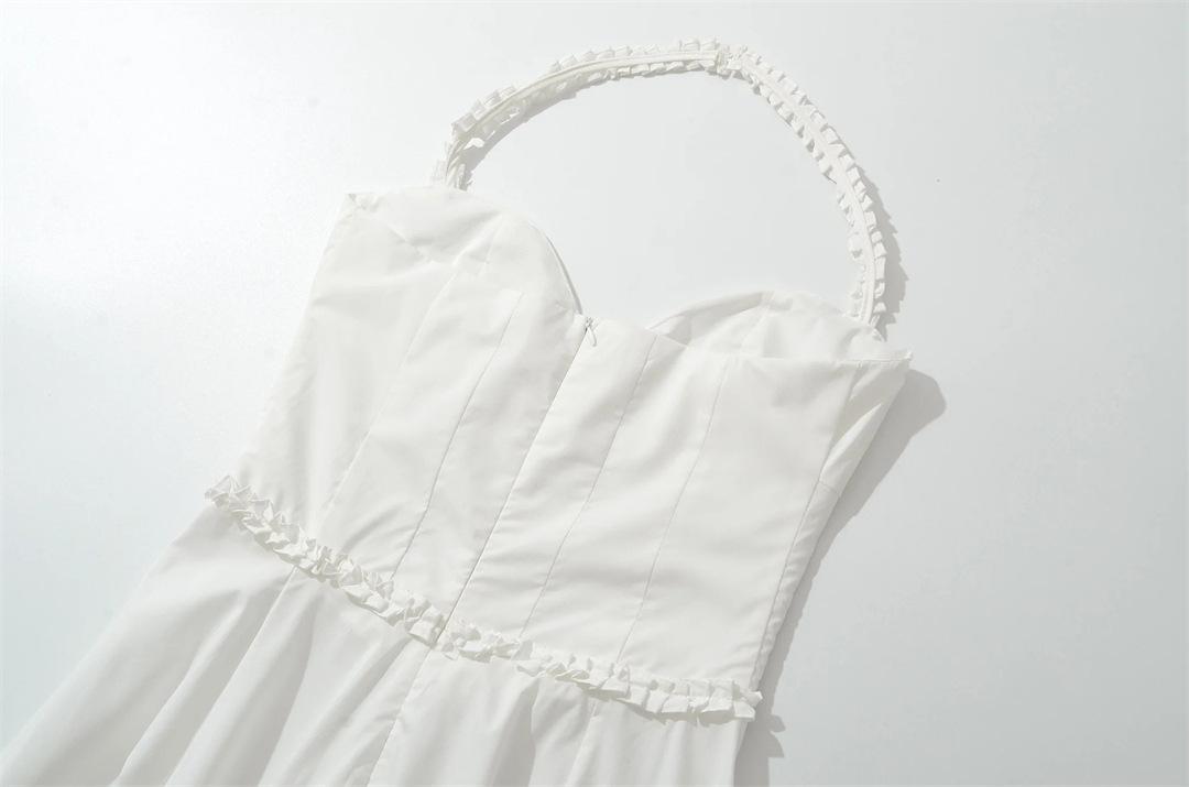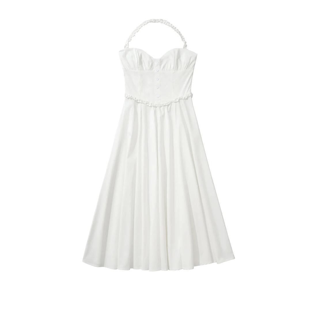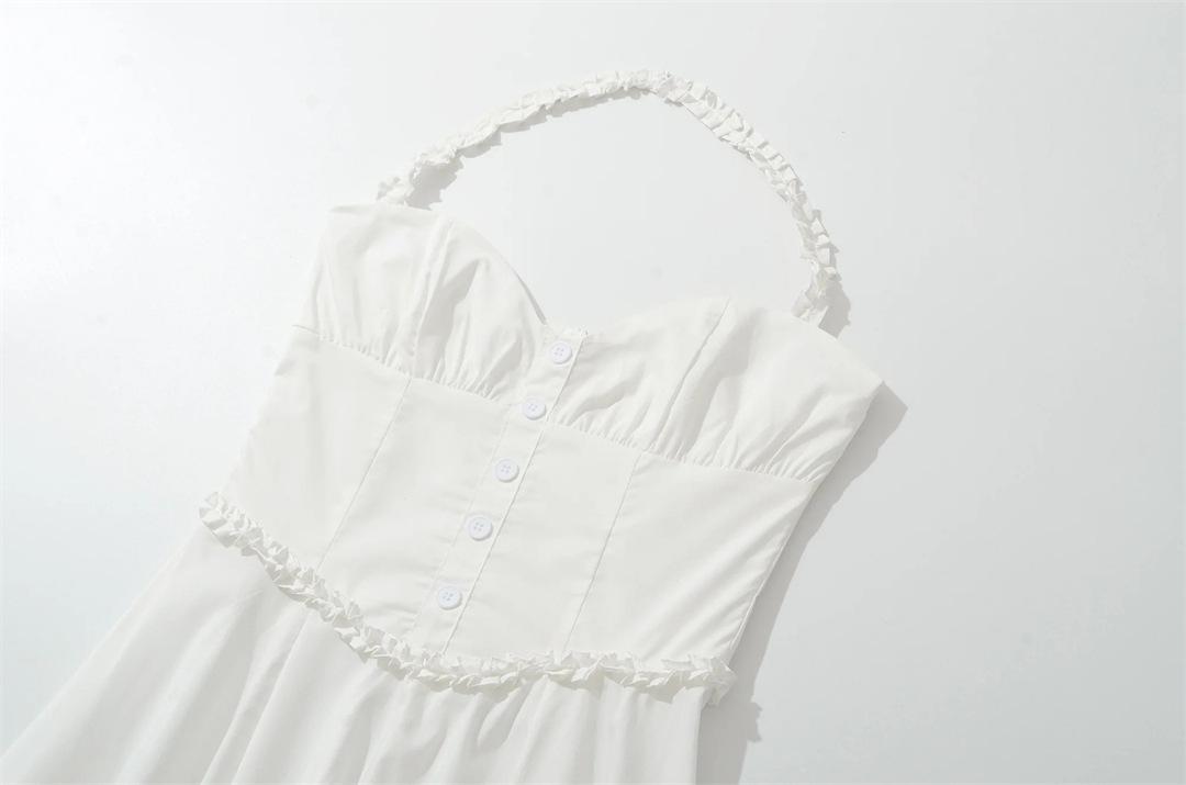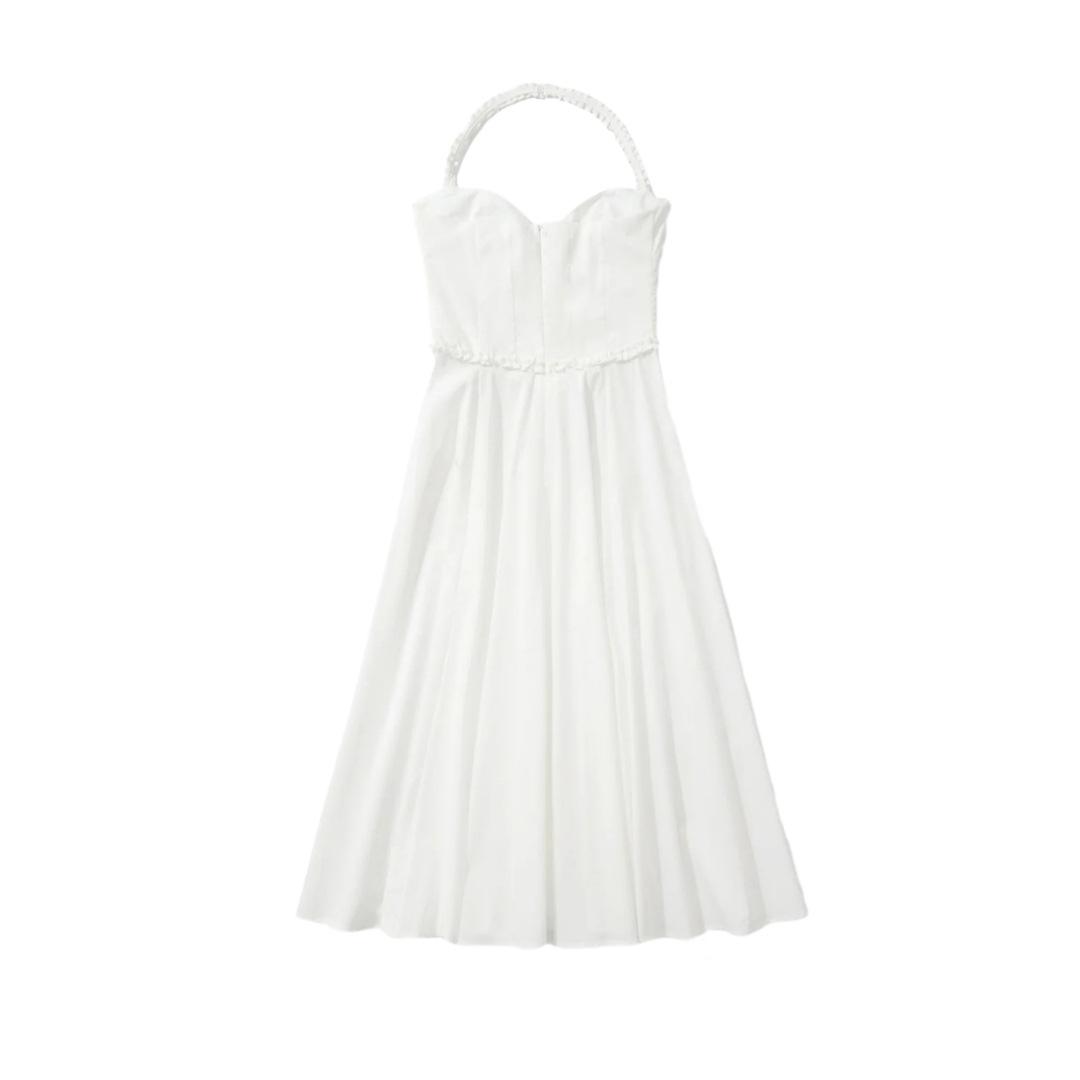 Vacaciones Francesas en la Costa Vestido Blanco con Tirantes Halter para Mujer Sexy Espalda Descubierta Fruncido Recogido en la Cintura Vestido Largo de Gran Vuelo Plisado