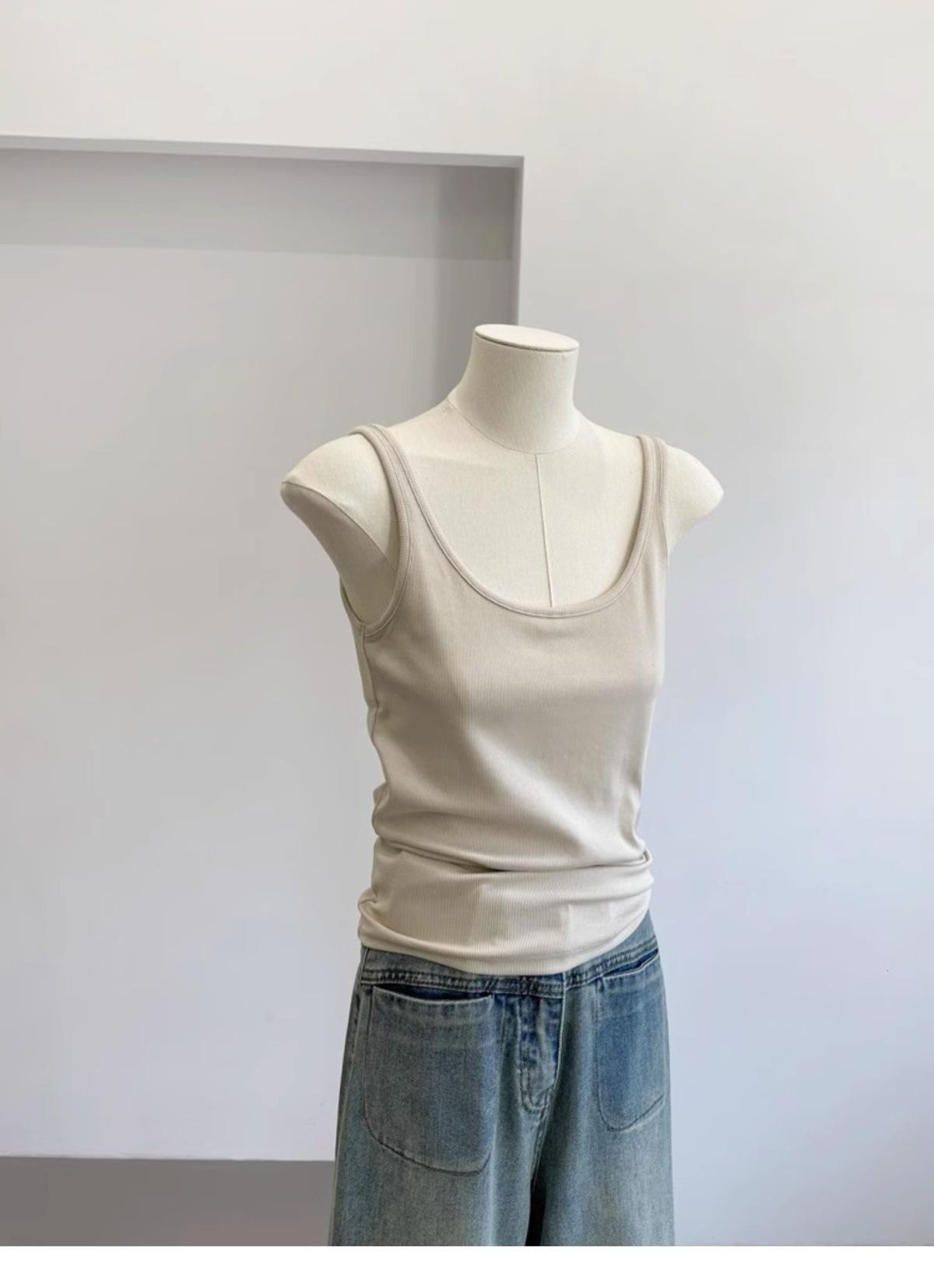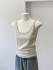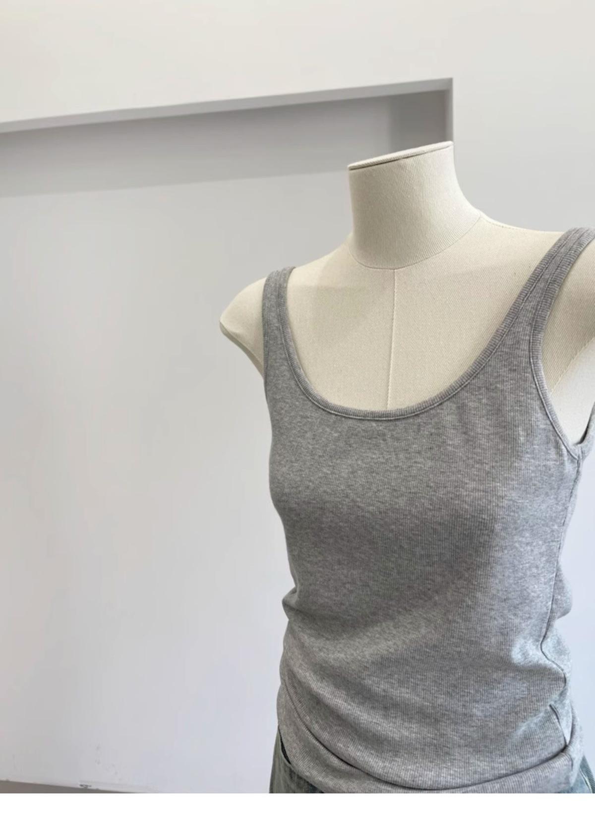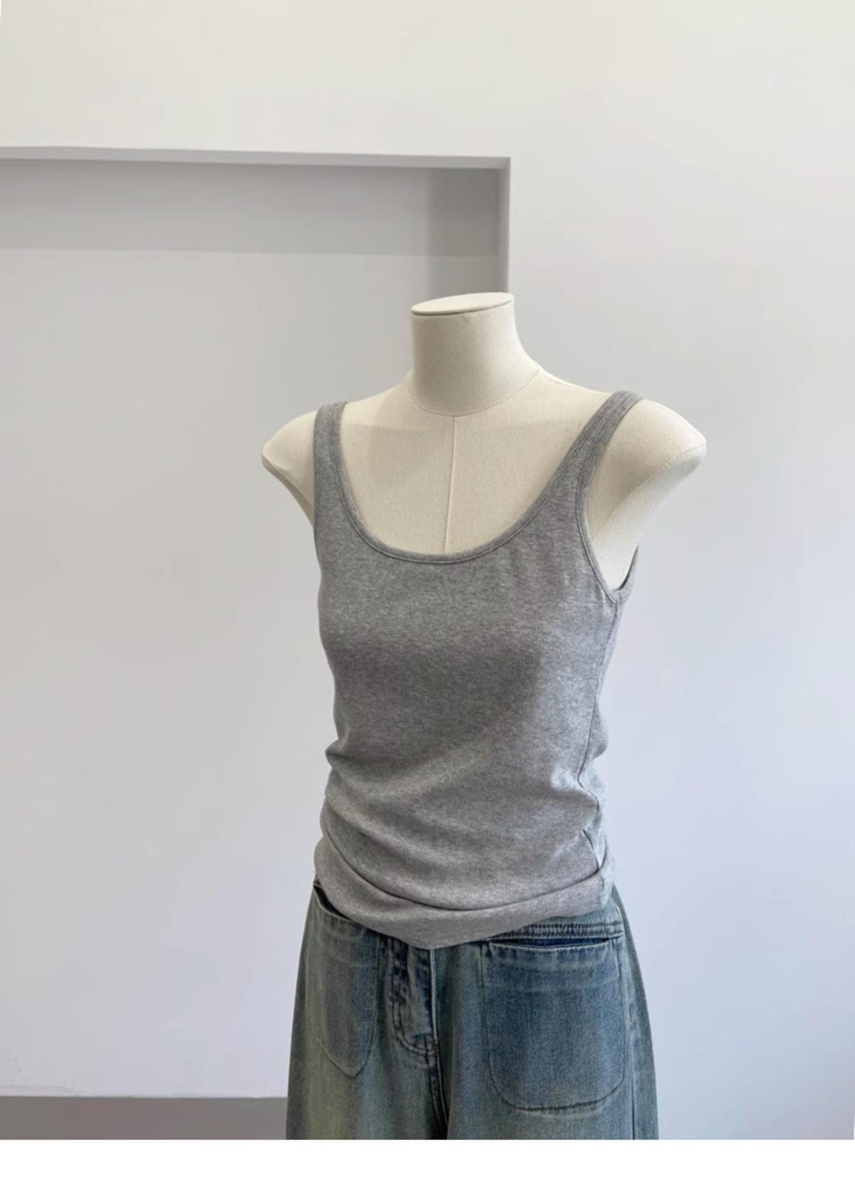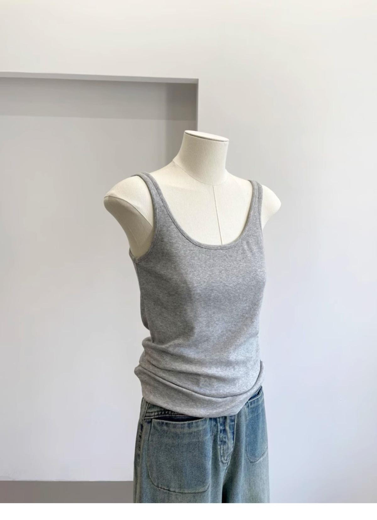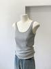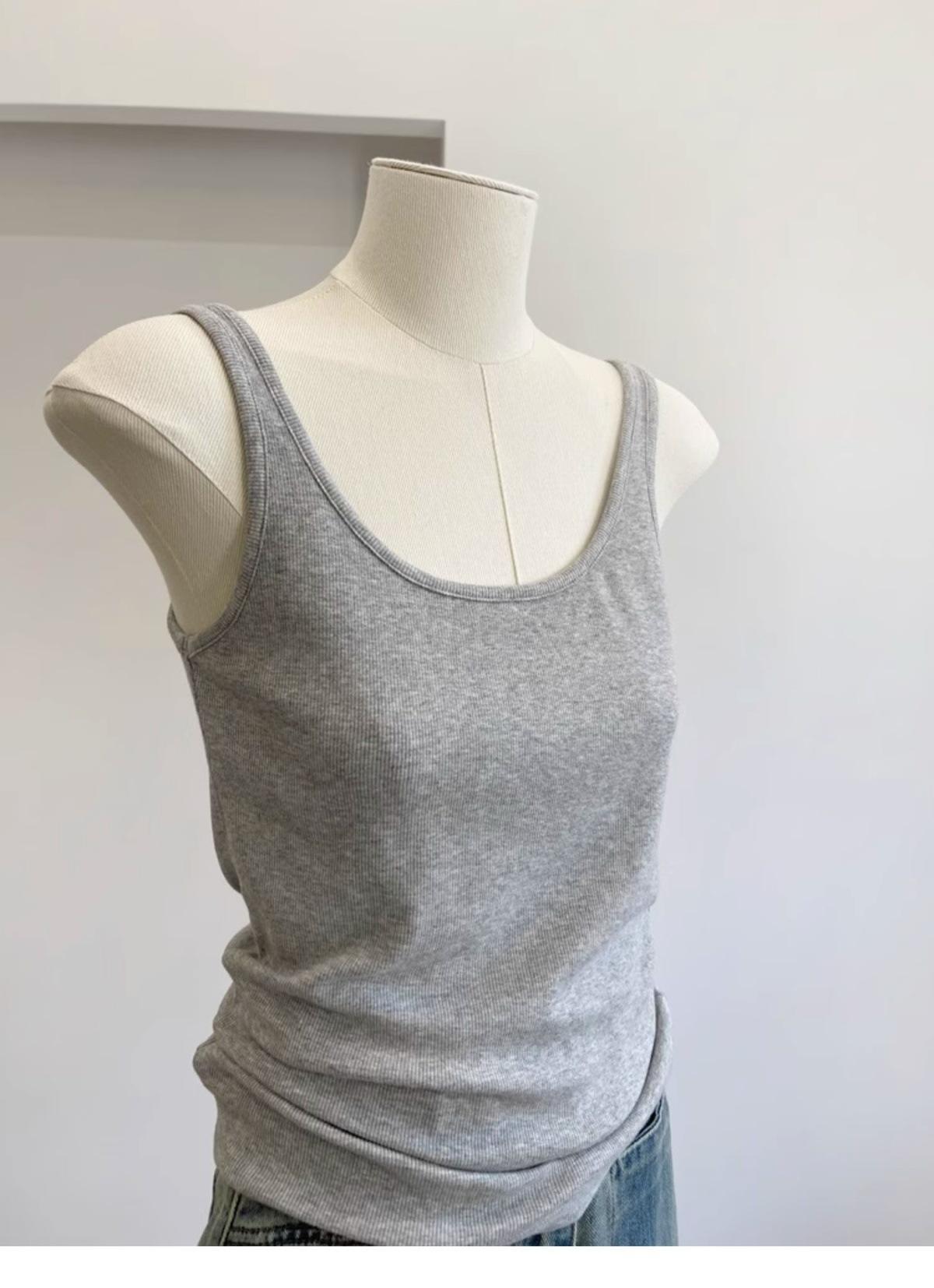 Camisola de Algodón Acanalado con Cuello en U Gris para Mujer, Verano Versión Coreana, Top Básico Blanco Adelgazante Versátil Sencillo sin Mangas