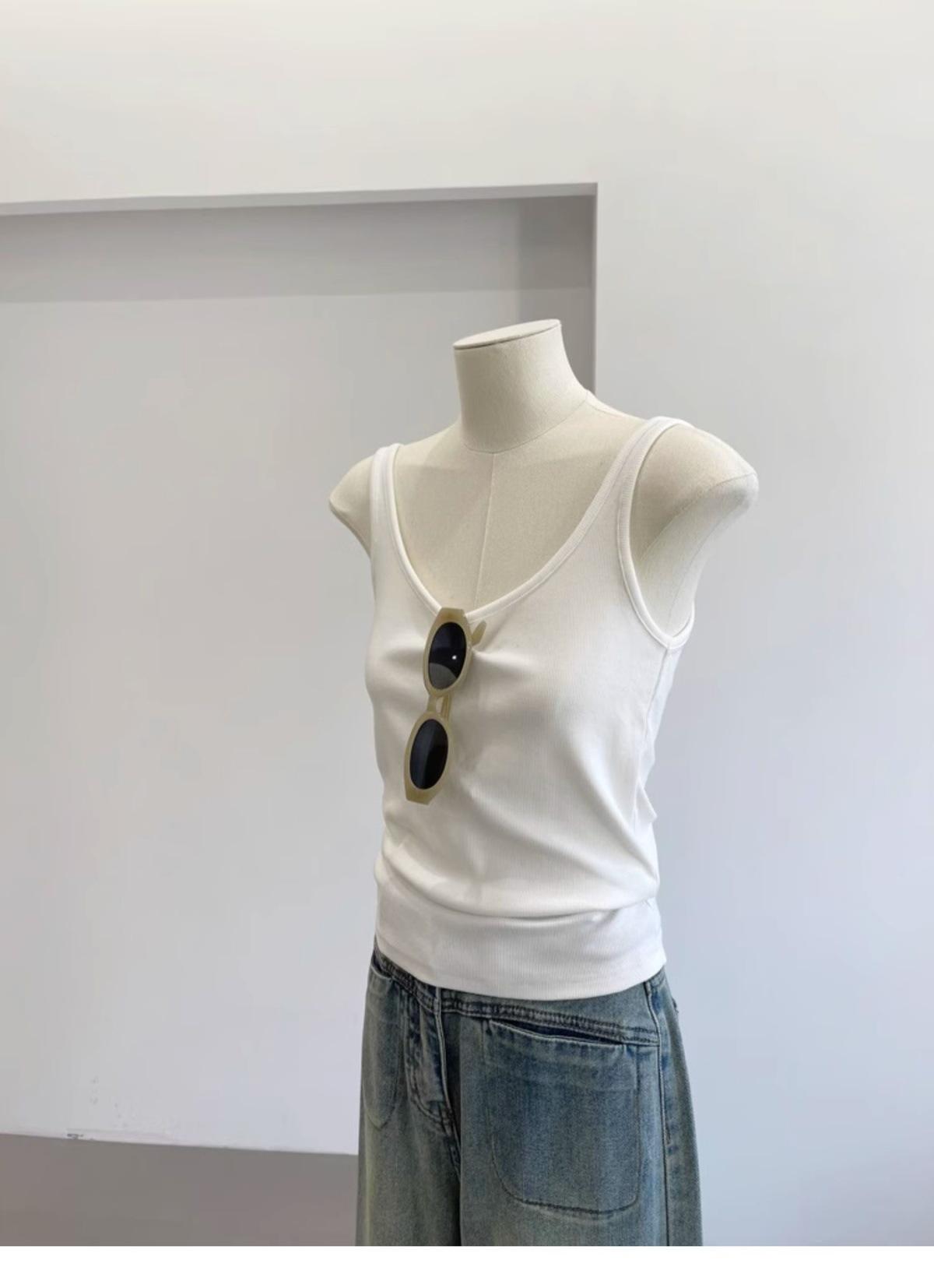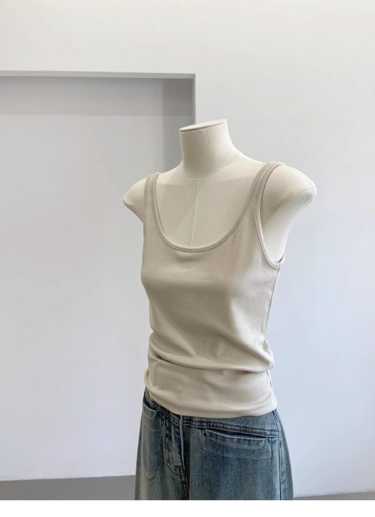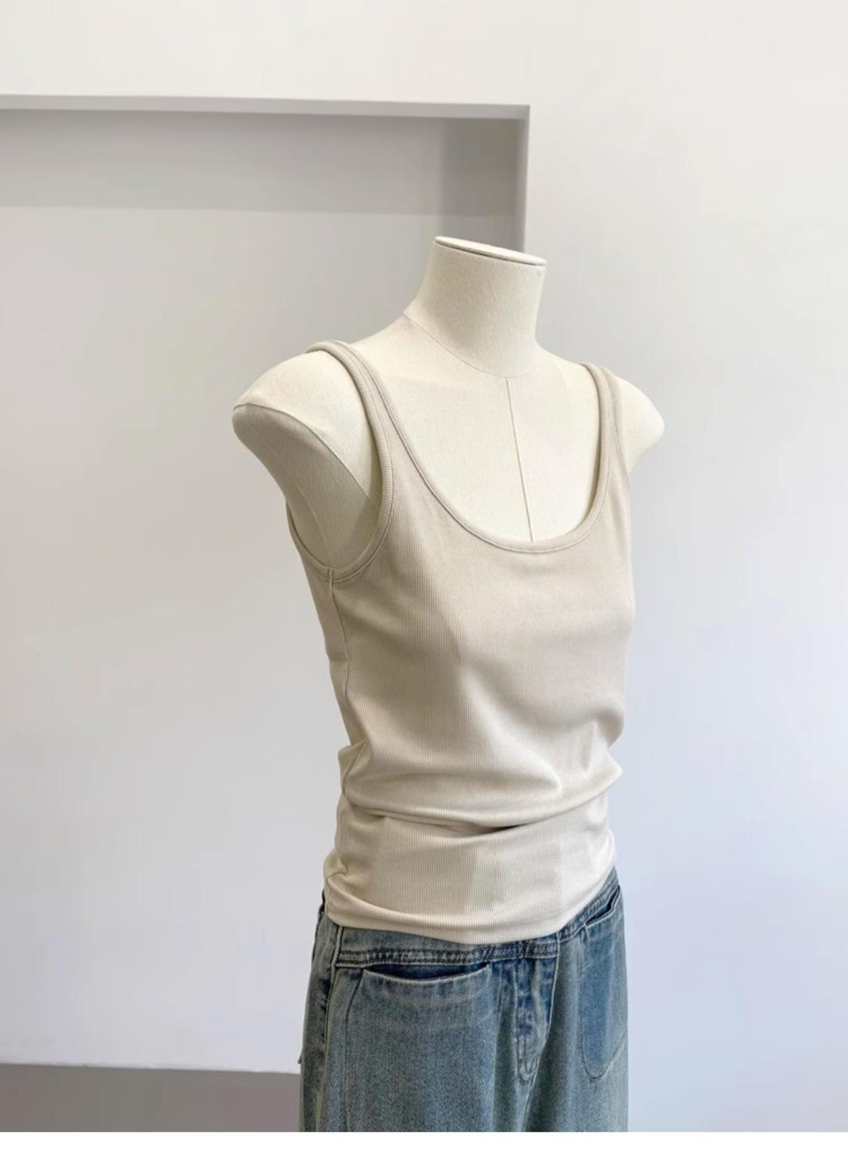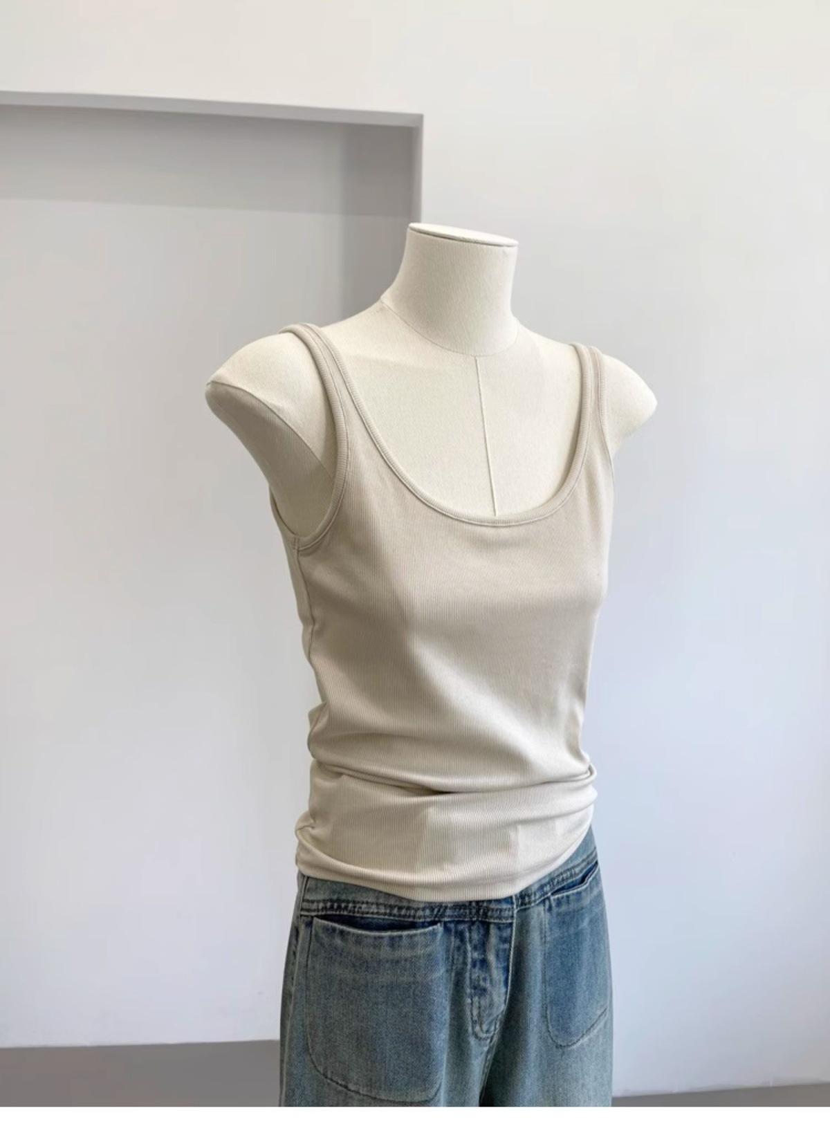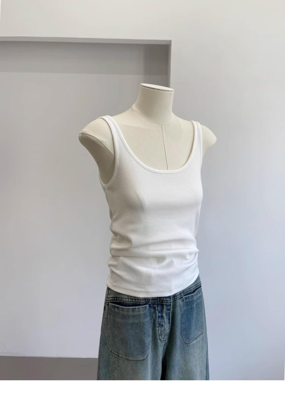 Camisola de Algodón Acanalado con Cuello en U Gris para Mujer, Verano Versión Coreana, Top Básico Blanco Adelgazante Versátil Sencillo sin Mangas